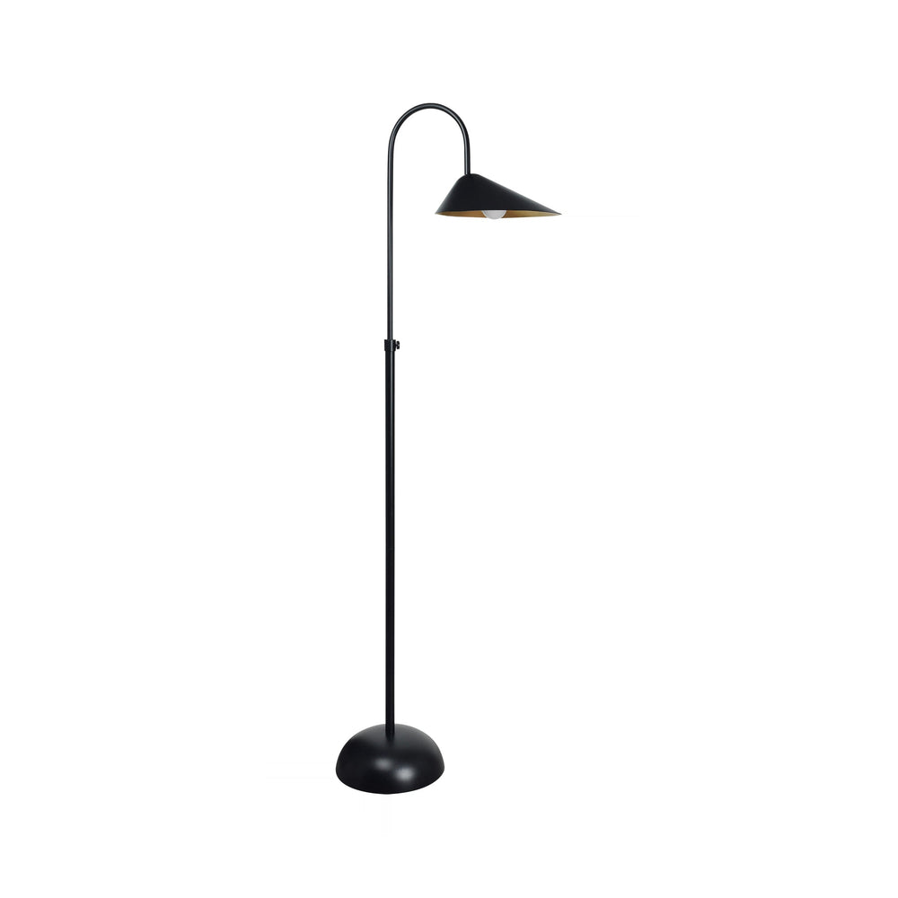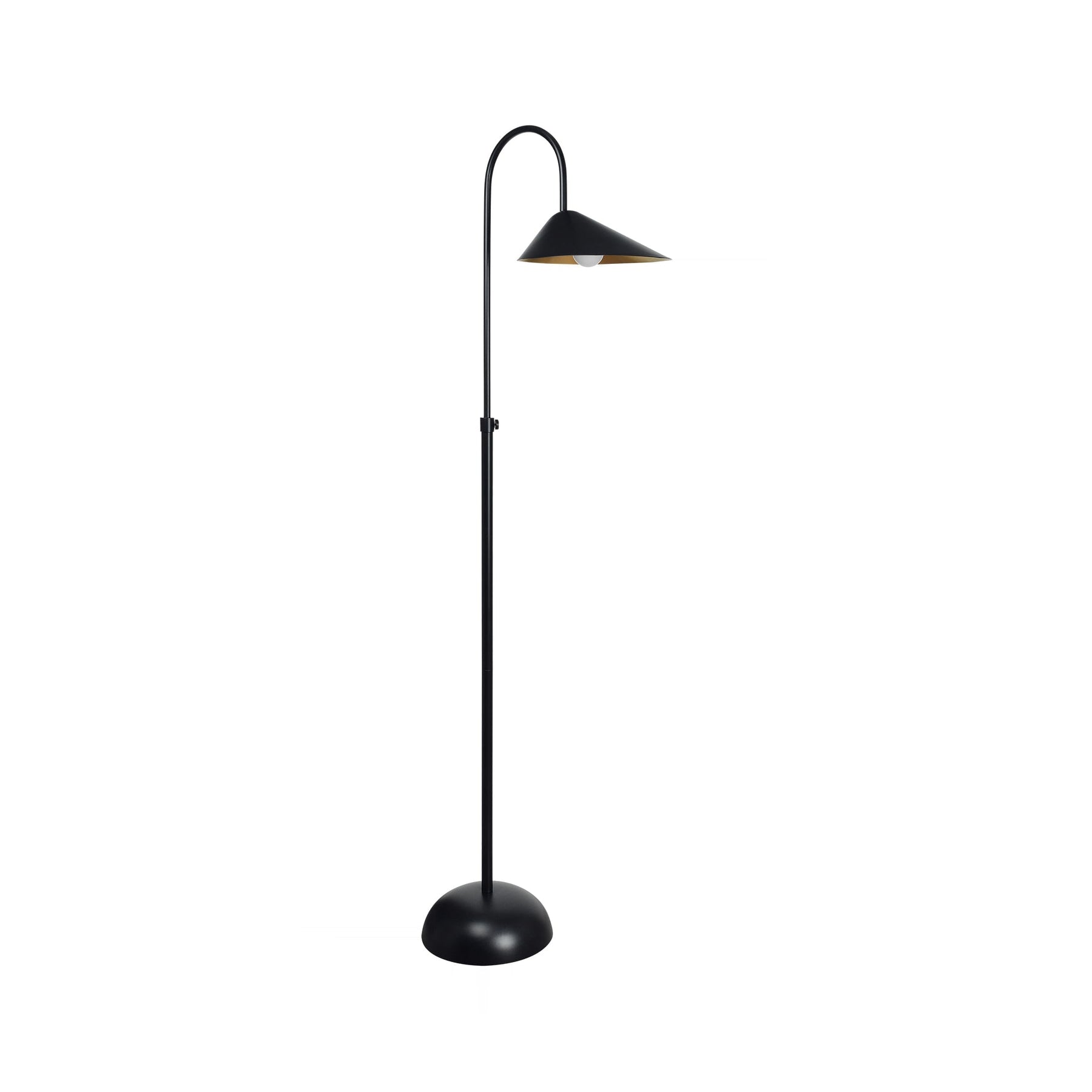 Sculptural arc and matte black finish define this lamp’s commanding, modern silhouette. The slender upright stand culminates in a gracefully curved neck, creating an architectural focal point that elevates any contemporary setting.