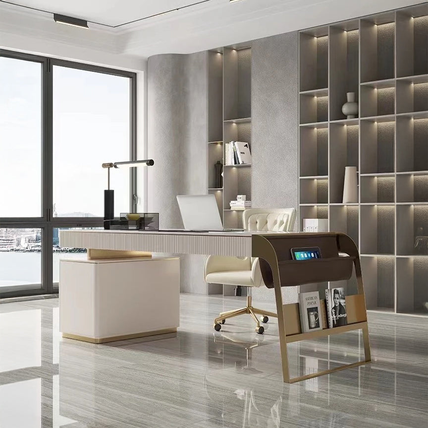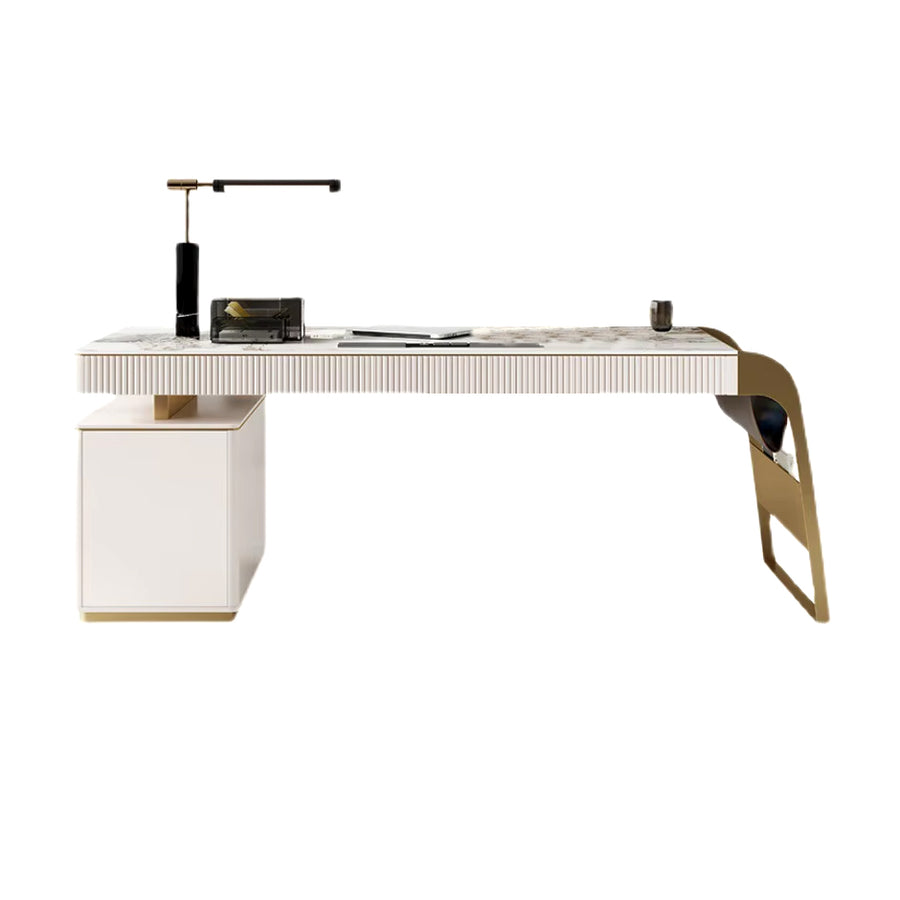 Elevate your workspace with this luxurious desk, featuring a pristine snow-white marble top paired with a sleek champagne gold metal frame. Designed for modern offices or consultation rooms, the light luxury aesthetic exudes elegance and professionalism. The fluted side panels and streamlined design make this desk a statement piece.