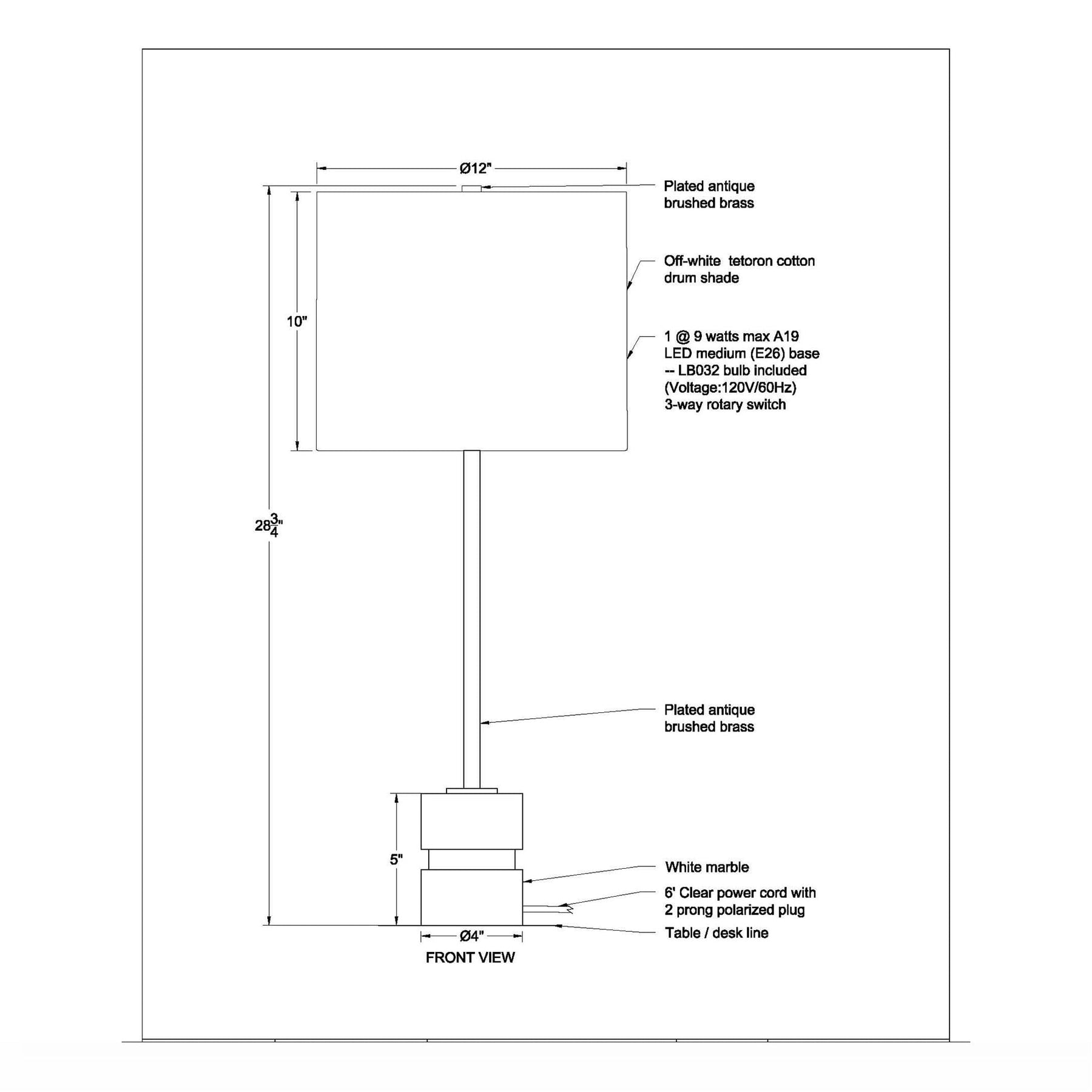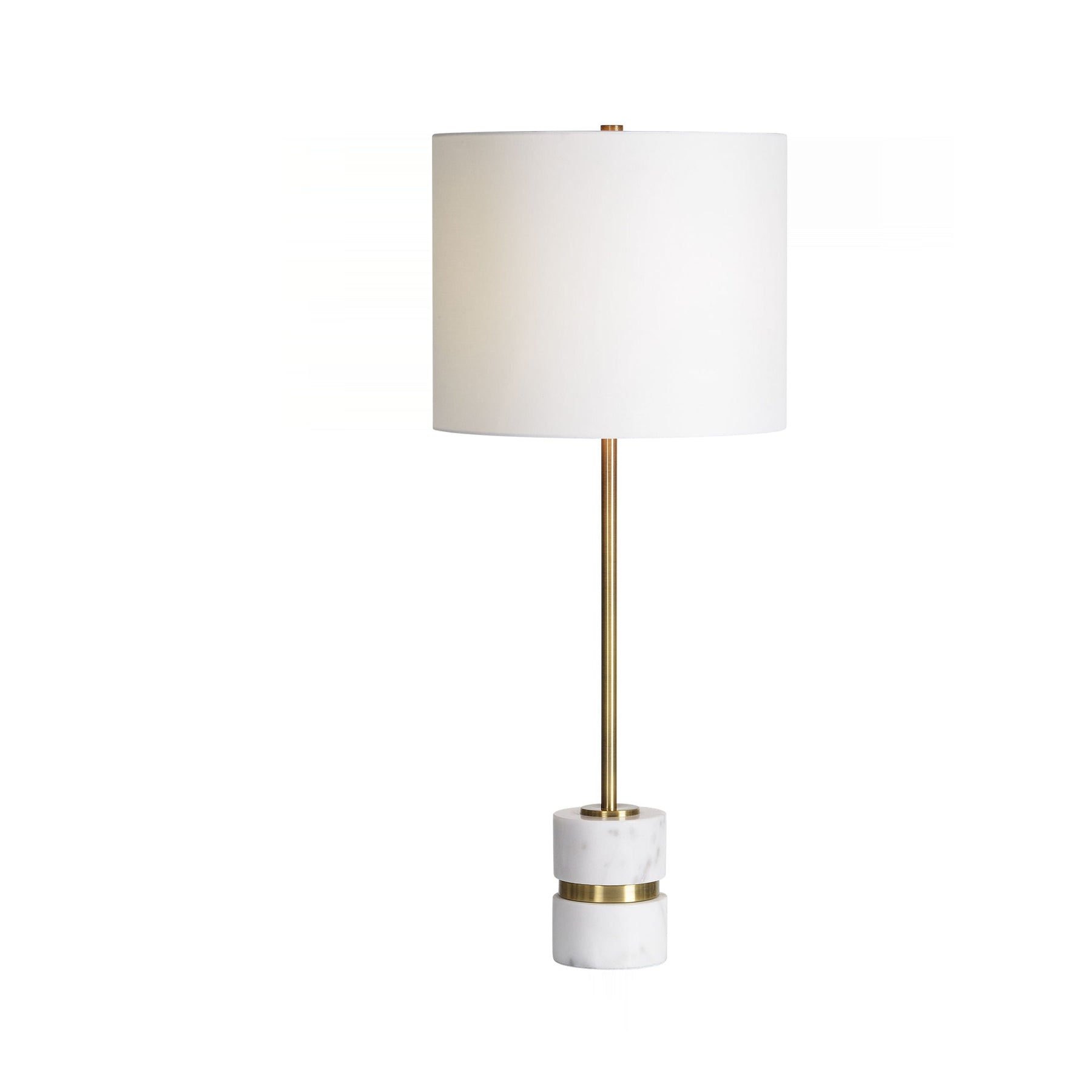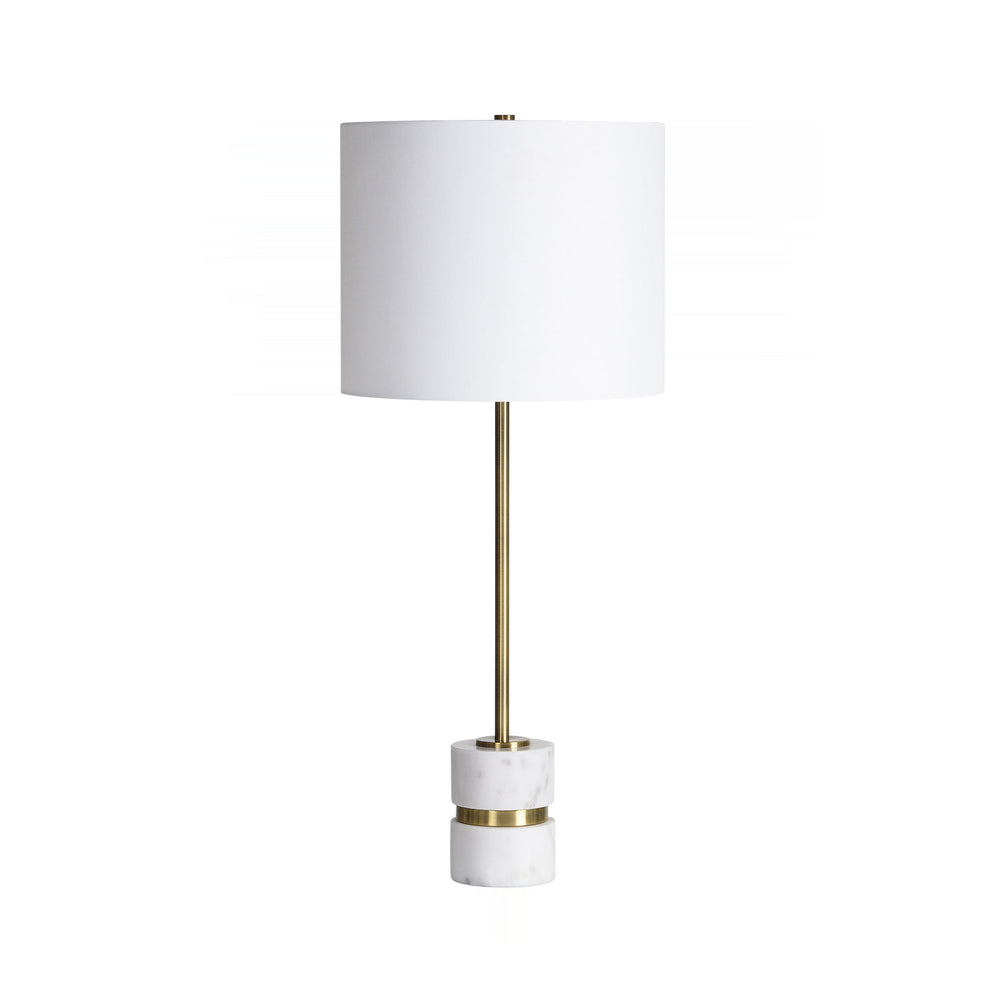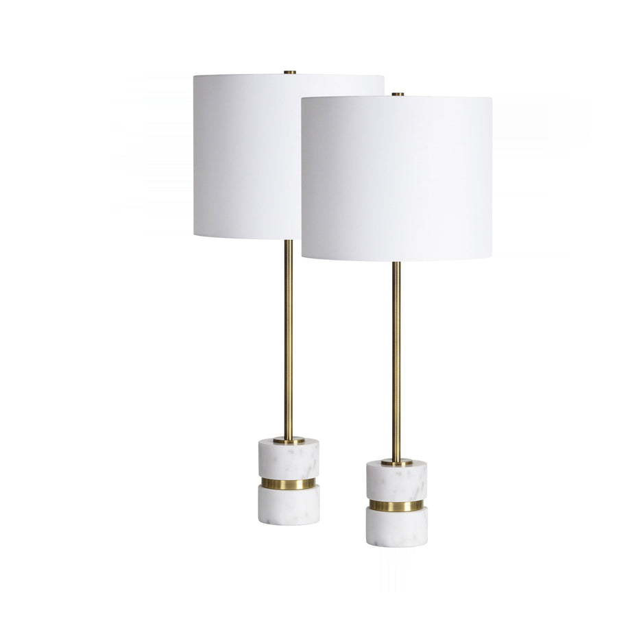 Stacked cylindrical marble bases anchor these commanding table lamps, rising into slender antique brushed brass stems. This juxtaposition of cool, veined stone and warm, refined metal creates immediate architectural interest and high-end polish.