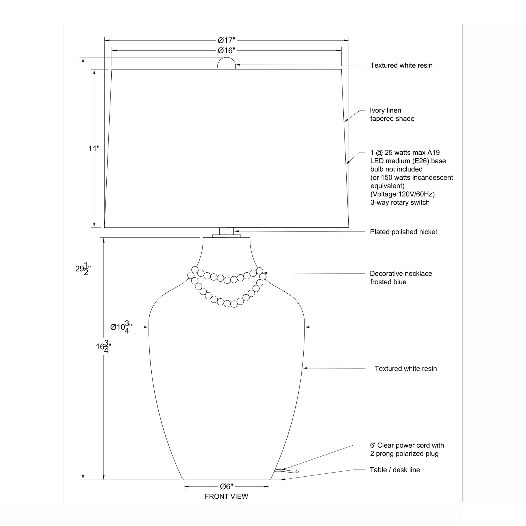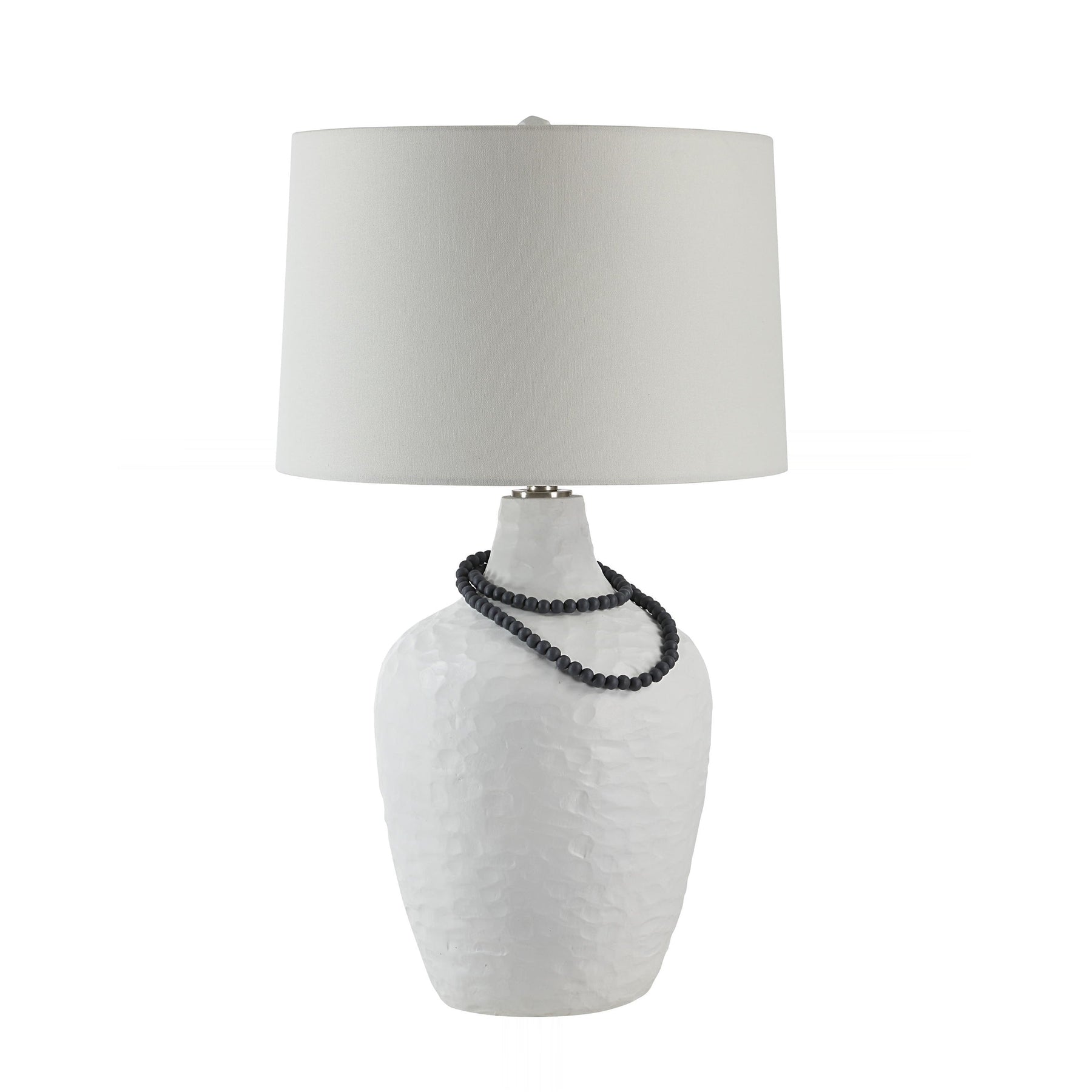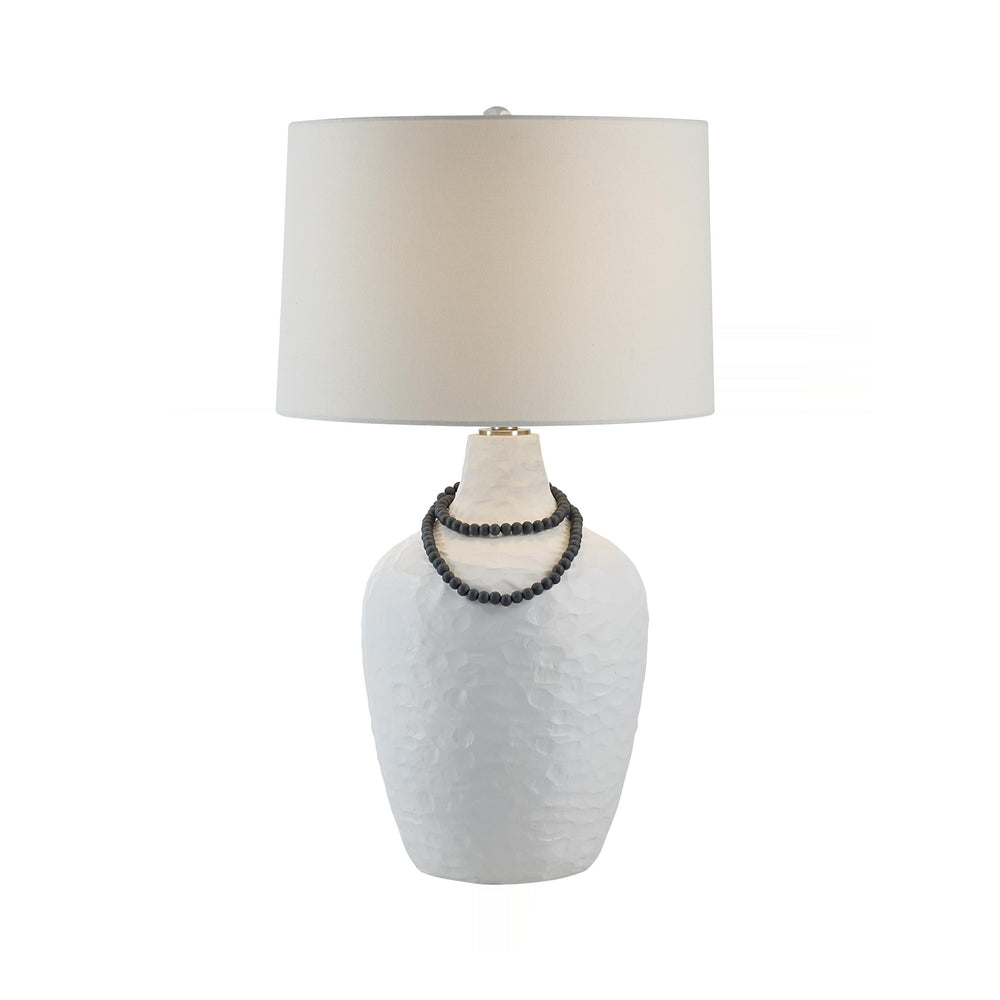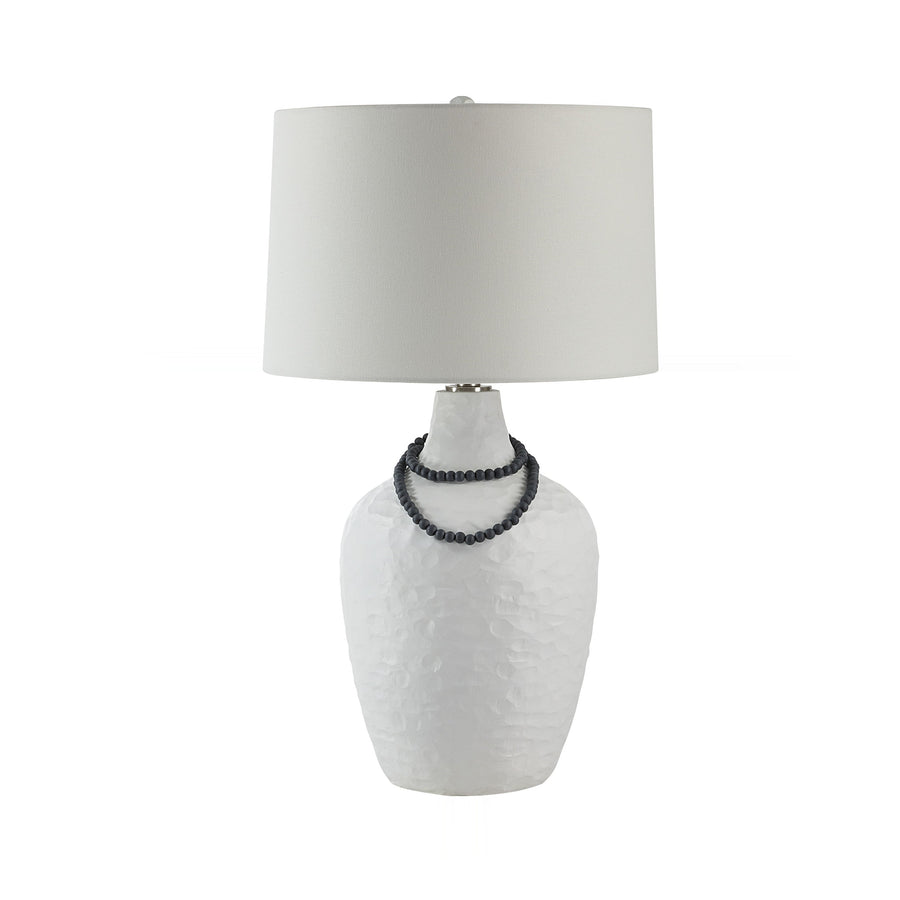 Textured white ceramic forms a substantial, sculpted silhouette, contrasting beautifully with the stark, clean lines of the crisp linen shade. This statement piece is playfully accented by a draped strand of dark, matte beads offering unexpected, fashion-forward elegance.