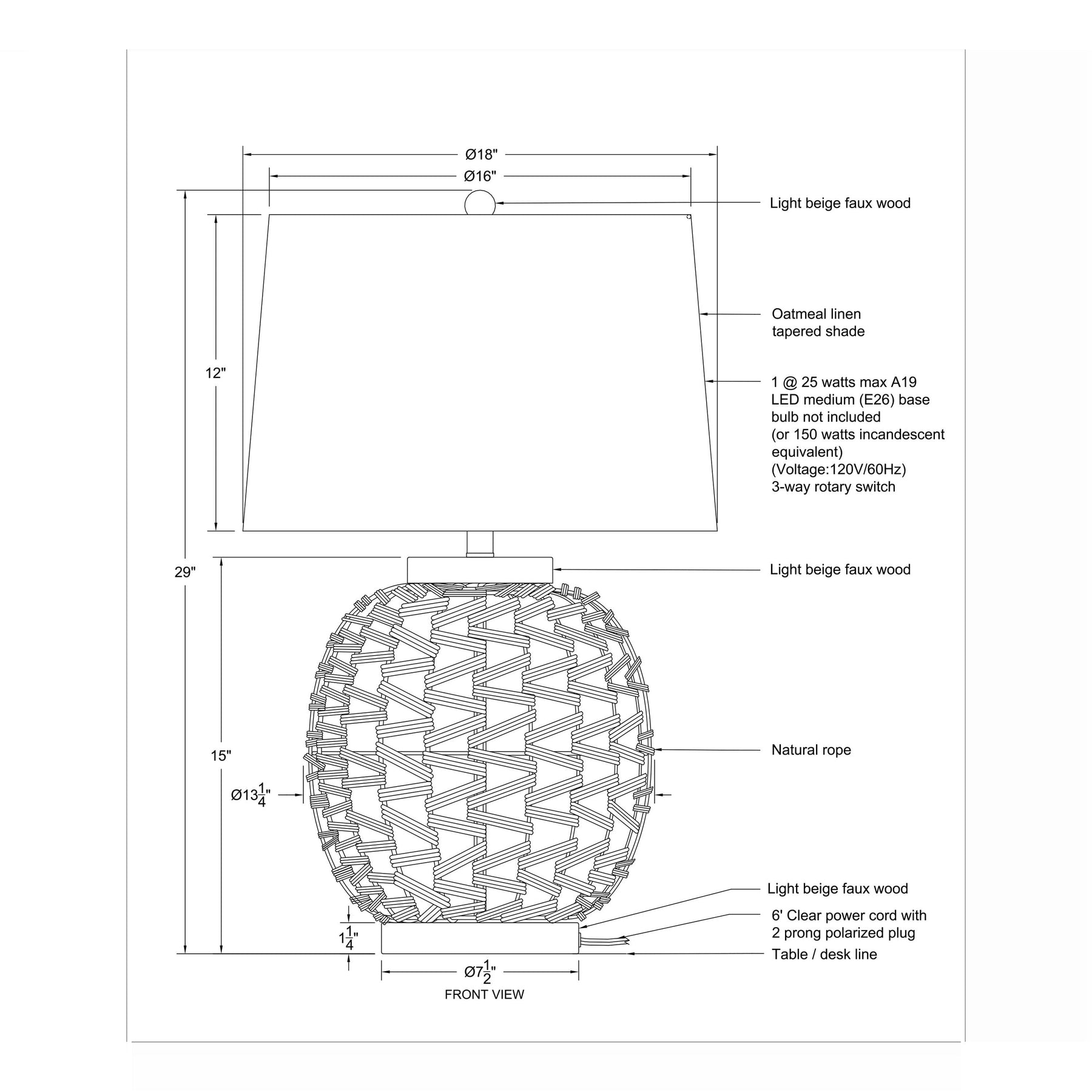 An oatmeal linen drum shade diffuses light softly, creating a warm, inviting glow. Utilize the versatile 3-way switch to effortlessly tailor the luminosity, setting the perfect relaxed ambiance morning or evening.