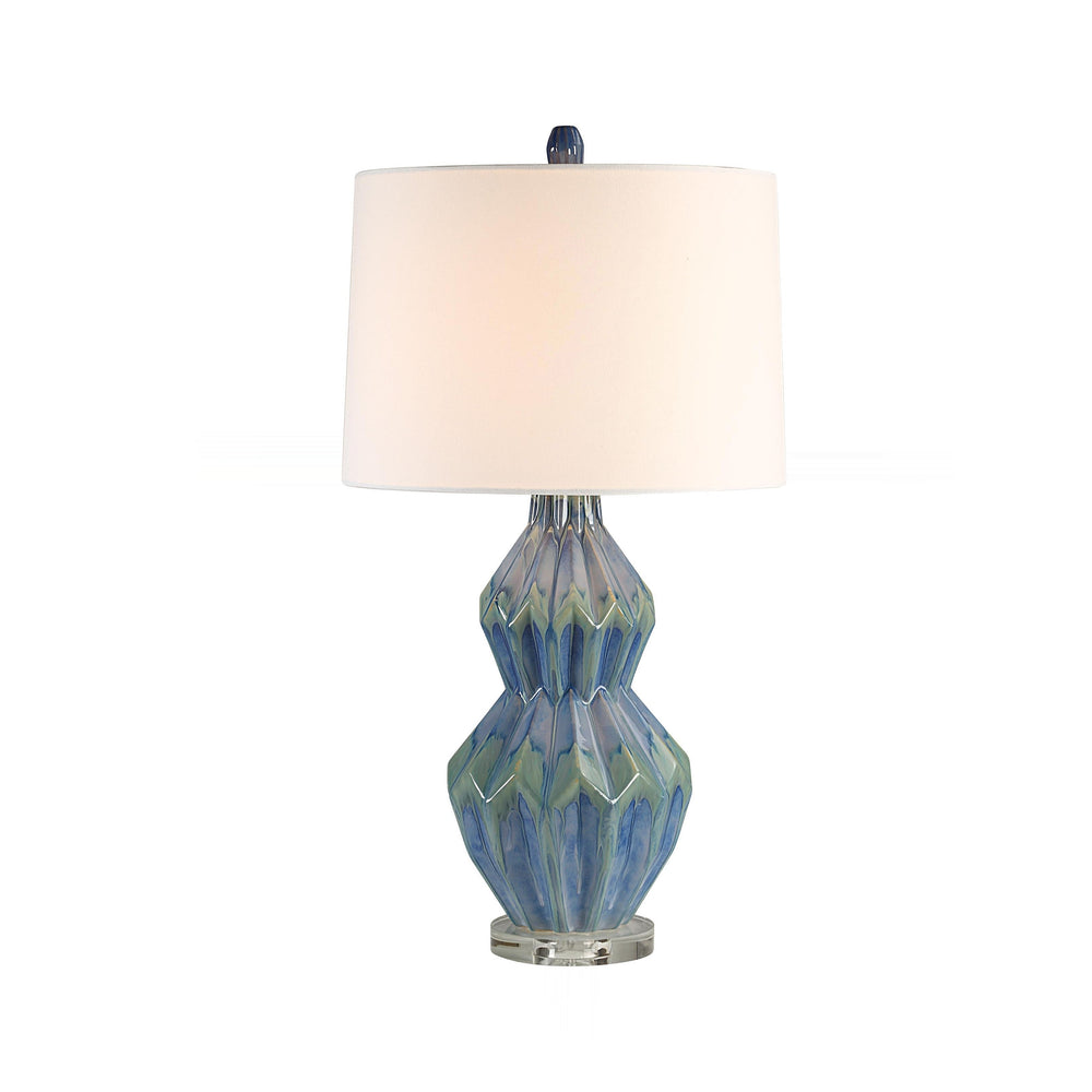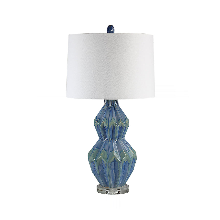 Artistic ceramic body captivates with a dynamic, faceted silhouette and a rich turquoise glaze that pools with subtle aquatic variation. Crystal-clear accents anchor the sculptural base, adding a sophisticated, light-catching shimmer to the overall form.