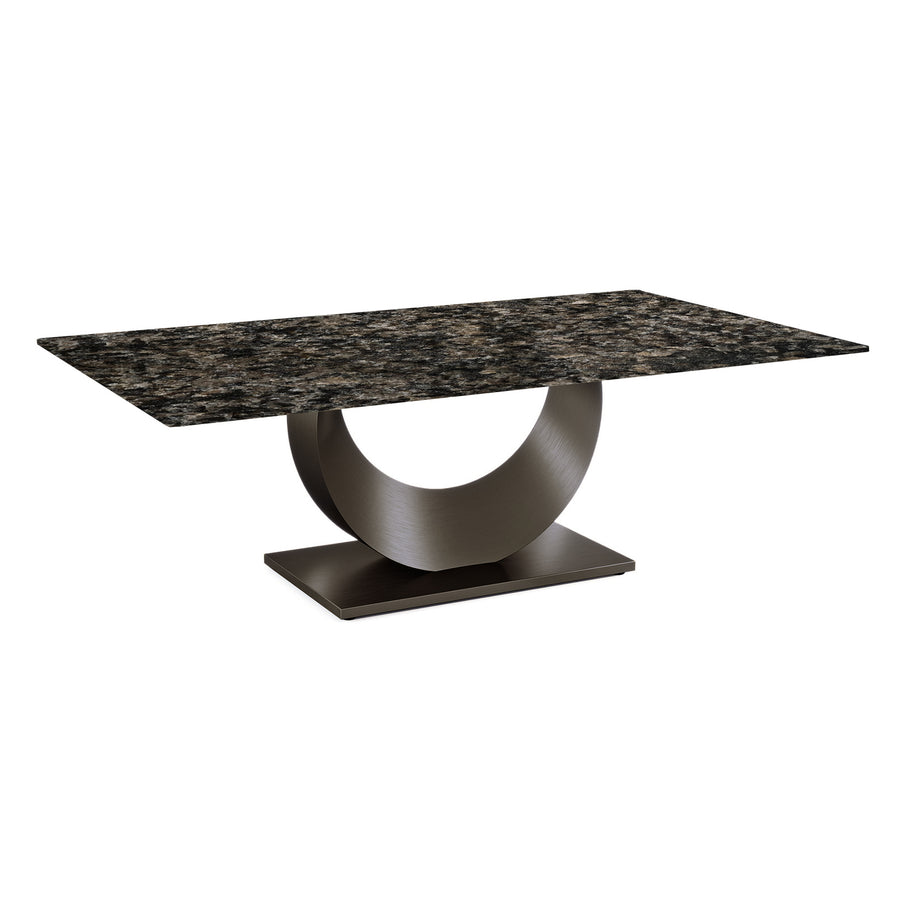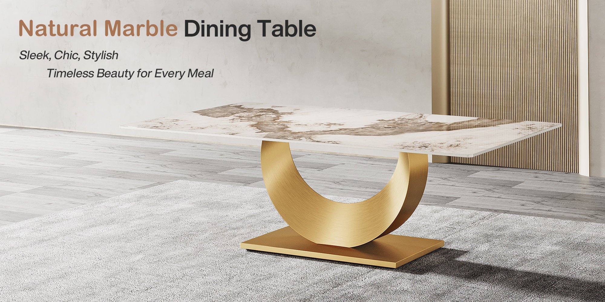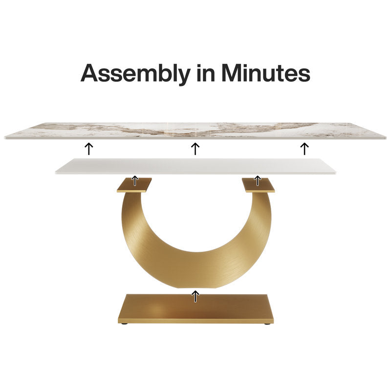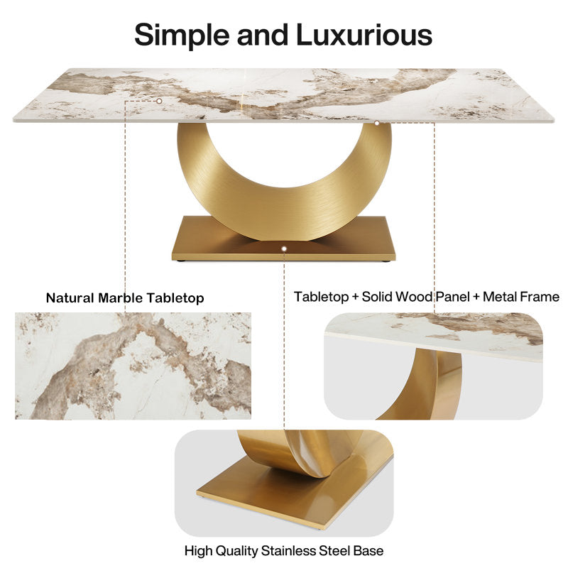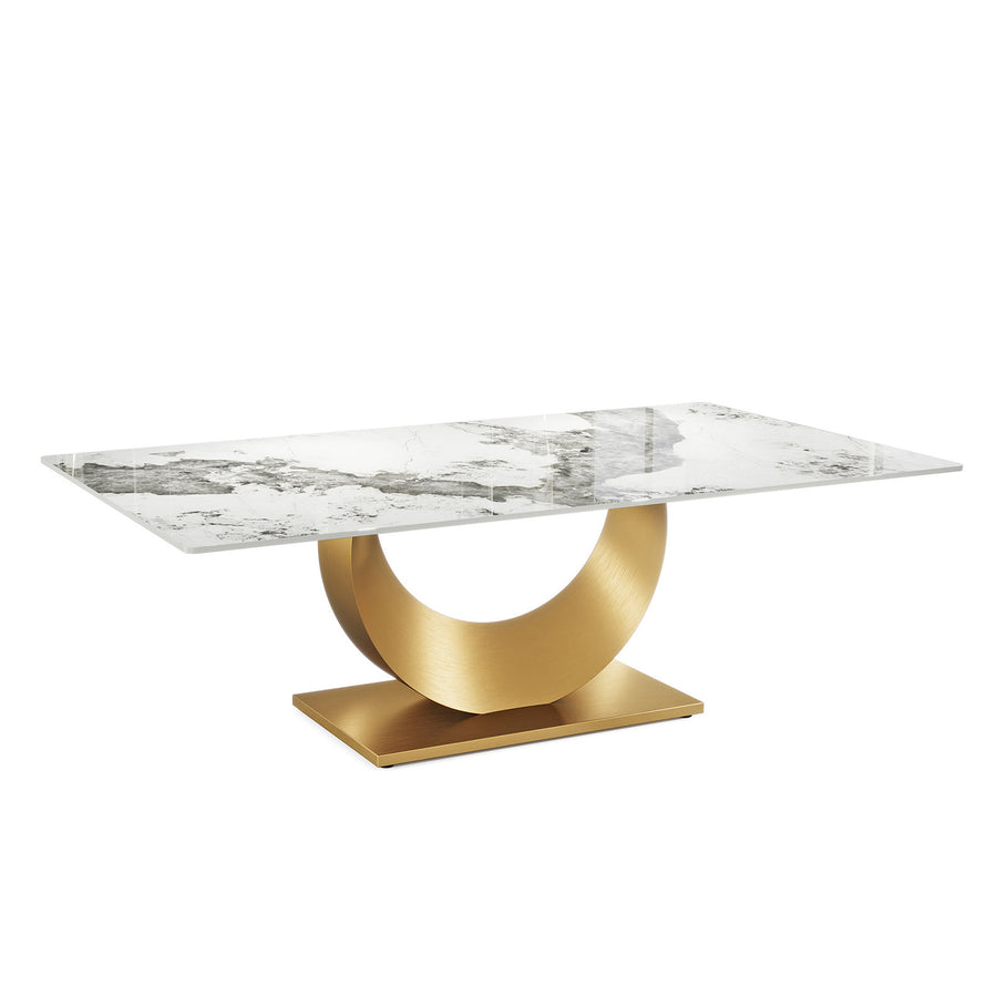 Elevate your dining experience with this luxurious rectangular table, boasting a captivating blend of a polished marble top and an opulent golden base. The unique U-shaped pedestal not only provides excellent stability but also adds a touch of modern sophistication to any dining room. Perfect for both contemporary and classic interiors, this table is designed to be the stunning centerpiece of your home.