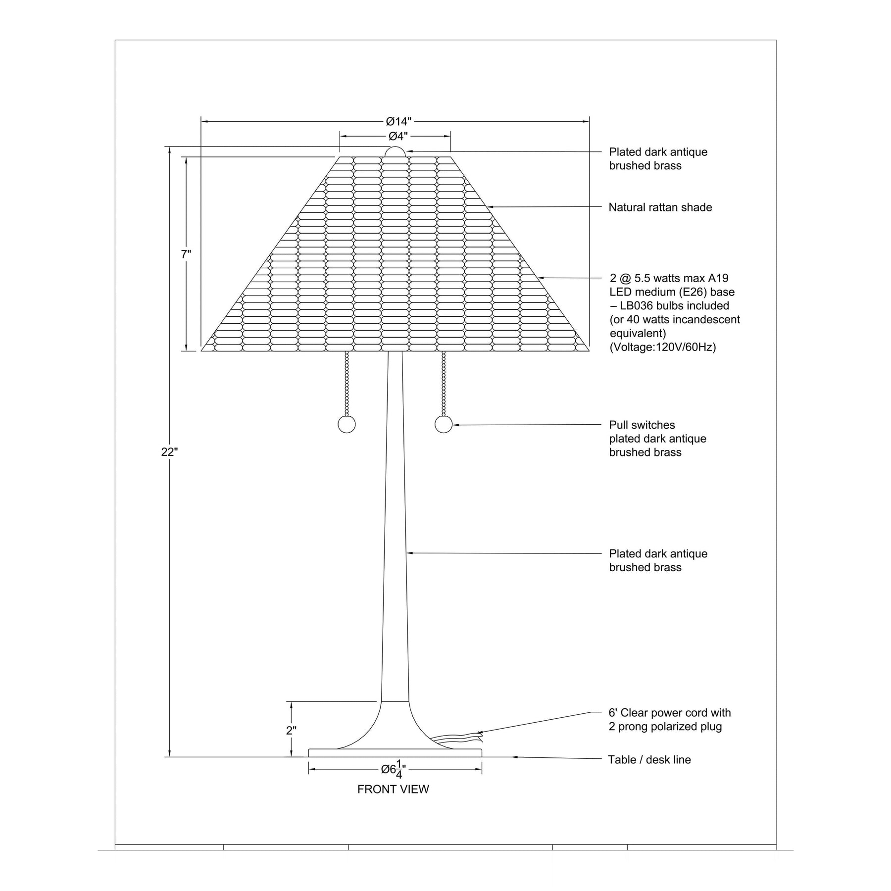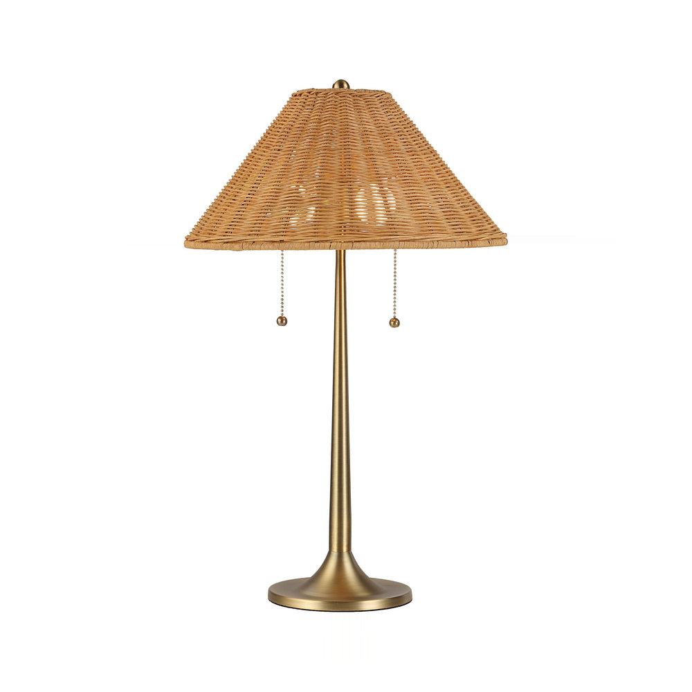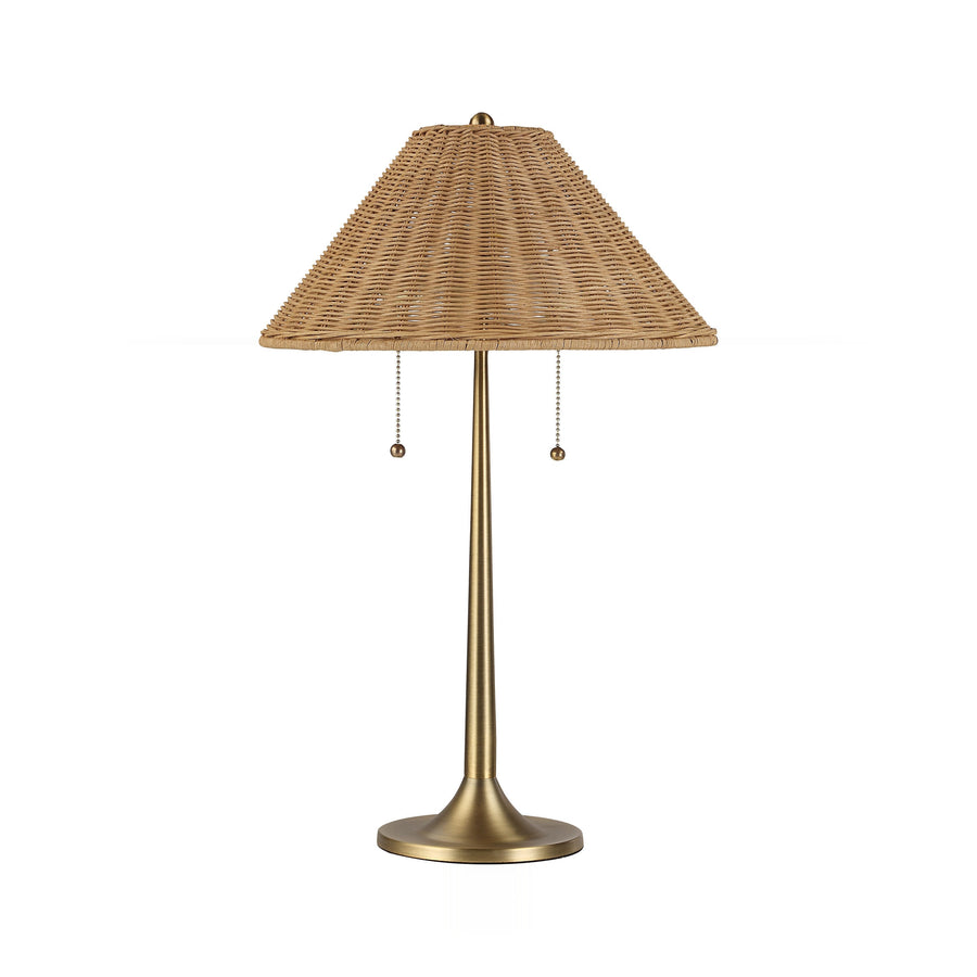 Natural woven rattan forms a textural, conical shade, casting a beautifully diffused, ambient light across the room. This classic silhouette is anchored by a sleek, dark antique brushed brass column and subtly flared pedestal base.