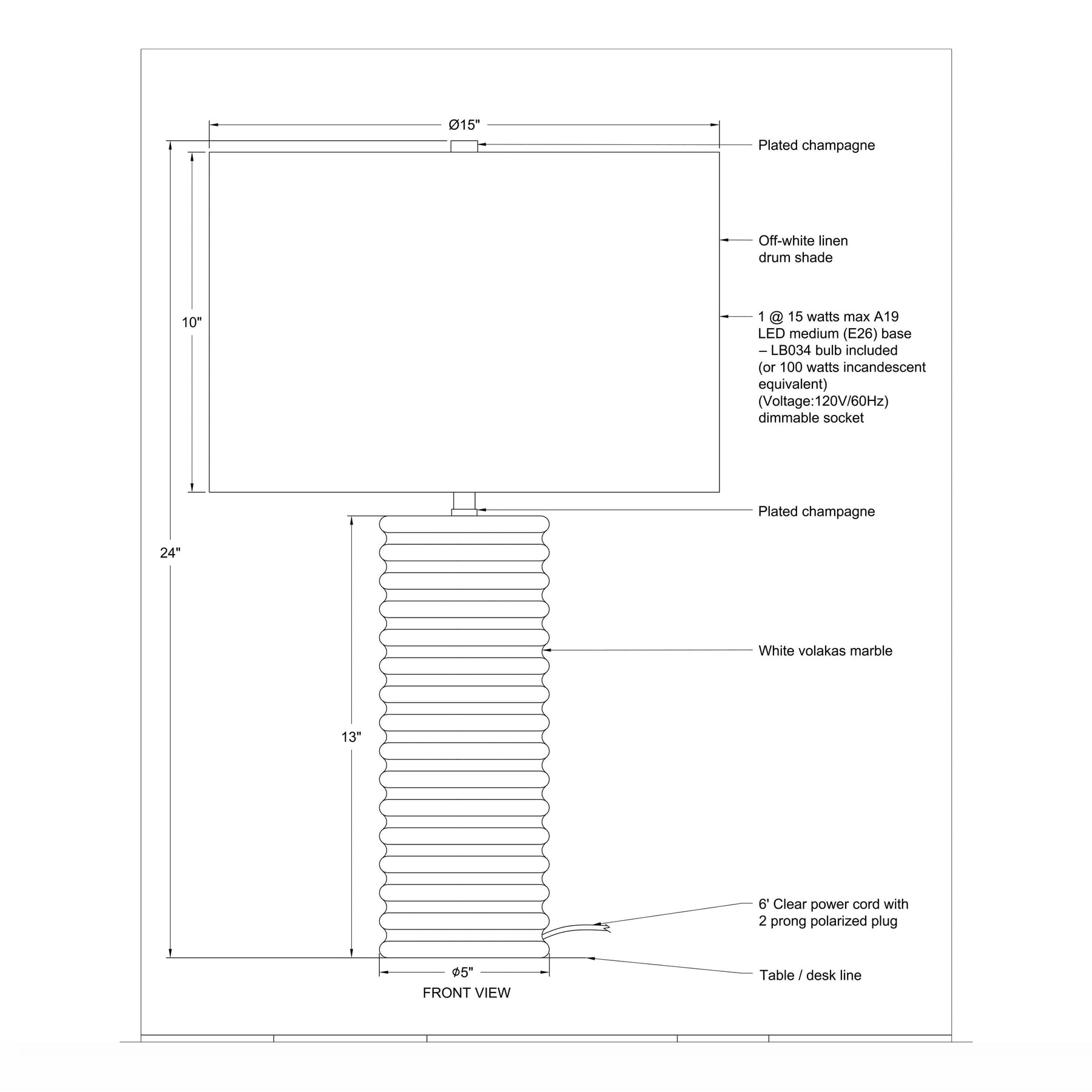 Champagne-plated accents crown this substantial stone form, perfectly complemented by a soft, off-white linen drum shade for diffused, dimmable ambiance in refined spaces.