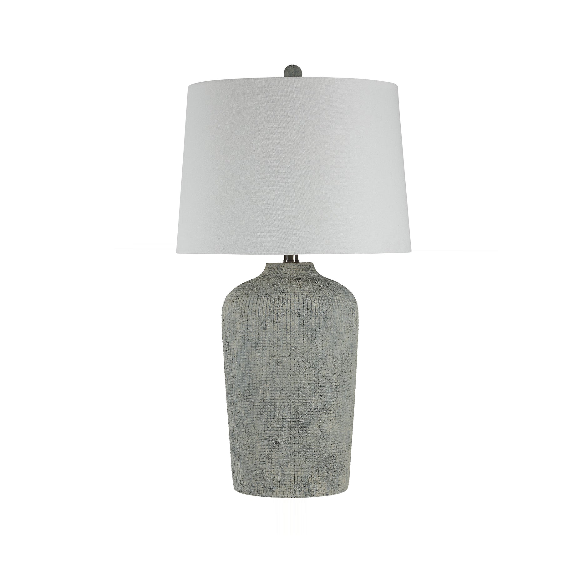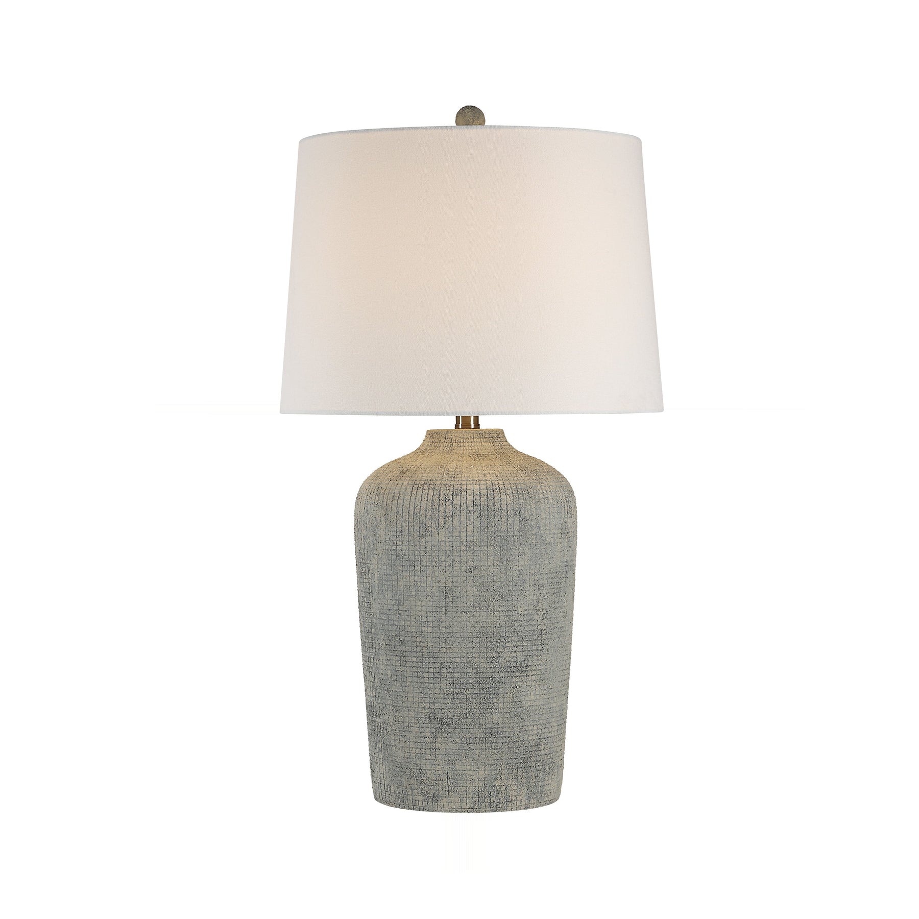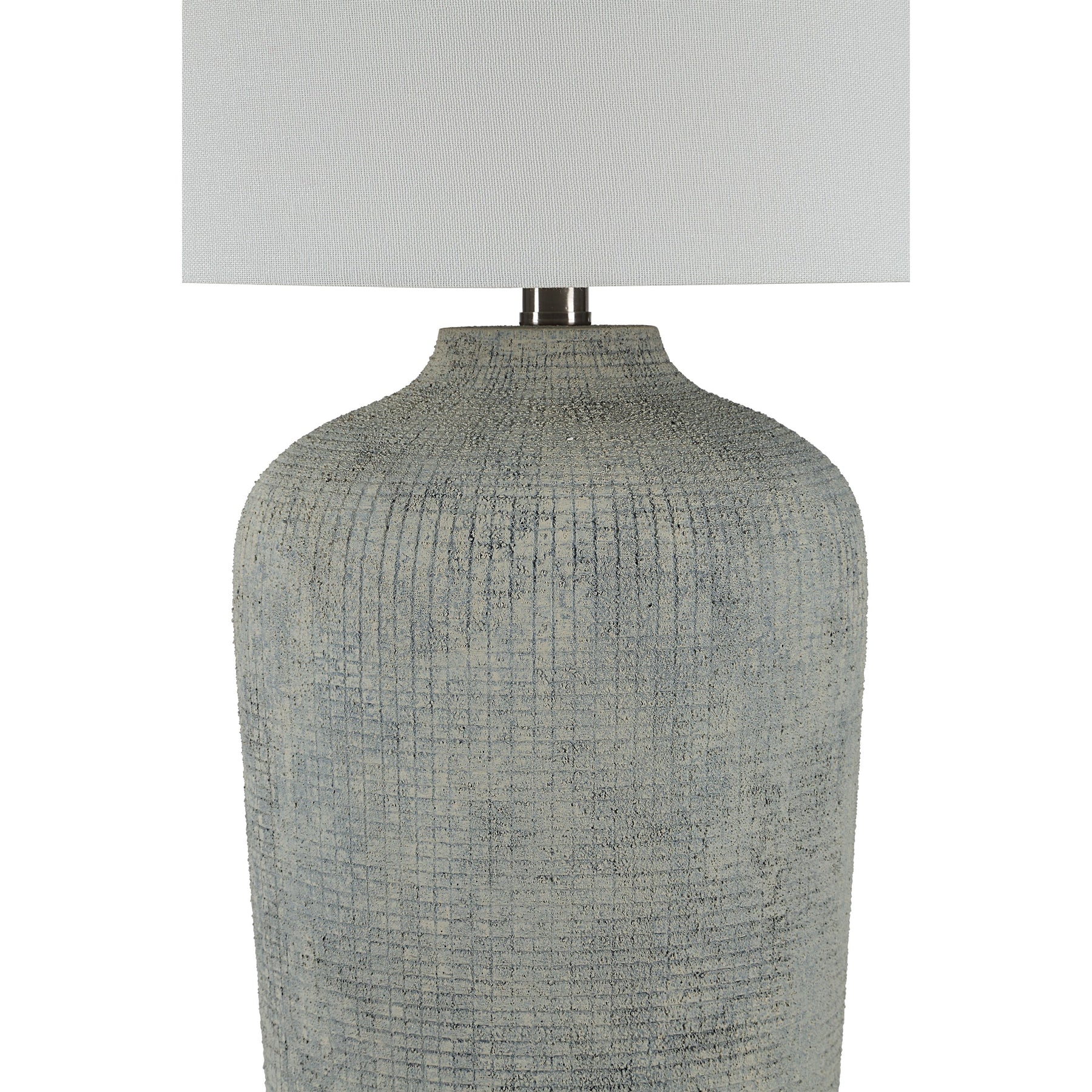 Subtle pewter fittings crown the base, leading up to an off-white linen drum shade that casts a soft, diffused ambient glow. This fixture harmonizes effortlessly, lending curated warmth to both contemporary and classic interiors.