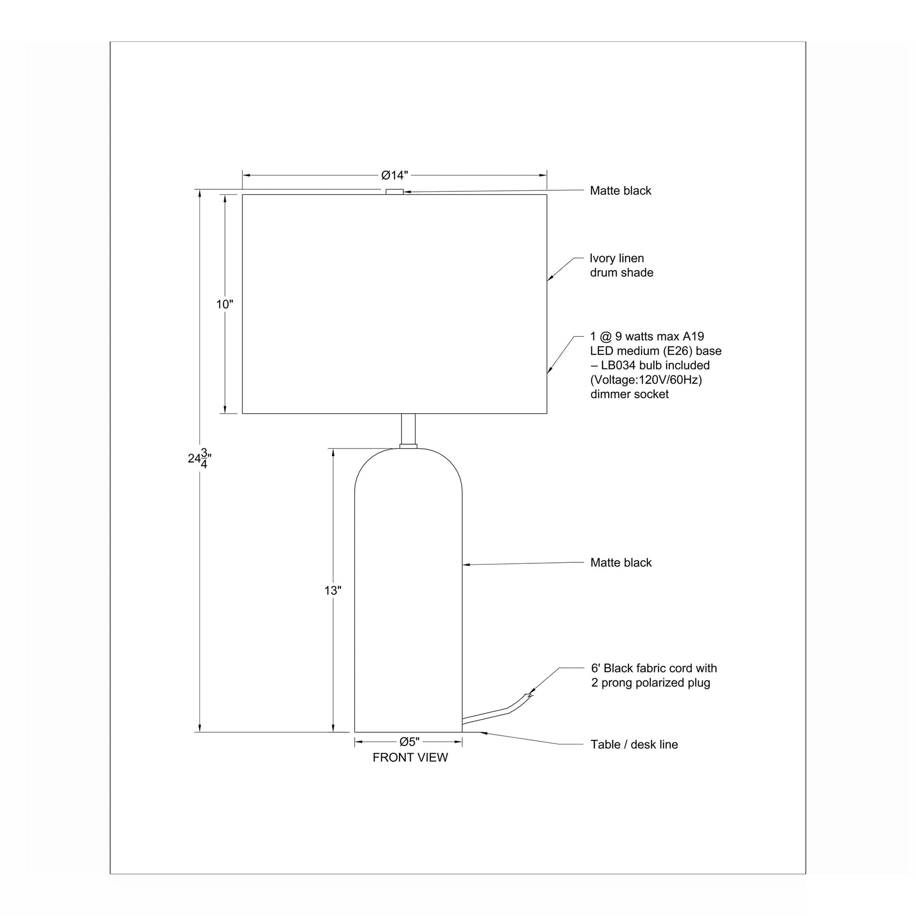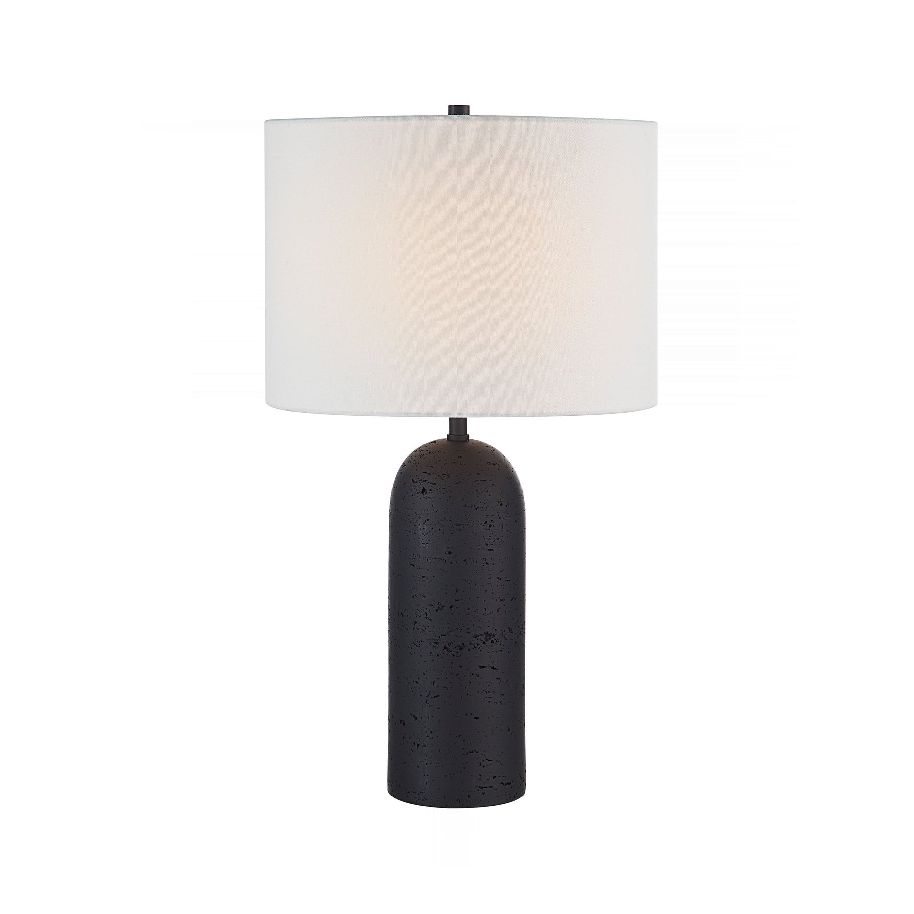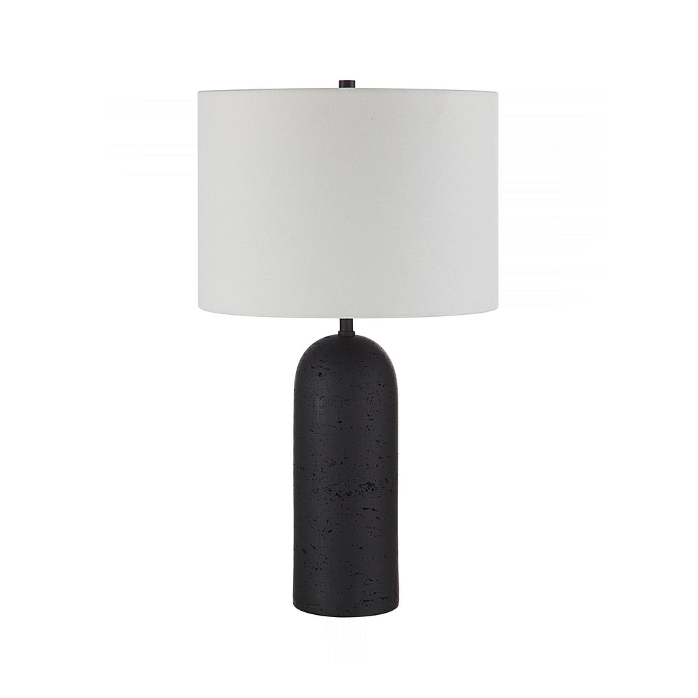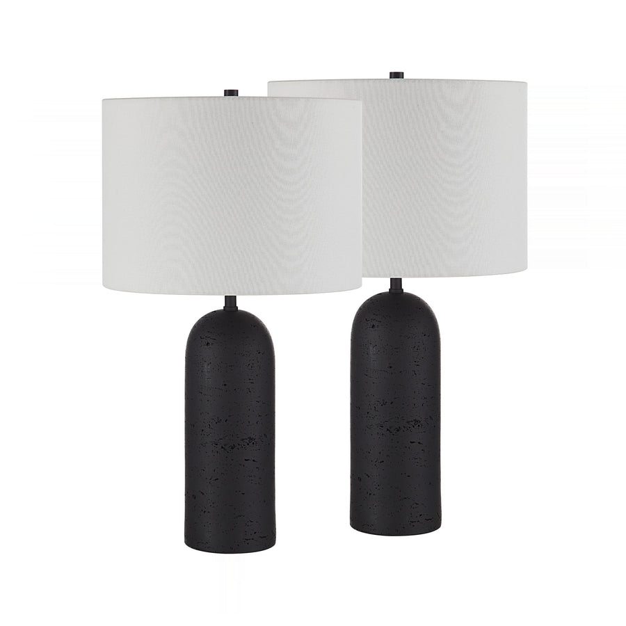 Sculptural black resin bases feature a textured, cylindrical silhouette providing weighty, modern anchor points. A crisp, off-white linen drum shade diffuses illumination into a soft, welcoming glow perfect for ambient settings.