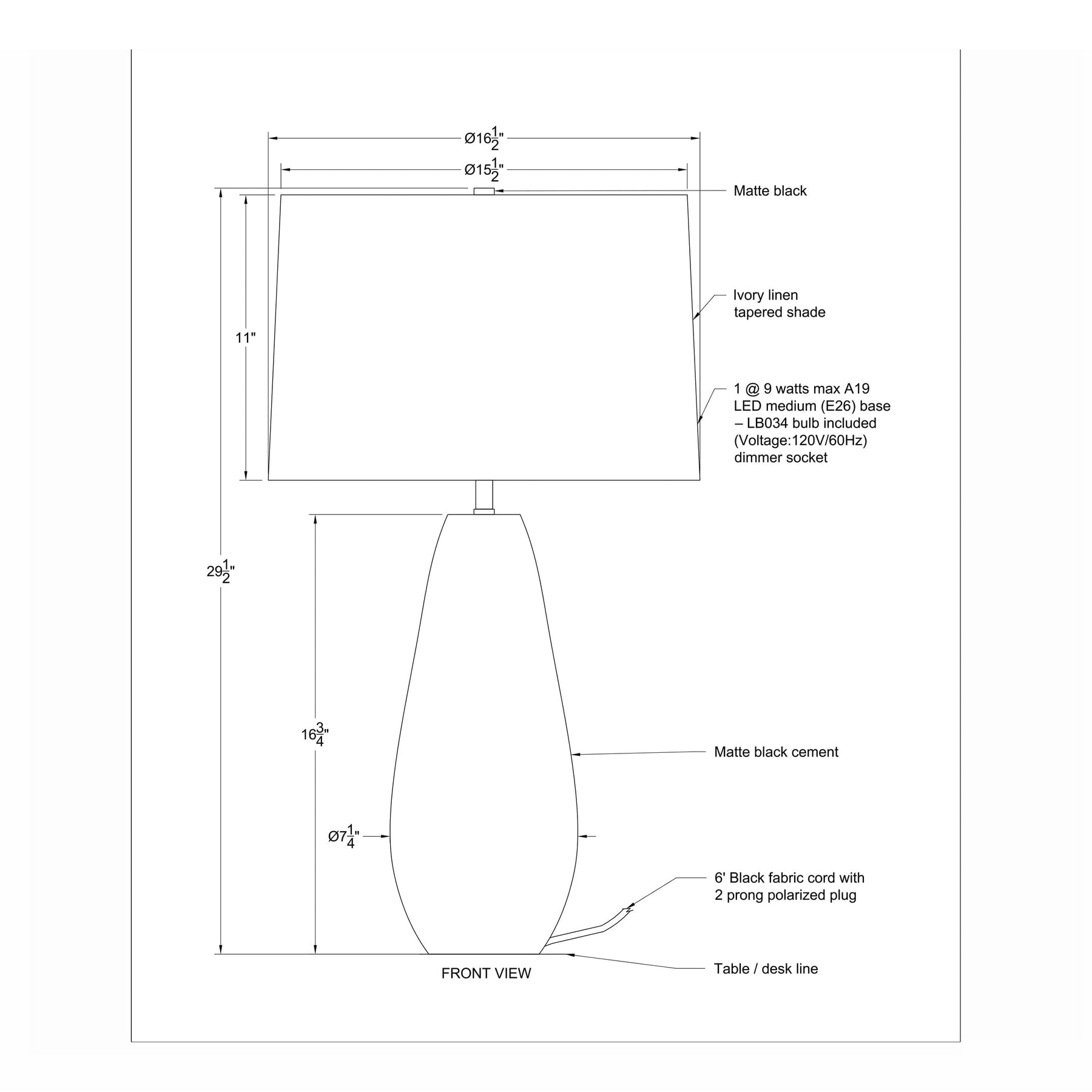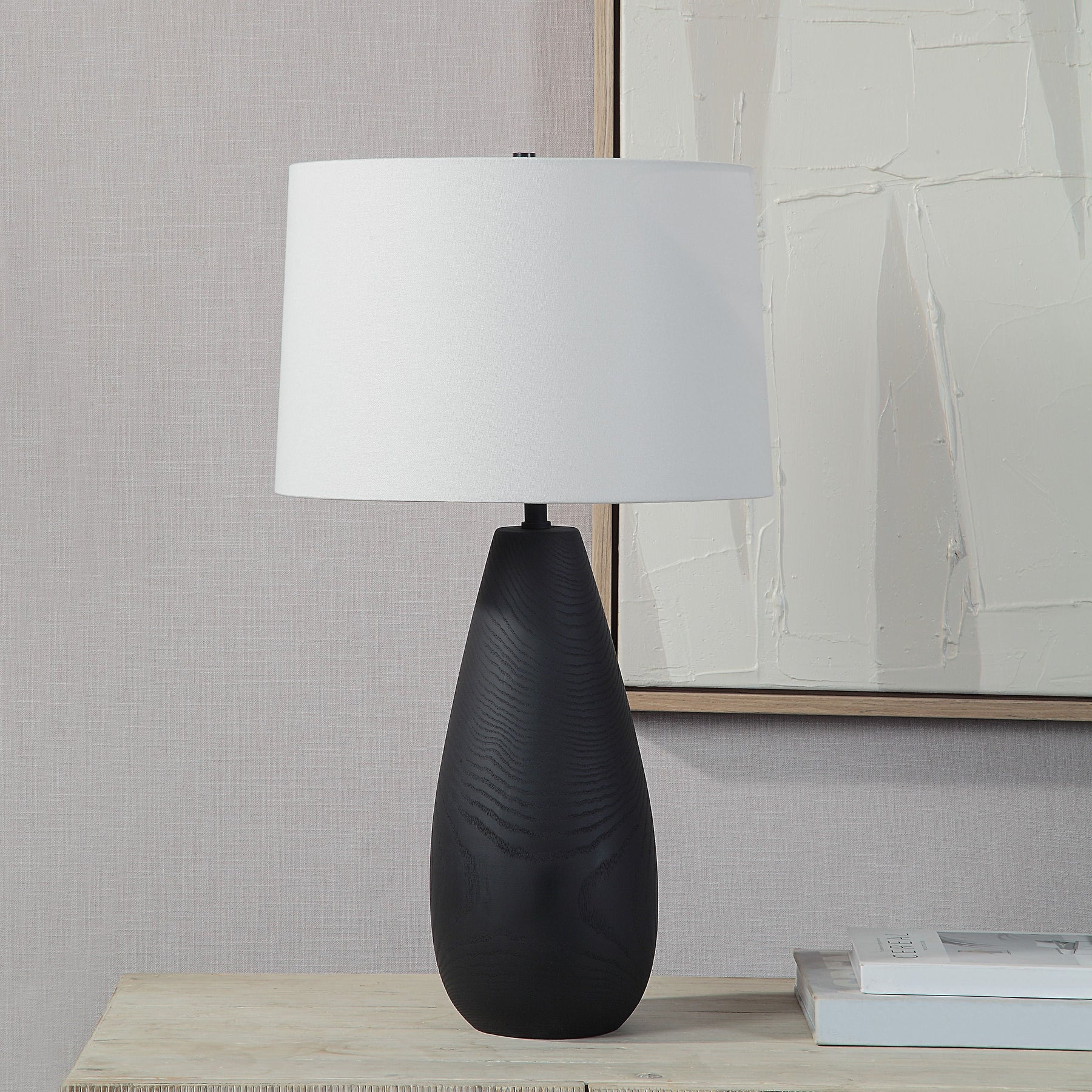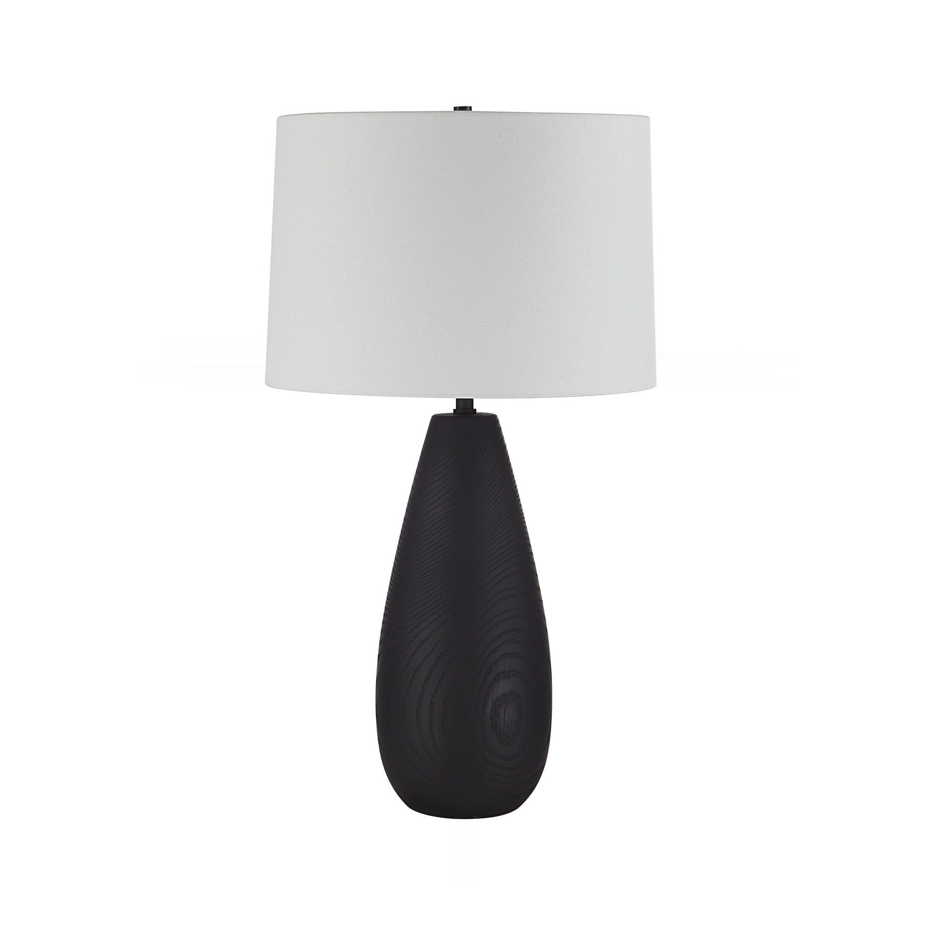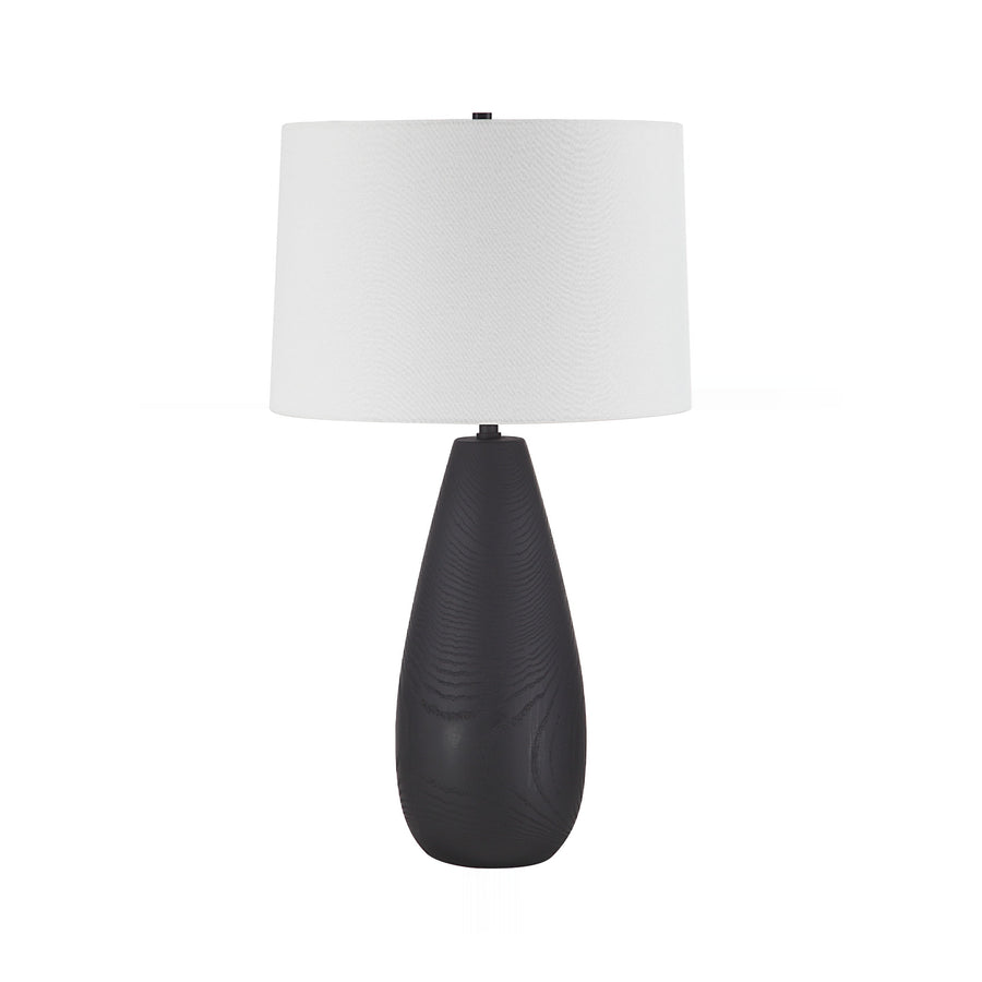 Sculptural teardrop base finished in deep matte black wood grain provides organic grounding for the crisp, tapered linen drum shade. This striking silhouette introduces sophisticated, modern contrast to any console or bedside surface.