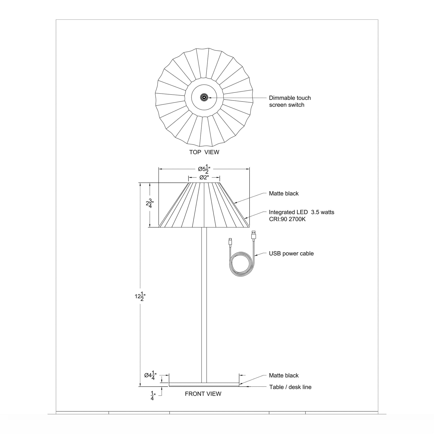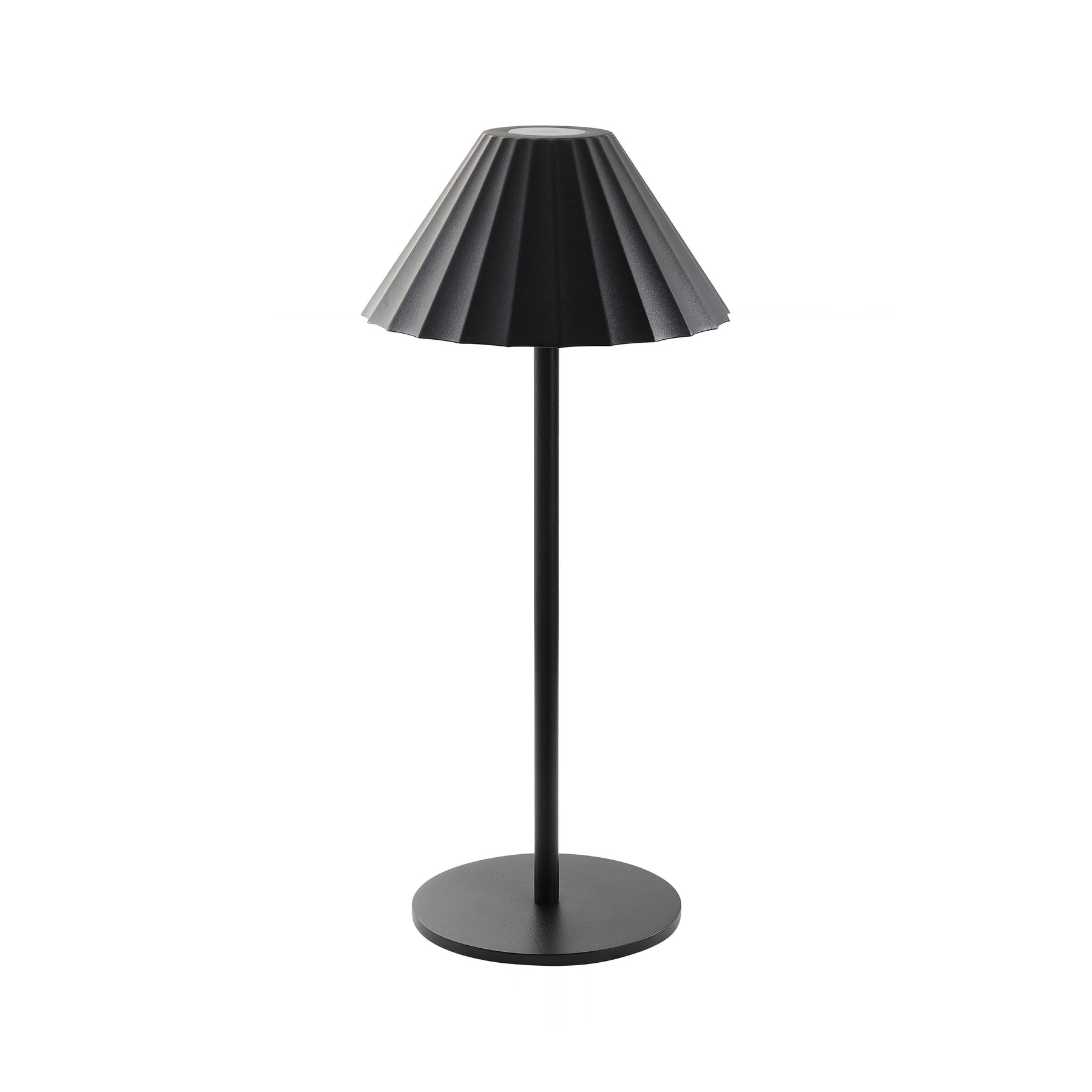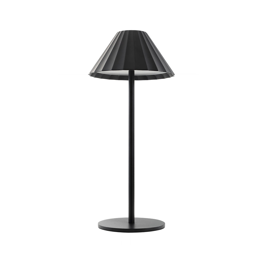 Sculpted with sleek, minimalist lines, this lamp features a striking matte black finish and a finely pleated acrylic shade, creating sophisticated architectural detail. Its portable, battery-powered core offers true design freedom, allowing luxurious ambient light to anchor any setting without tethering to an outlet.