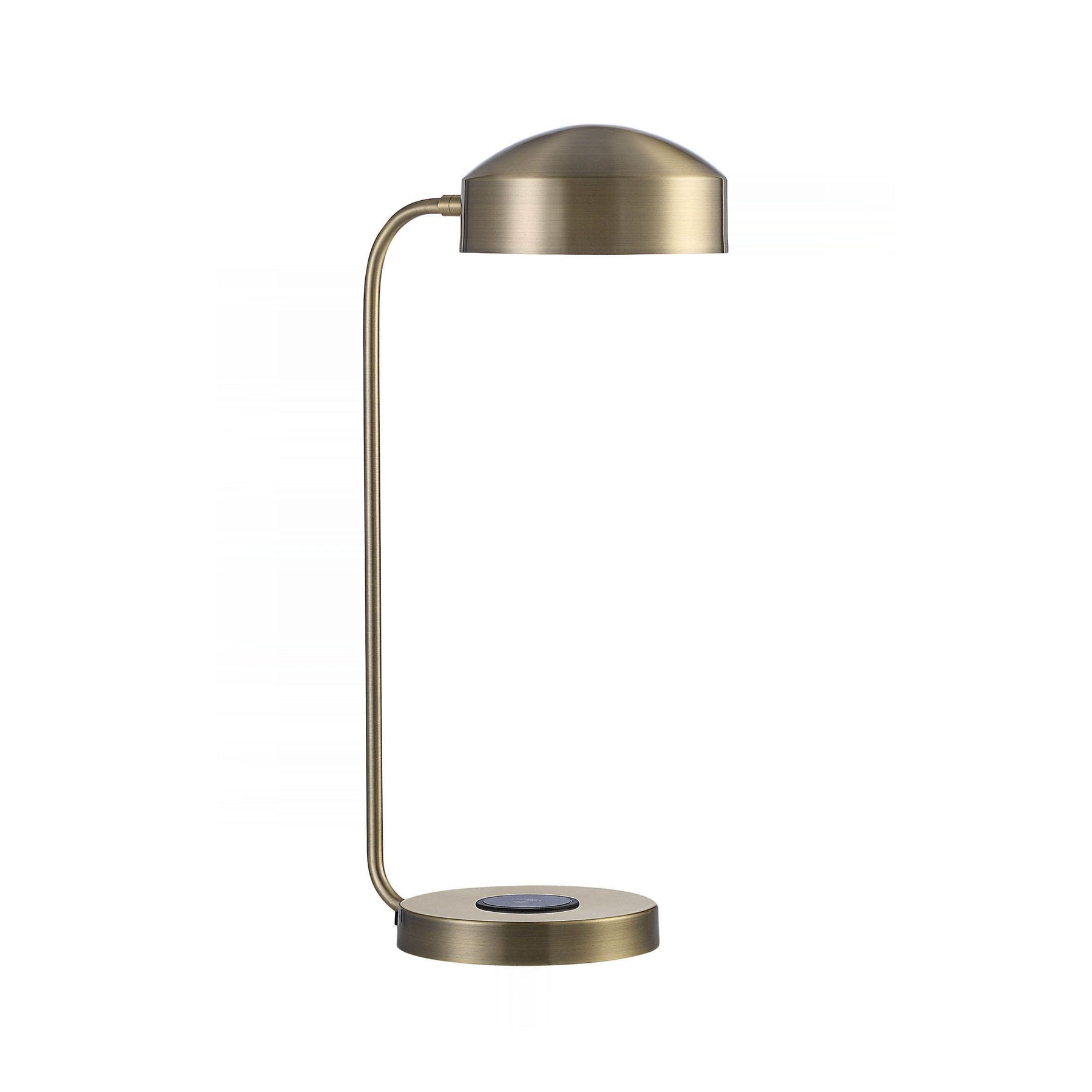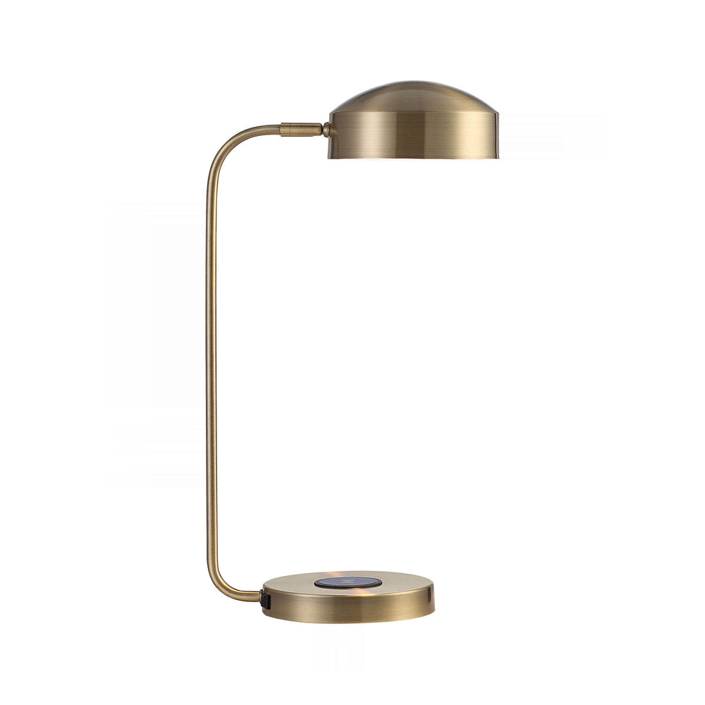 The slender, gracefully curved metal stem supports a domed shade, showcasing an antique brushed brass finish that recalls refined mid-century aesthetics. This silhouette balances cosmopolitan simplicity with a warm, architectural presence suitable for modern or vintage settings.