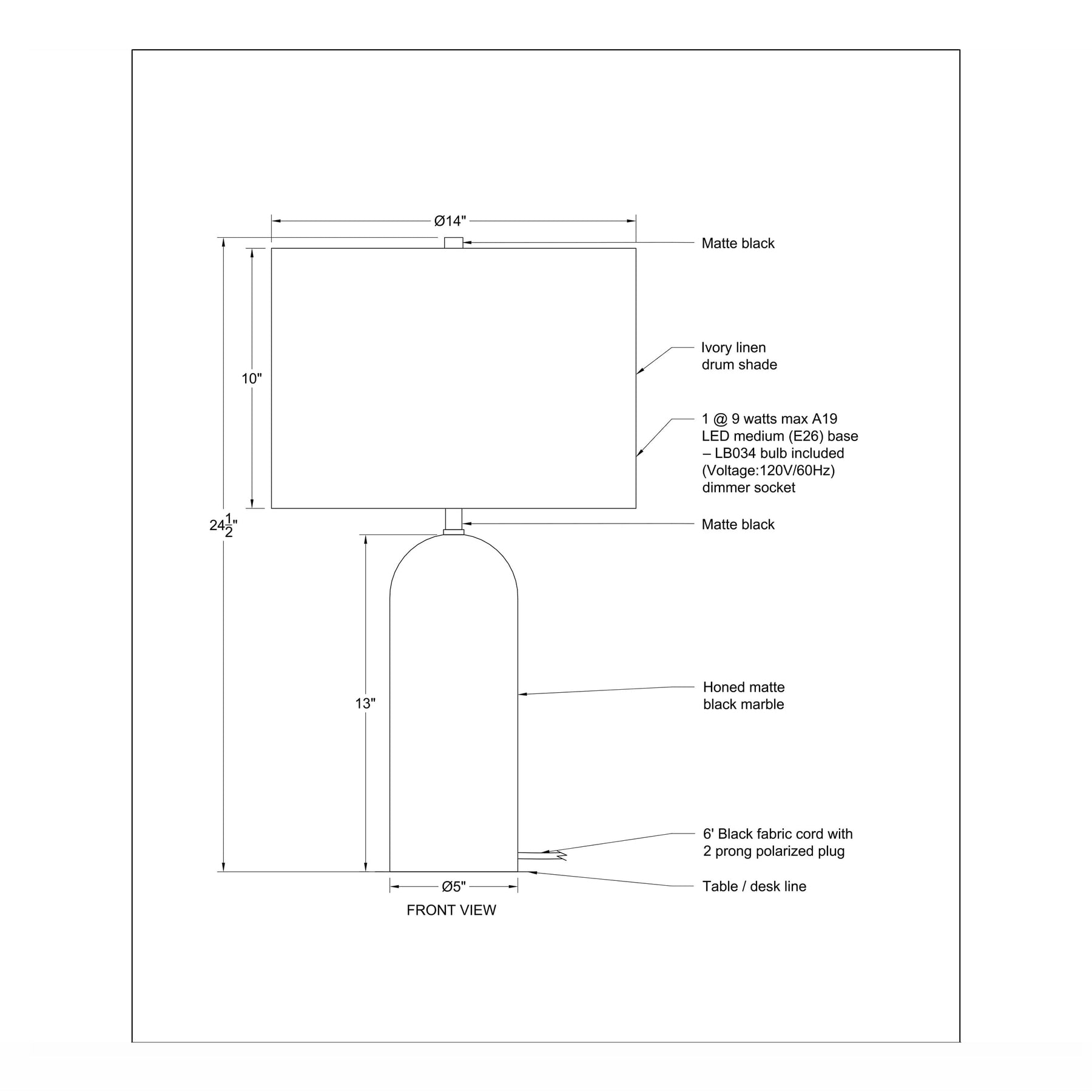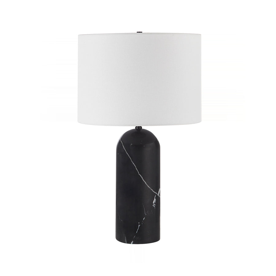 Sculptural, monolithic form defined by a polished black marble cylinder featuring dynamic white veining for dramatic visual texture. The weighty base grounds the piece, contrasting beautifully with the airy, crisp off-white linen drum shade above.