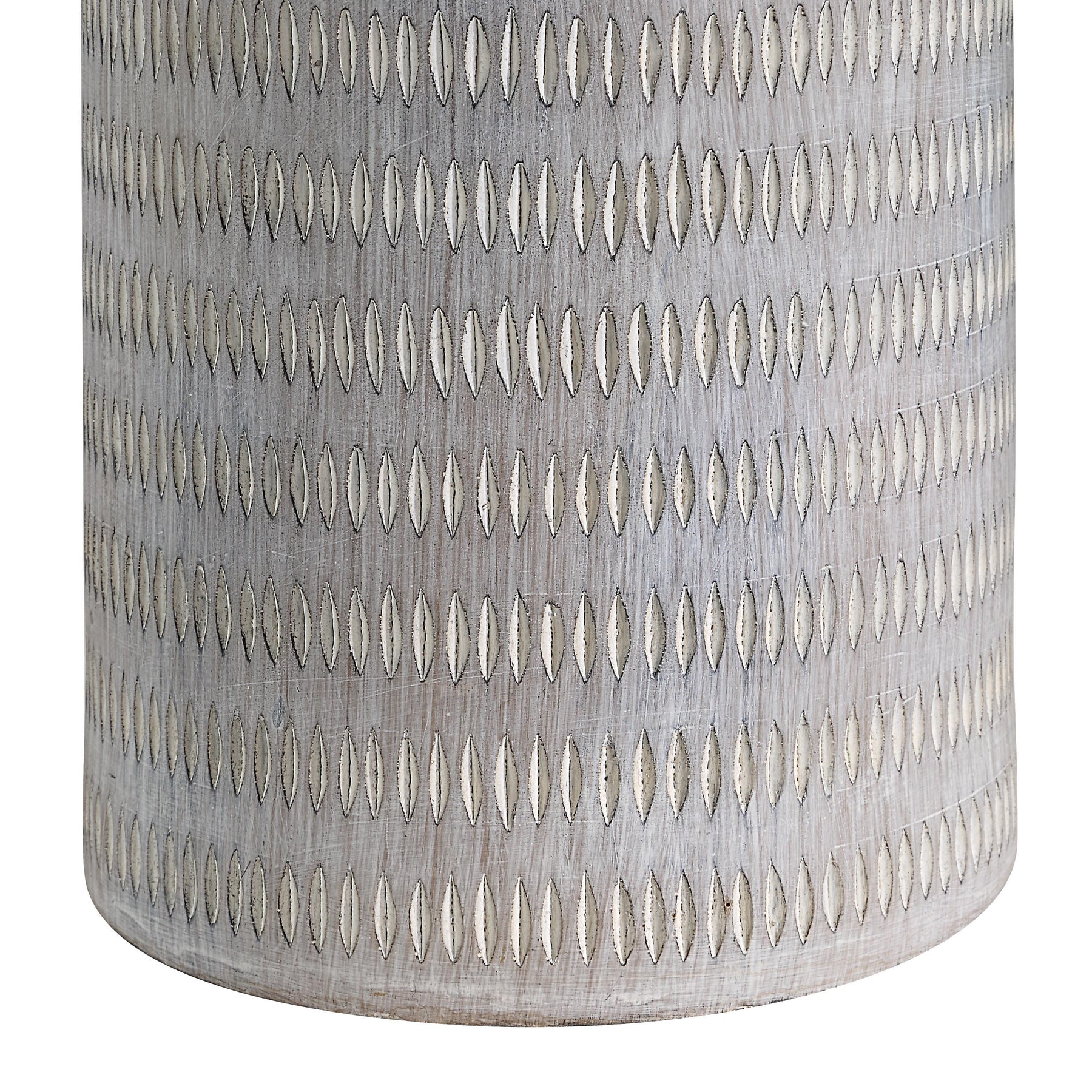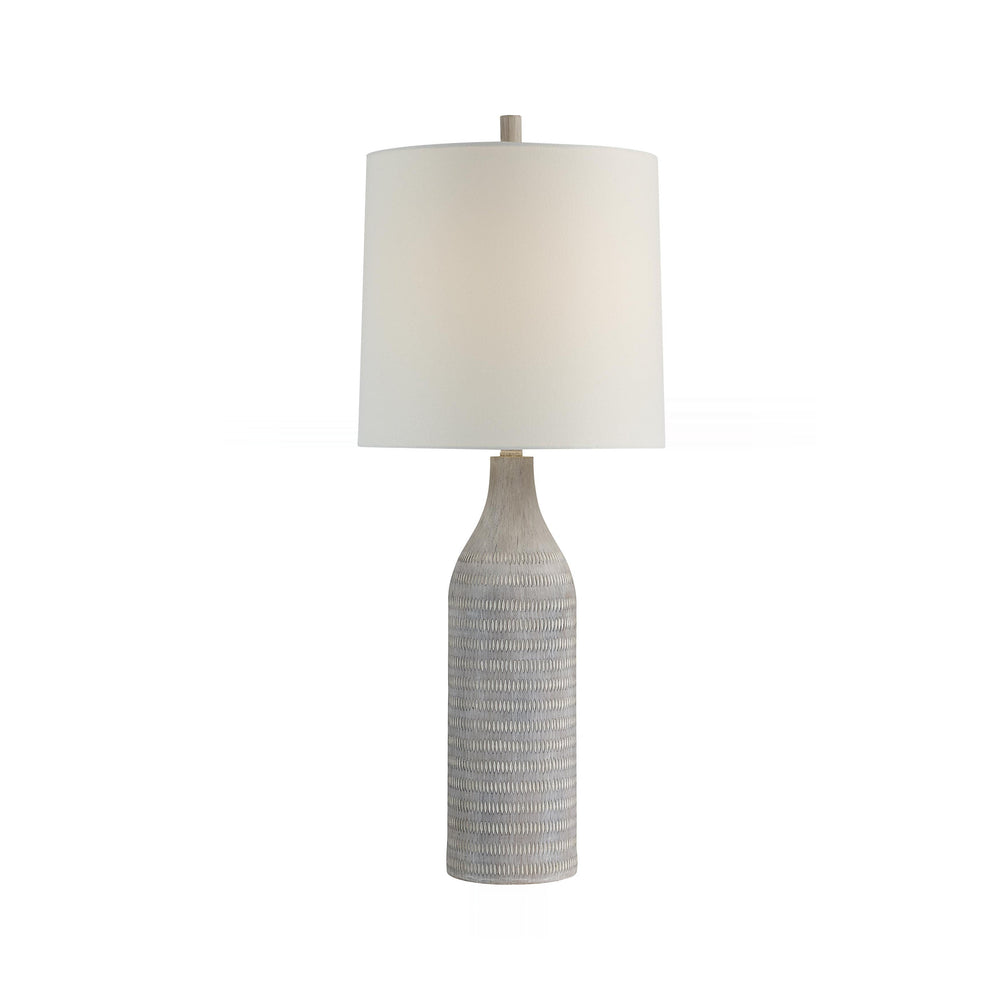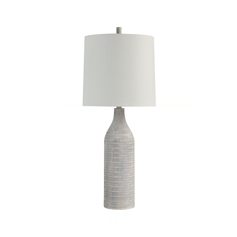 Artisanally textured ceramic base features a slender, elongated silhouette finished in a soothing, weathered cream tone, lending organic depth to contemporary interiors. A crisp, oatmeal linen drum shade diffuses light softly, creating a welcoming glow ideal for accenting side tables or consoles.