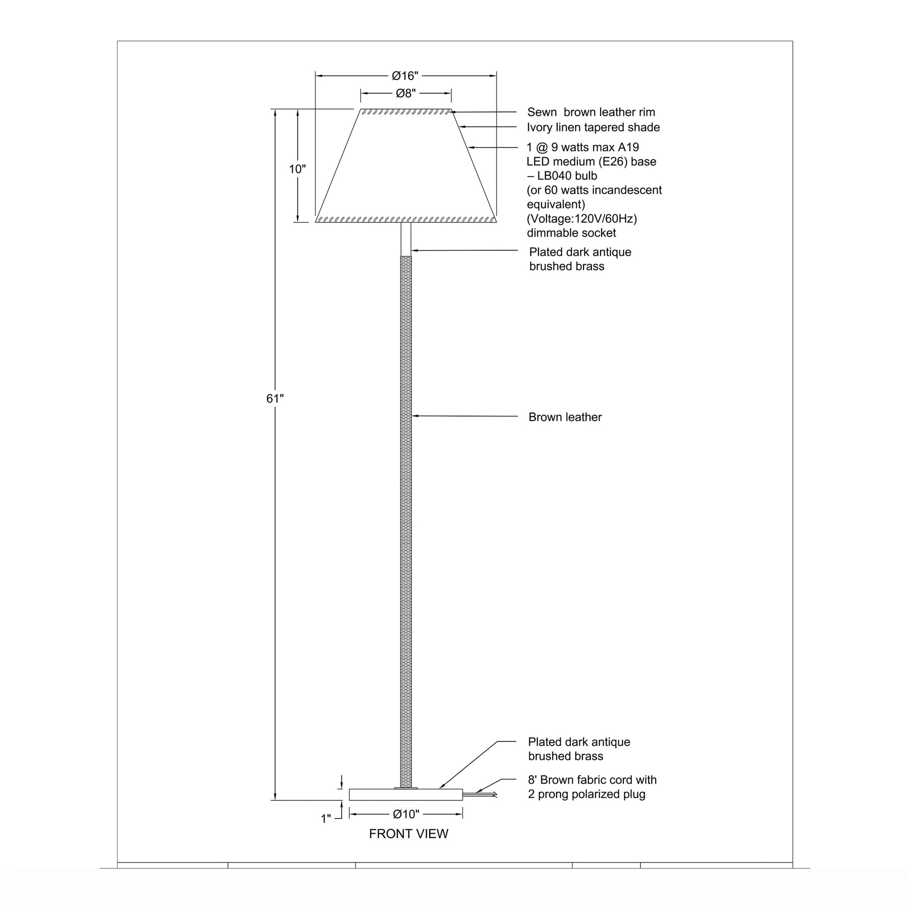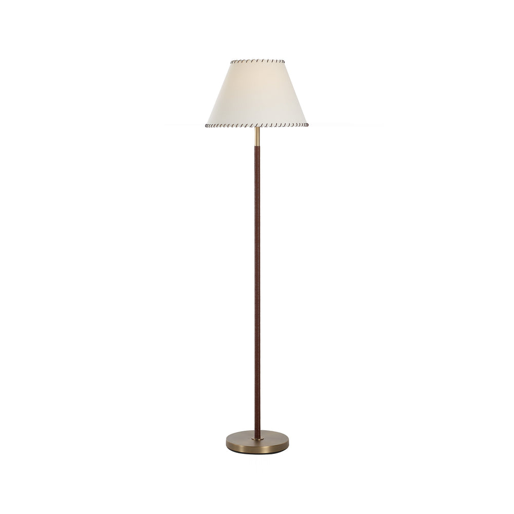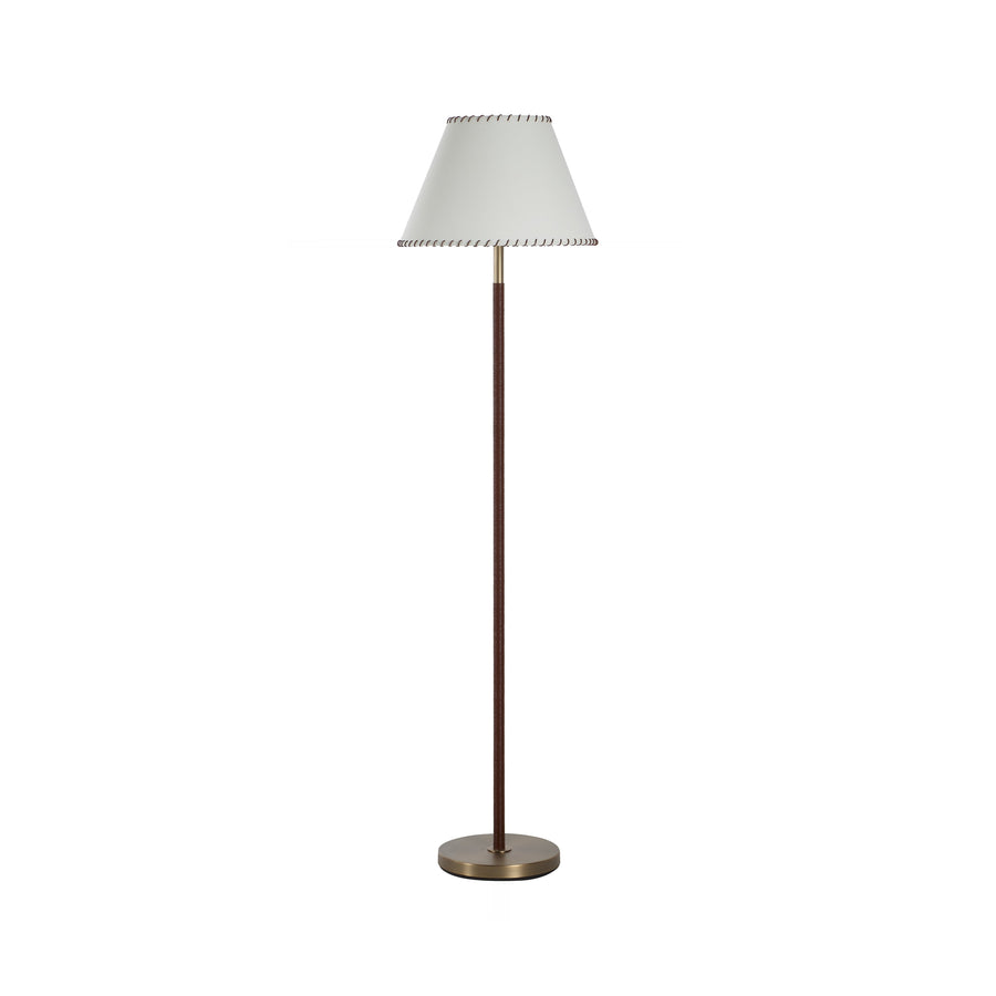 Antiqued brass anchors this striking floor lamp, featuring a warm, textured column wrapped in rich, striated leather for immediate visual depth. The transitional silhouette balances heritage warmth with refined modern structure for enduring appeal.