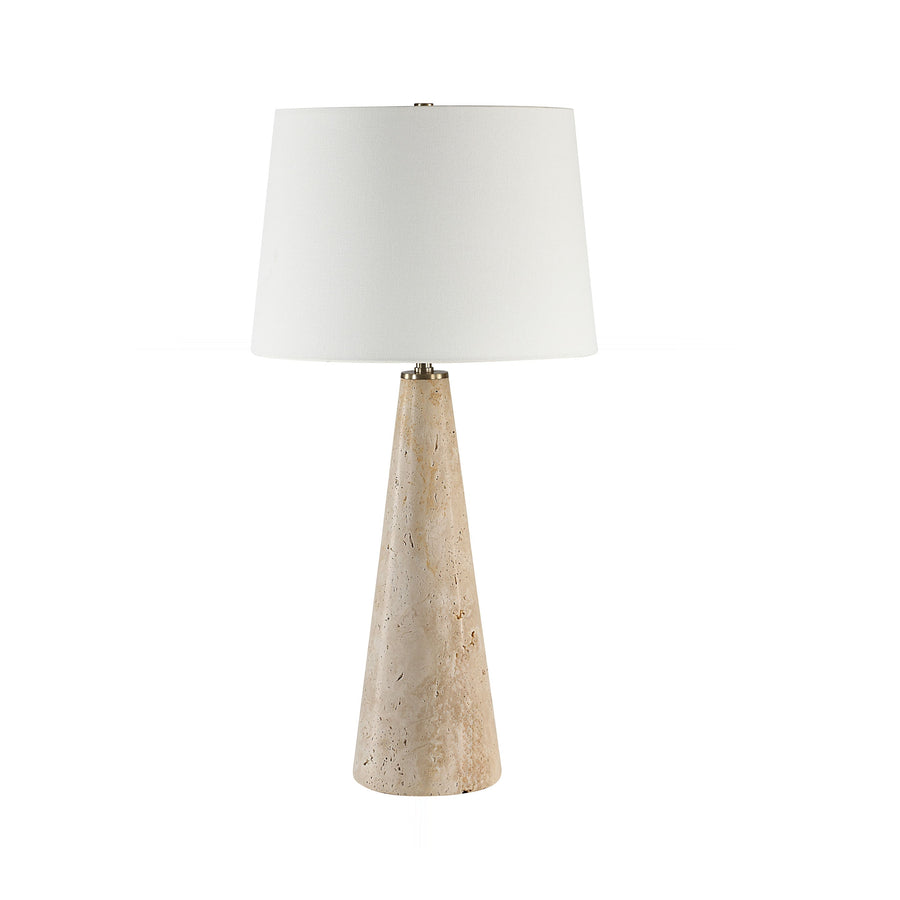 Tapered, substantial travertine forms the arresting base, showcasing rich, organic veining and natural pitting for elemental texture. This solid stone anchors the refined silhouette, exuding sophisticated, earthy luxury.