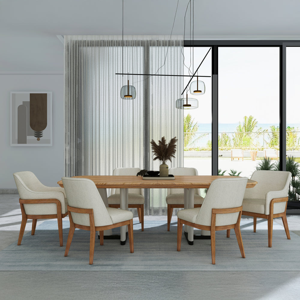 Crafted from high-quality parawood solids and Mindi veneers, this table ensures durability and timeless appeal. The 90-inch tabletop extends to 110 inches with a 20-inch leaf, comfortably seating eight guests. The dual pedestal base with three angular columns adds a unique touch, while protective floor glides ensure stability and prevent damage to your flooring.