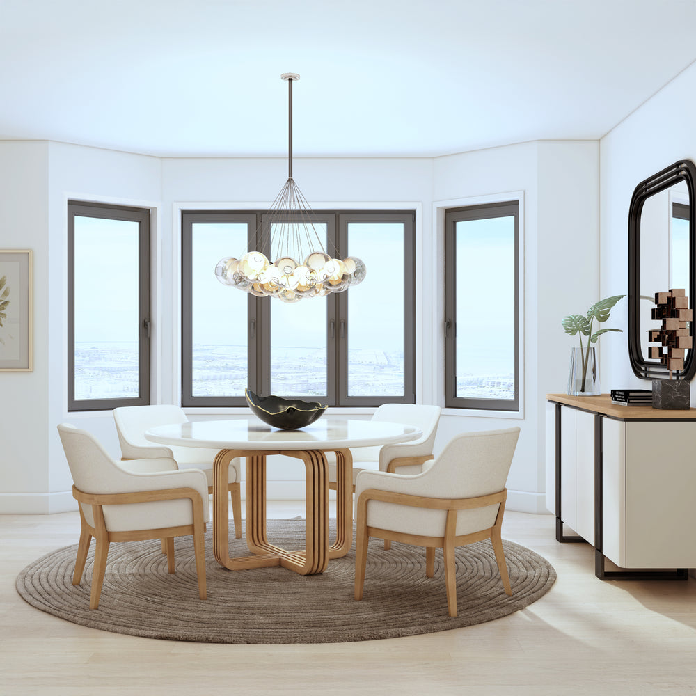 Gather around this contemporary-modern round dining table, designed to blend luxurious mixed materials with an organic modern twist. The open pedestal base features intersecting rounded squares with a slat design that beautifully showcases the natural wood grain. Finished in sienna and white plaster, this 60-inch table comfortably seats six, making it perfect for family dinners and social gatherings.