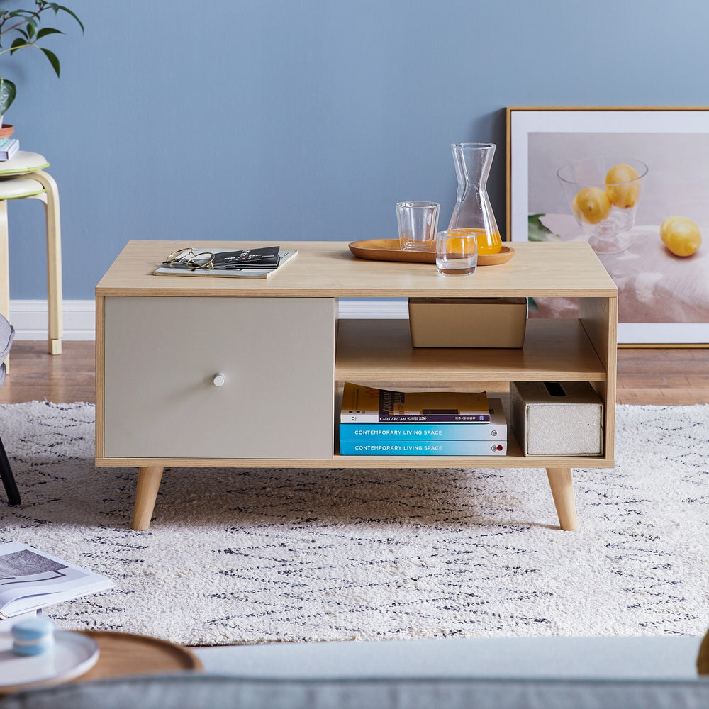 Designed for both functionality and style, this coffee table stands on sturdy, tapered legs that add a touch of mid-century charm. The smooth, matte finish drawer contrasts beautifully with the natural wood, making it a versatile addition to any room. Perfect for everyday use, its robust construction promises longevity, making it a timeless piece for your home.