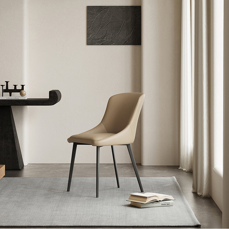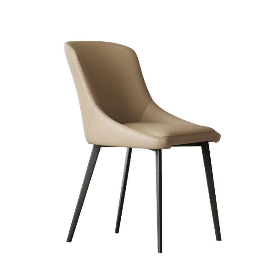This minimalist dining chair features a sleek silhouette, upholstered in premium Leathaire material, offering the luxurious look of leather with enhanced breathability. The slim, matte black legs complement the chair’s modern design, making it a perfect fit for high-end dining rooms or kitchens.