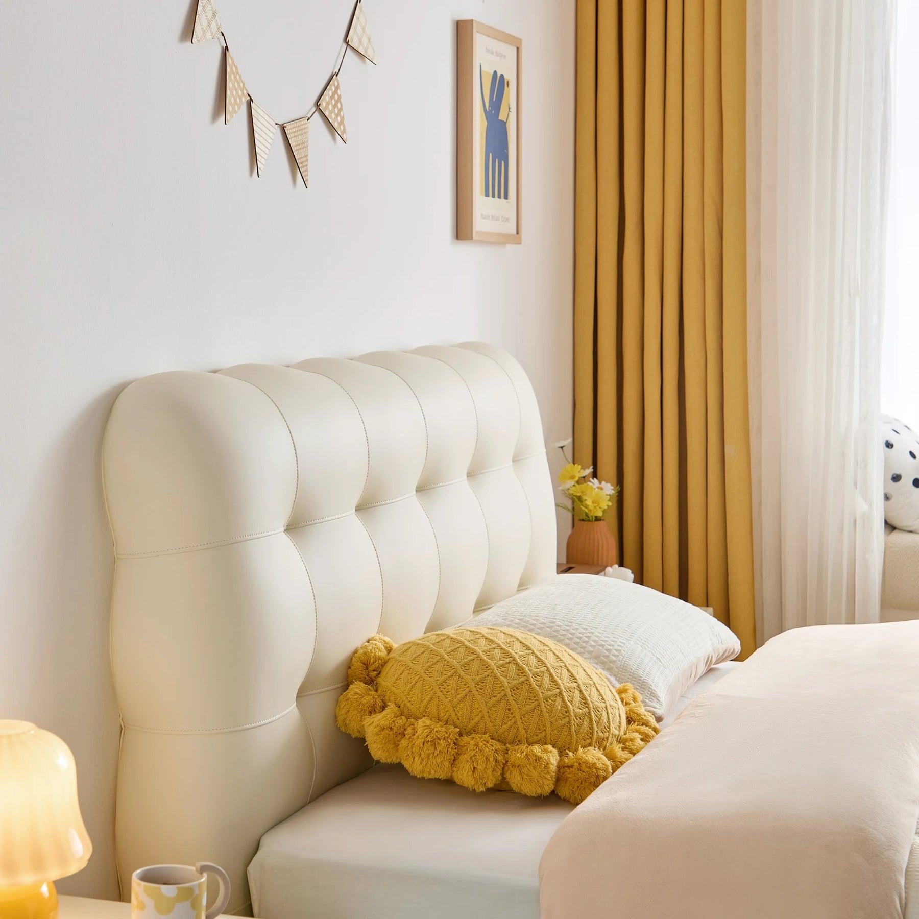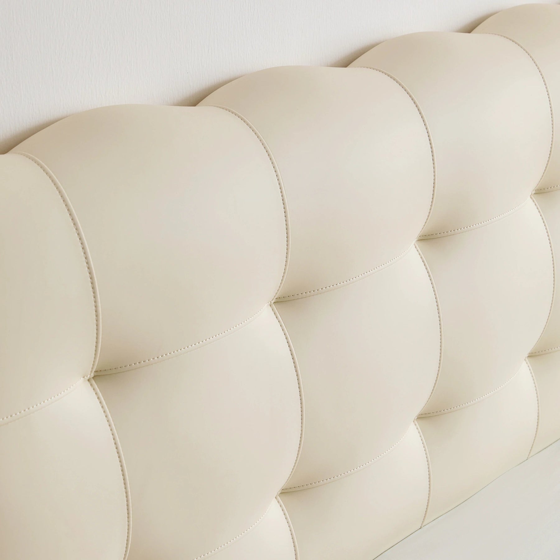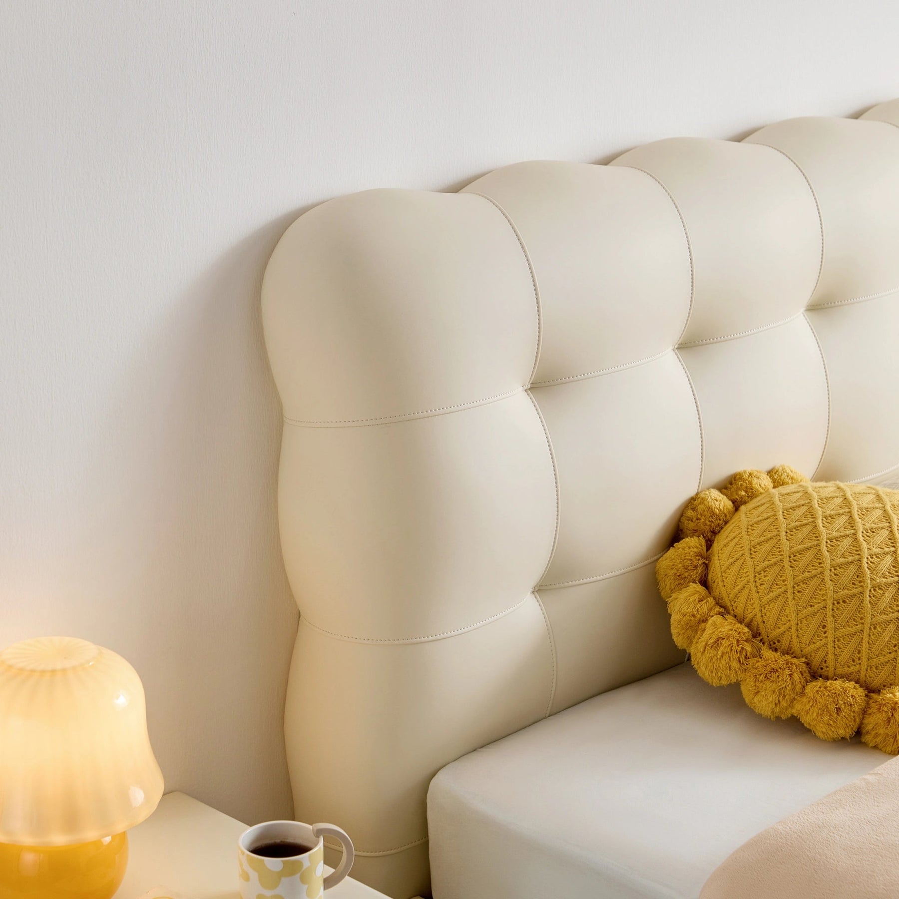 Cloud-like comfort defines this bed frame, featuring generously padded upholstery in a soft, creamy hue that evokes serene luxury. The deep tufting on the substantial headboard offers a sophisticated, pillowy texture perfect for leisurely mornings.