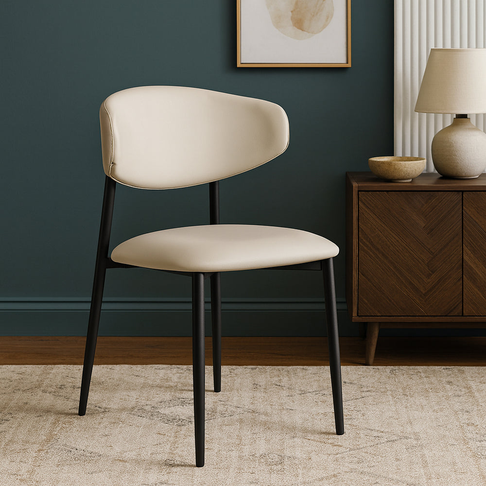 Built with sturdy black metal legs, this chair combines durability with an elegant design. Whether you choose the smooth leathaire or the cozy fabric option, this versatile piece is designed to suit both casual meals and formal gatherings. Add a pair or a full set to create a refined and inviting dining atmosphere.