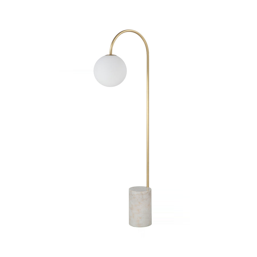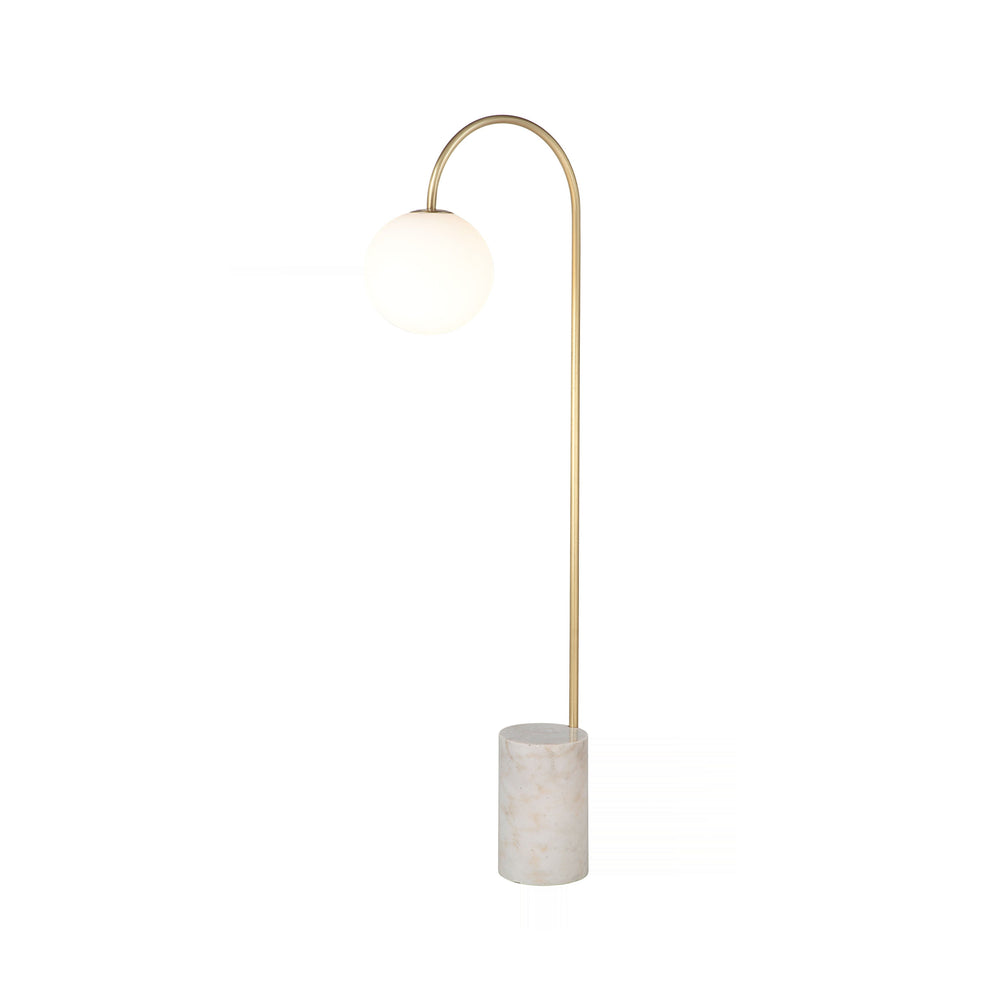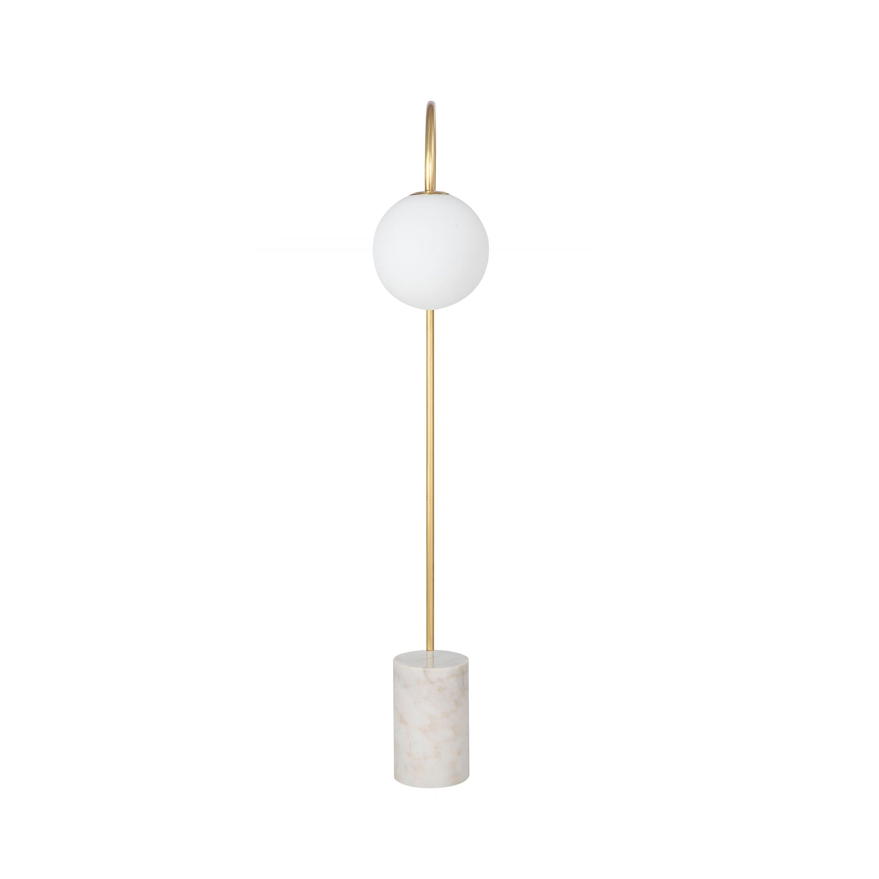 Sleek silhouette defined by a gracefully arcing satin brass stem culminating in a frosted globe diffuser. This slender form anchors itself upon a substantial, textured marble cylinder base, imparting organic weight to the modern design.