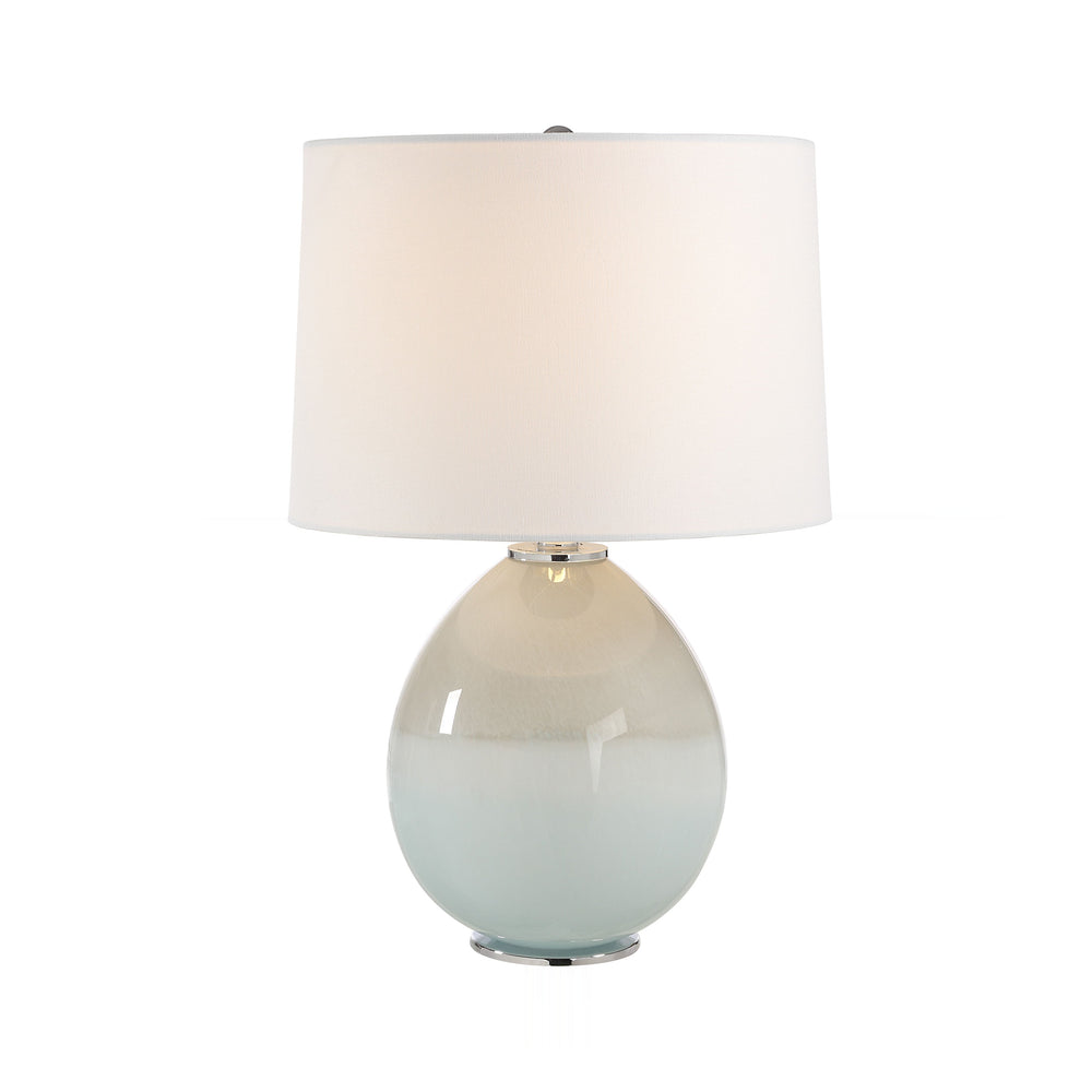 The ovular glass base showcases a captivating pale blue ombré transition, lending an airy coastal sophistication to any setting. Capping this elegant form is a tailored white linen drum shade, offering beautifully diffused illumination and sculptural balance.