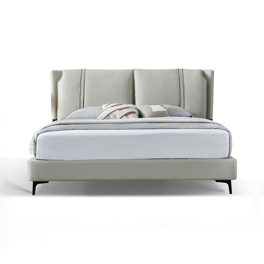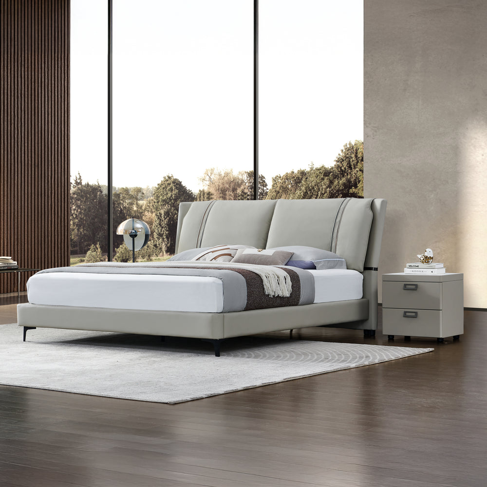 Elegance meets comfort with this platform bed, featuring a sleek leather-upholstered frame in a soft neutral tone. The high cushioned headboard with stitched accents provides a sophisticated design while ensuring ultimate back support for bedtime reading. Its low-profile design complements modern bedrooms, creating a spacious and minimalist vibe.