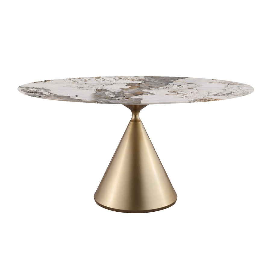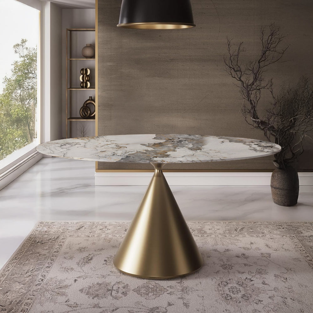 This round dining table combines the timeless elegance of marble with a chic champagne-gold pedestal base. The tabletop, crafted from ultra-durable Pandora supercrystal stone, offers a luxurious look with unique veining patterns. Ideal for modern dining spaces, its sleek profile and minimalistic design enhance the ambiance while offering functionality.