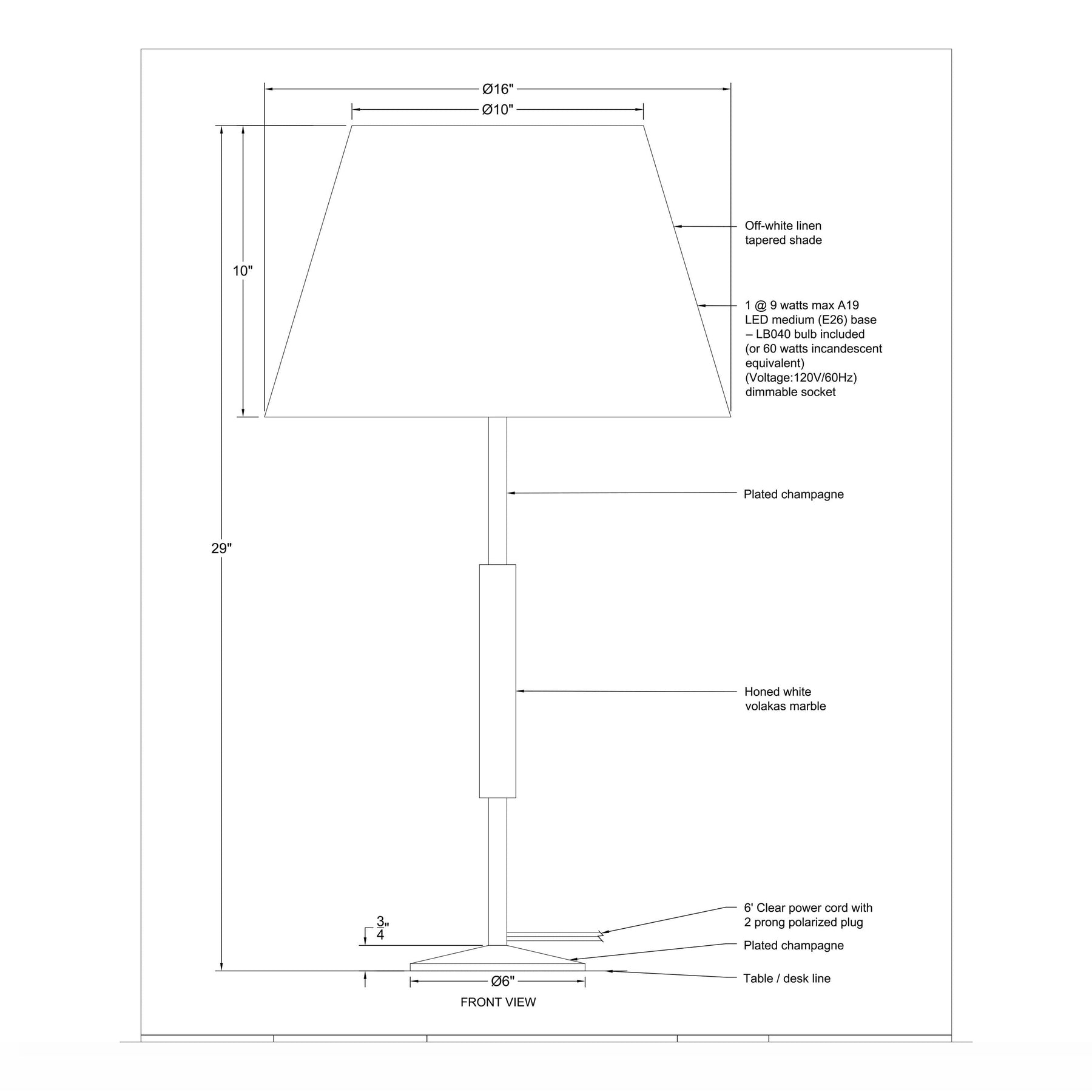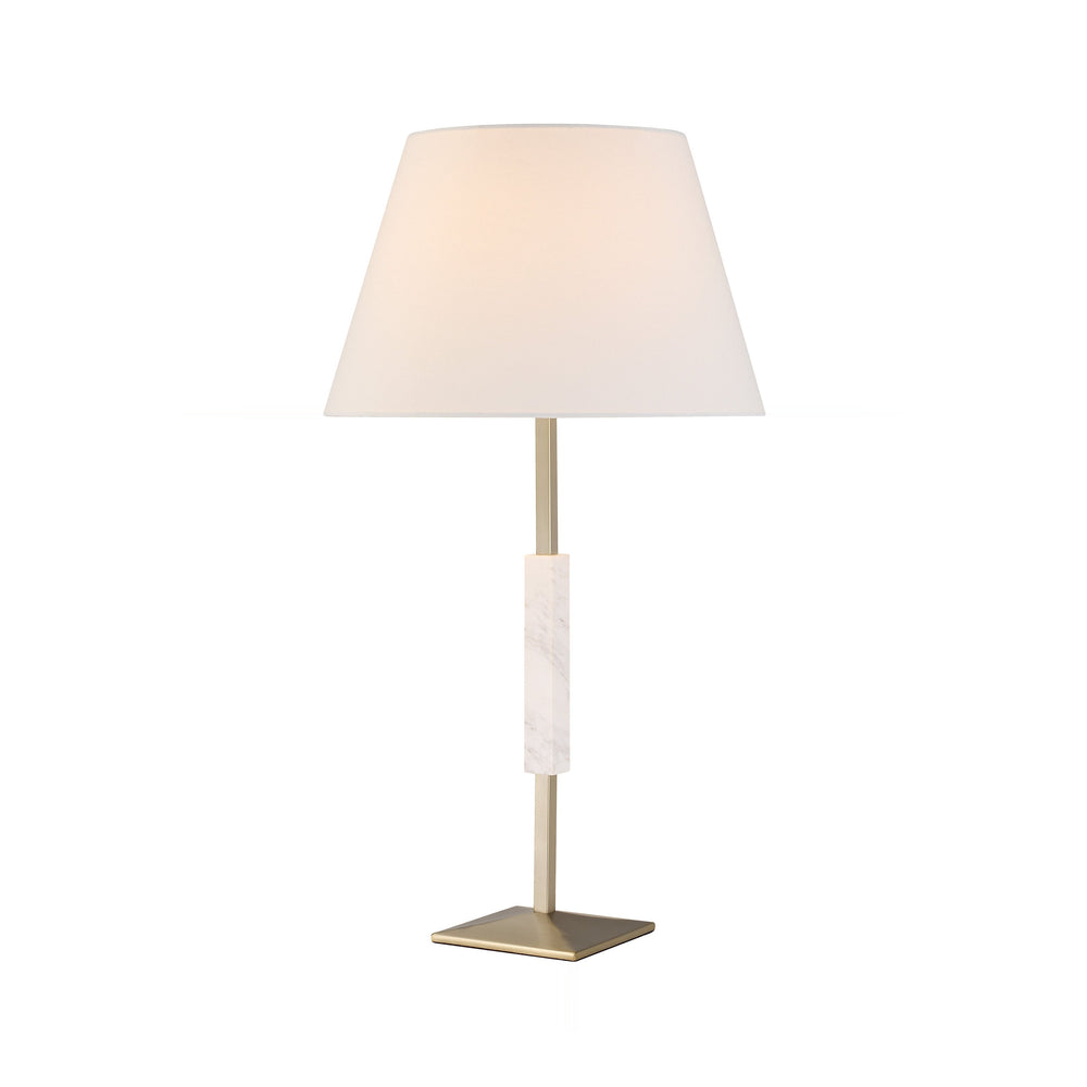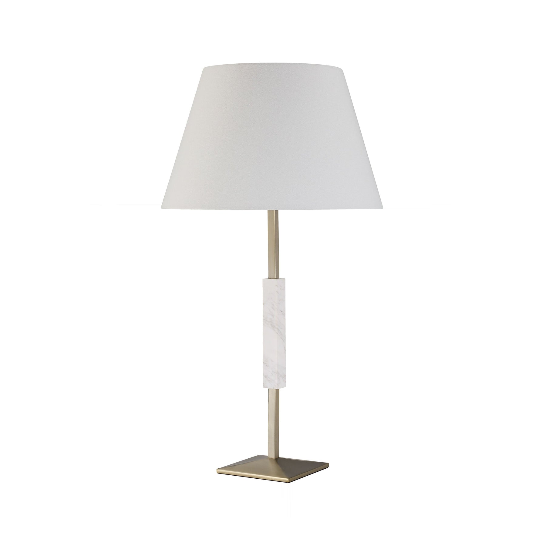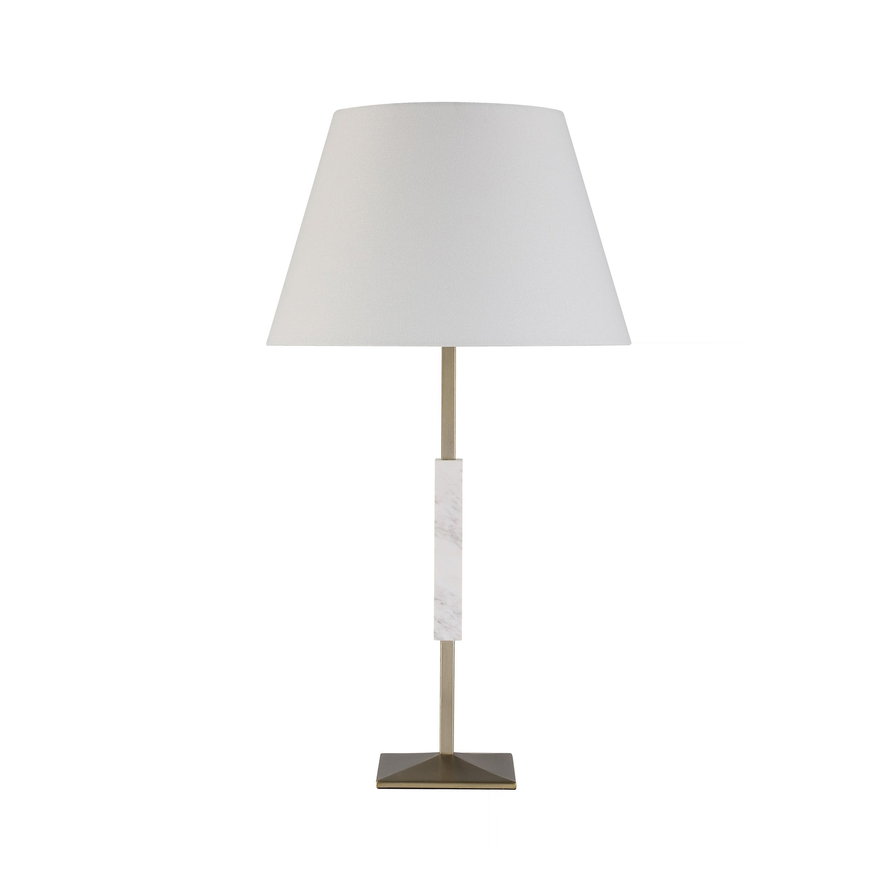 Volakas marble, the esteemed 'Carrara of Greece,' anchors this lamp’s column with cool, natural veining and a honed finish. Champagne-plated metal accents provide warm contrast to the substantial stone base and stem structure.
