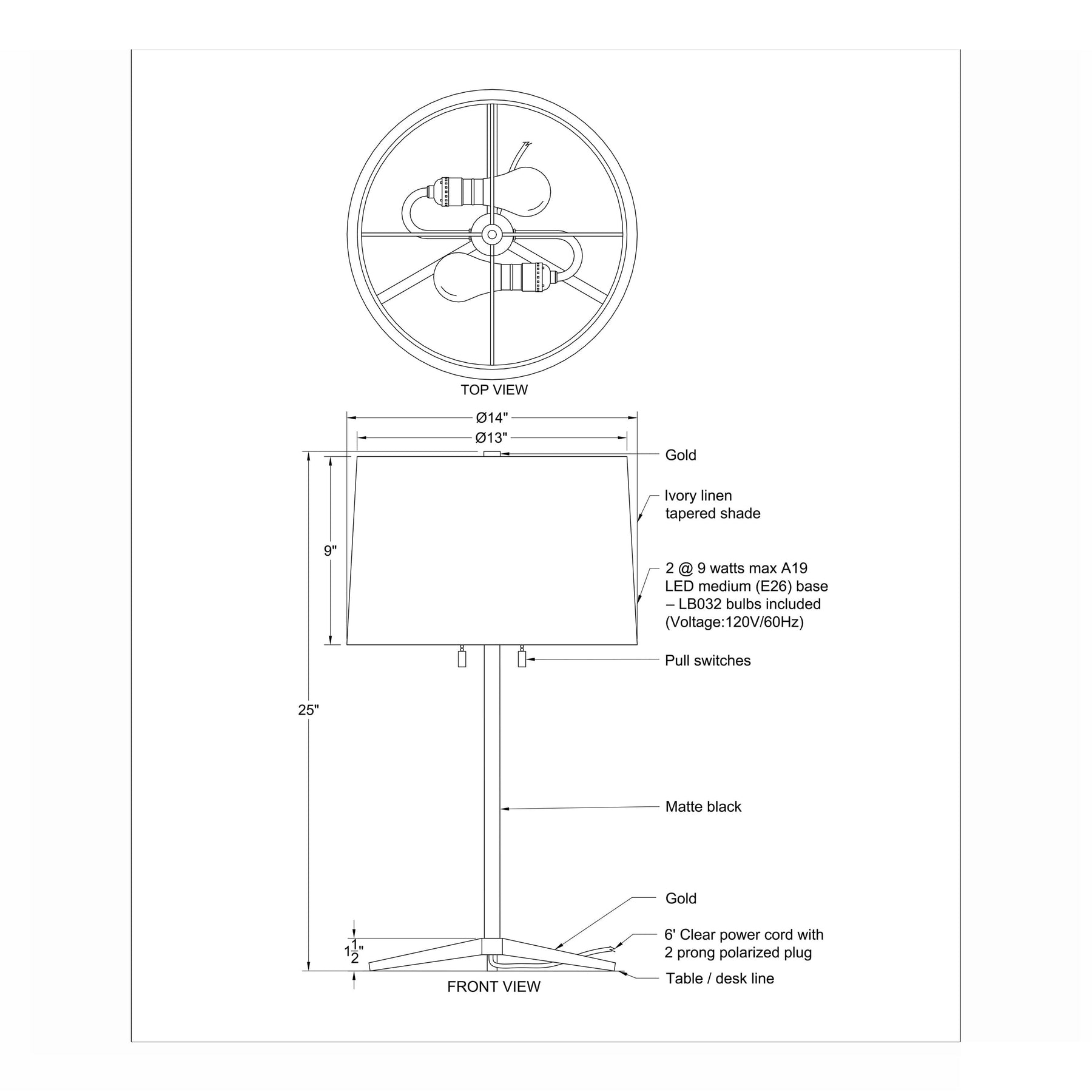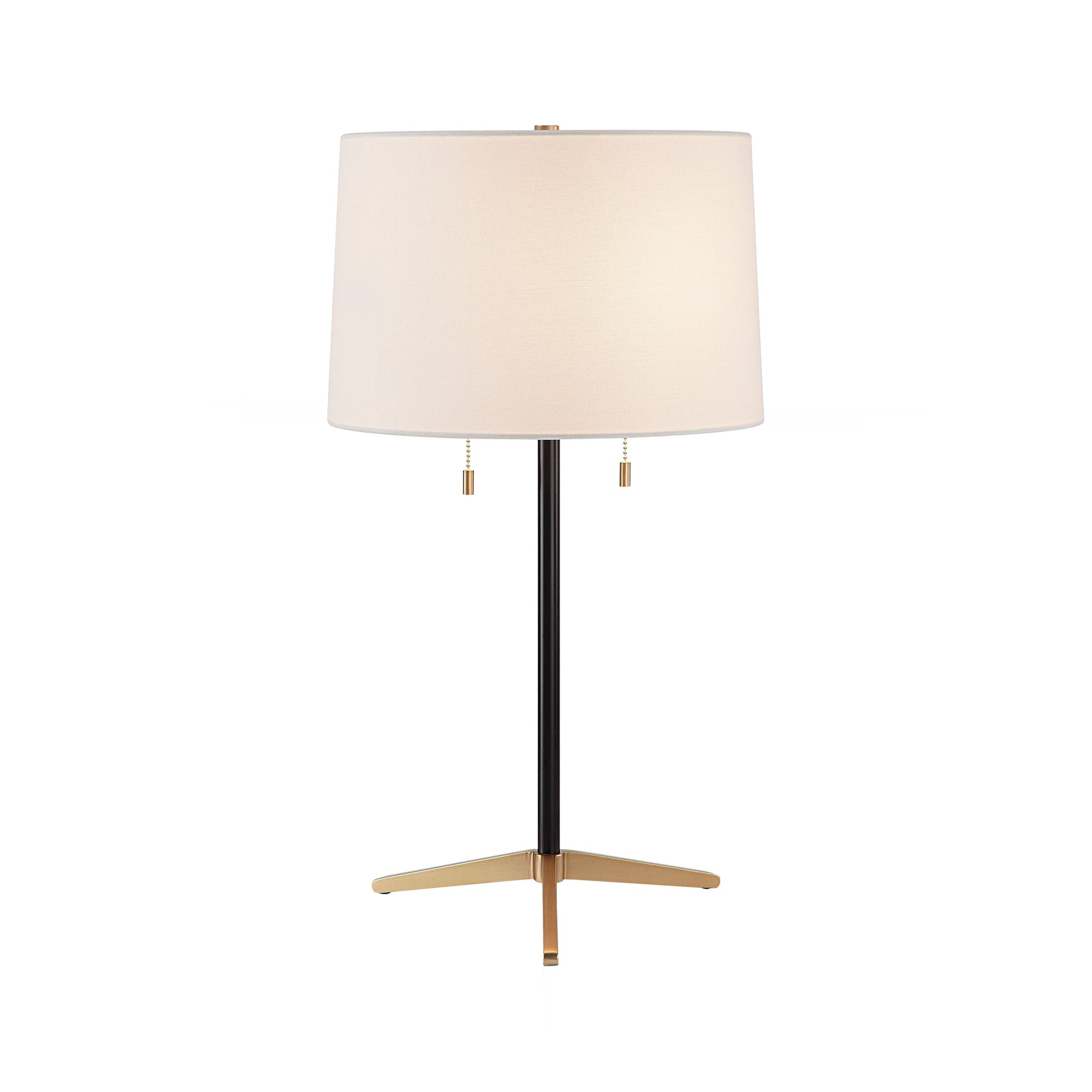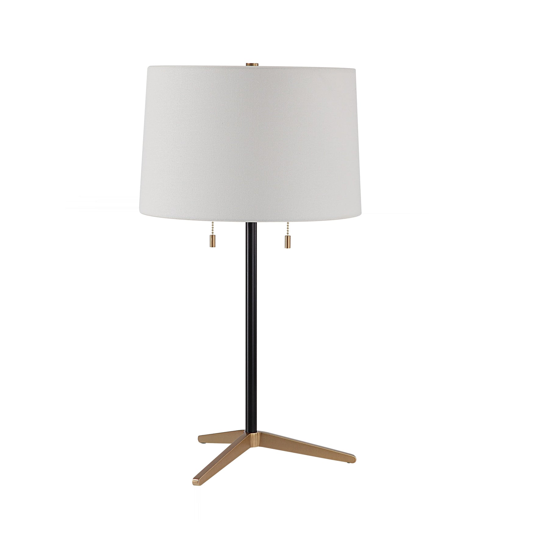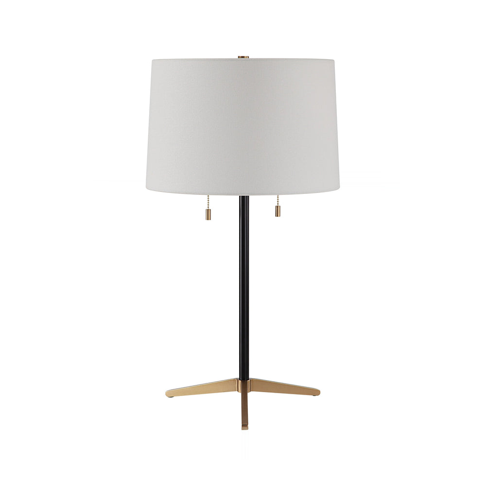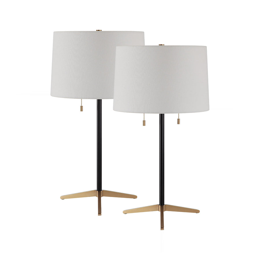 Sleek matte black iron columns rise to support softly tapered cream linen shades, creating an elegant mid-century silhouette. The contrasting brushed brass tripod bases introduce sculptural warmth and modern stability to the refined form.