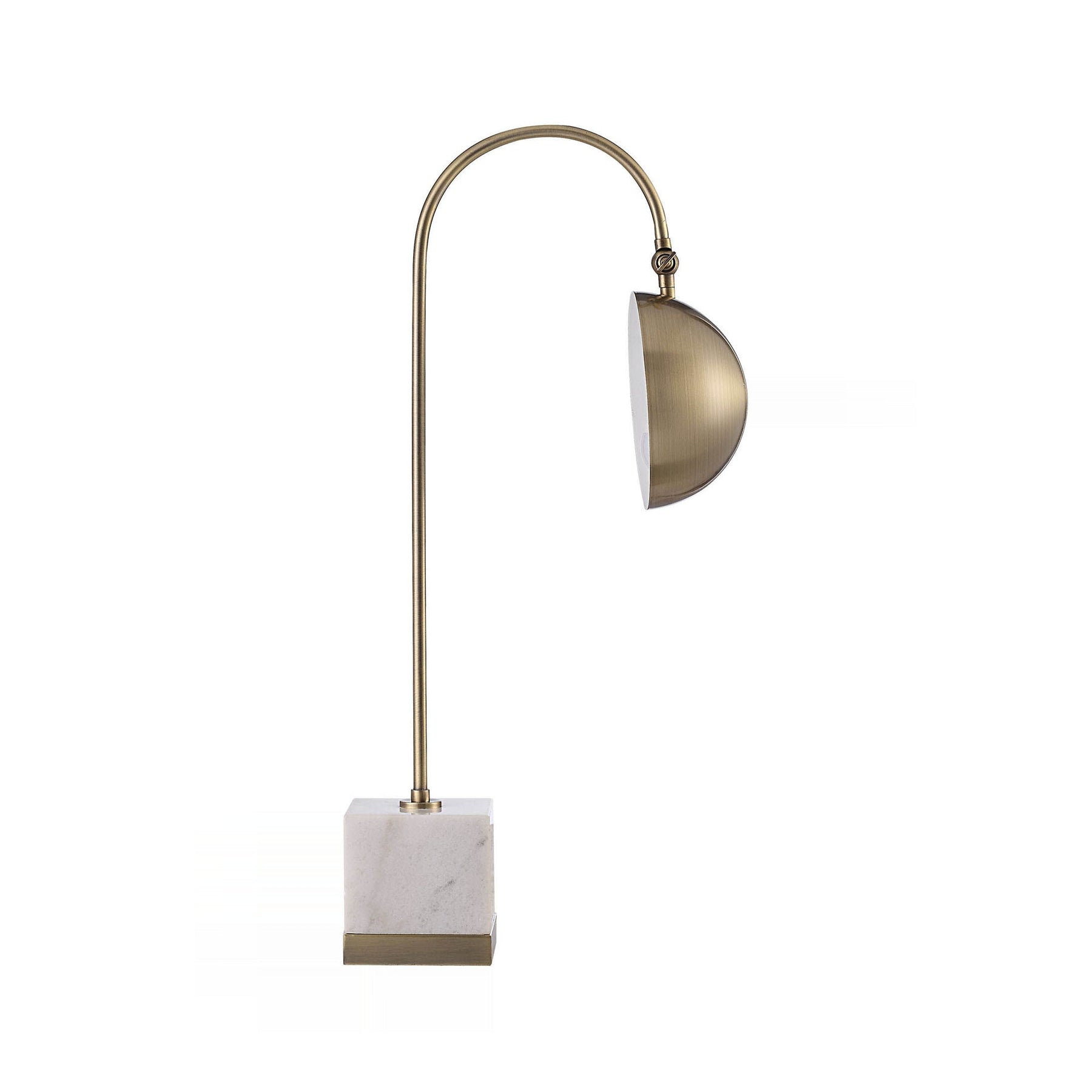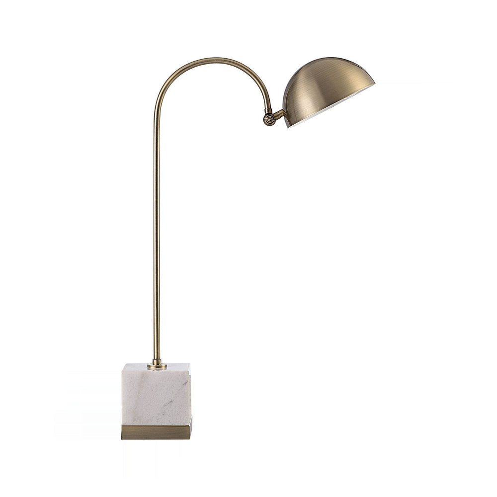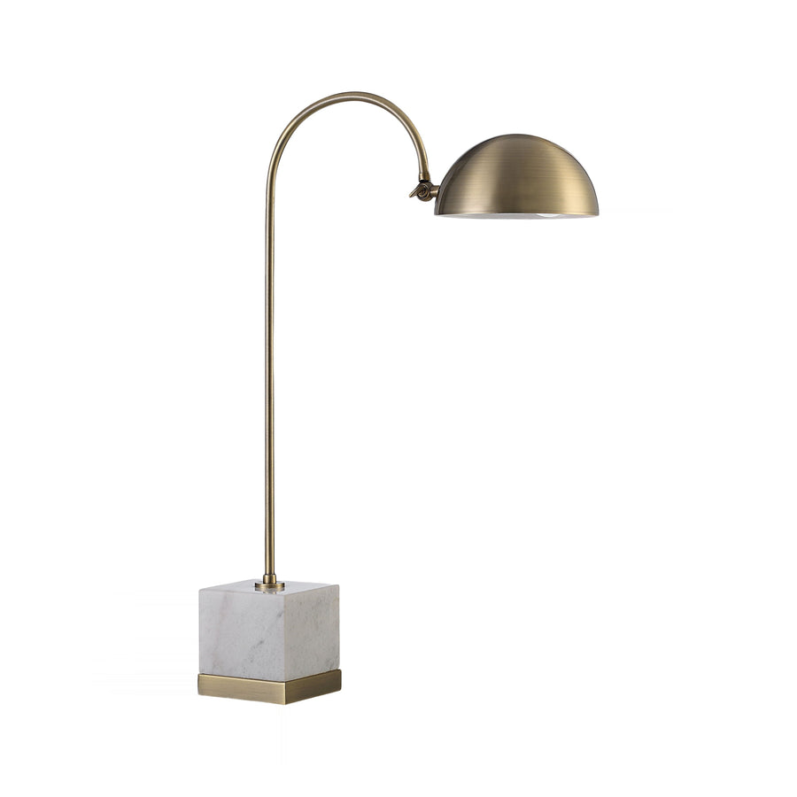 Sculptural brass arcs elevate a solid, cool marble base, blending industrial geometry with classic material luxury. The aged, antique finish on the metal provides textural contrast against the stone's natural veining, creating an intriguing focal point for any desk.