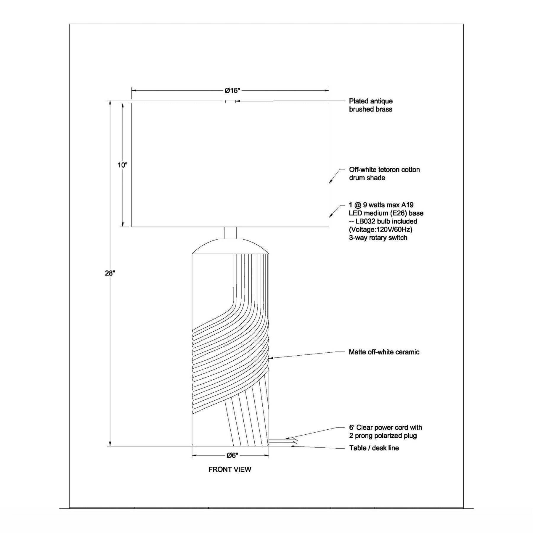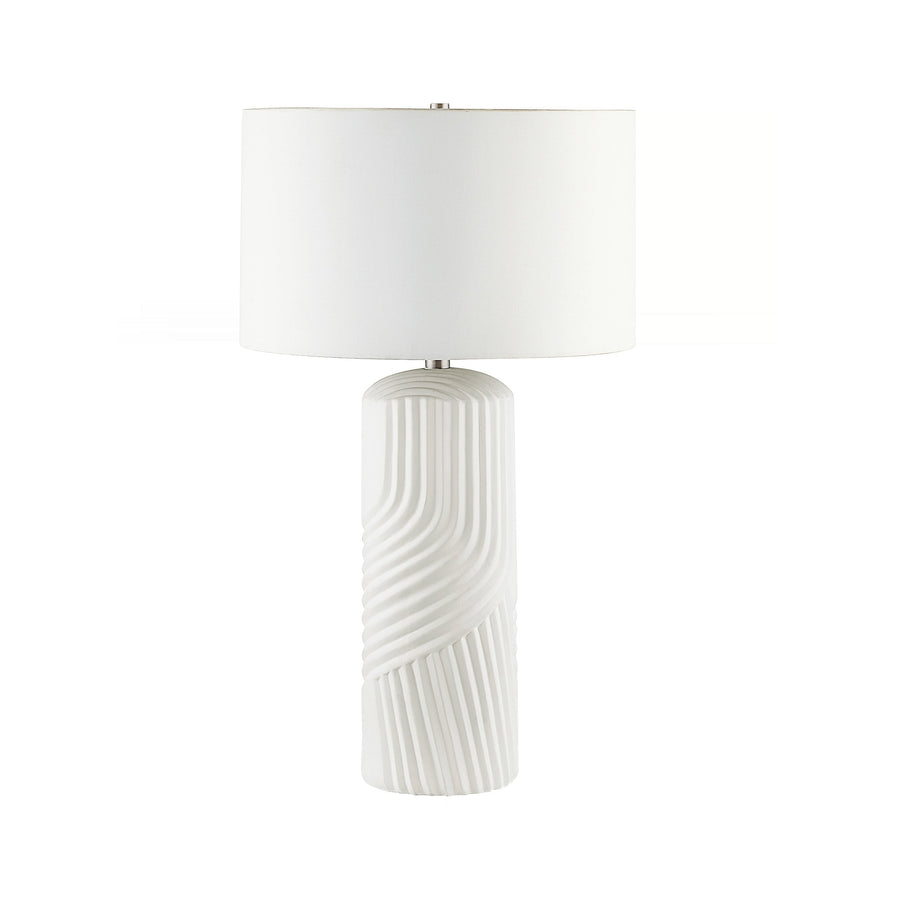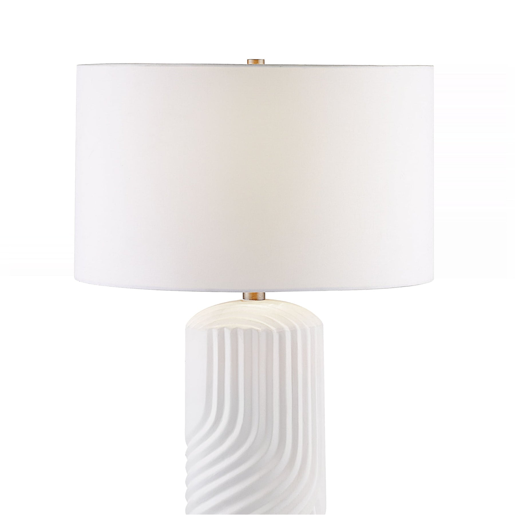 Sculptural ceramic body features intricate, undulating vertical ribbing that catches light beautifully, elevating the classic table lamp silhouette with tactile depth. Its monochromatic white finish contrasts with antique brass accents, lending a sophisticated, glowing presence to contemporary or transitional settings.
