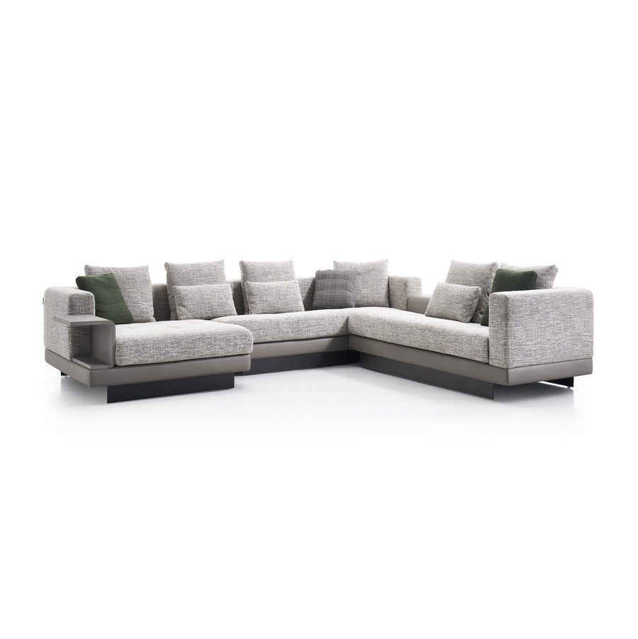 The Connery Modular Sectional Sofa embodies refined modern elegance with its architectural form and luxurious materials. Upholstered in a mix of textured gray fabric and smooth leather accents, this sectional creates a sophisticated yet comfortable atmosphere. Its built-in side tables add both convenience and style, making it a standout feature in contemporary living spaces.
