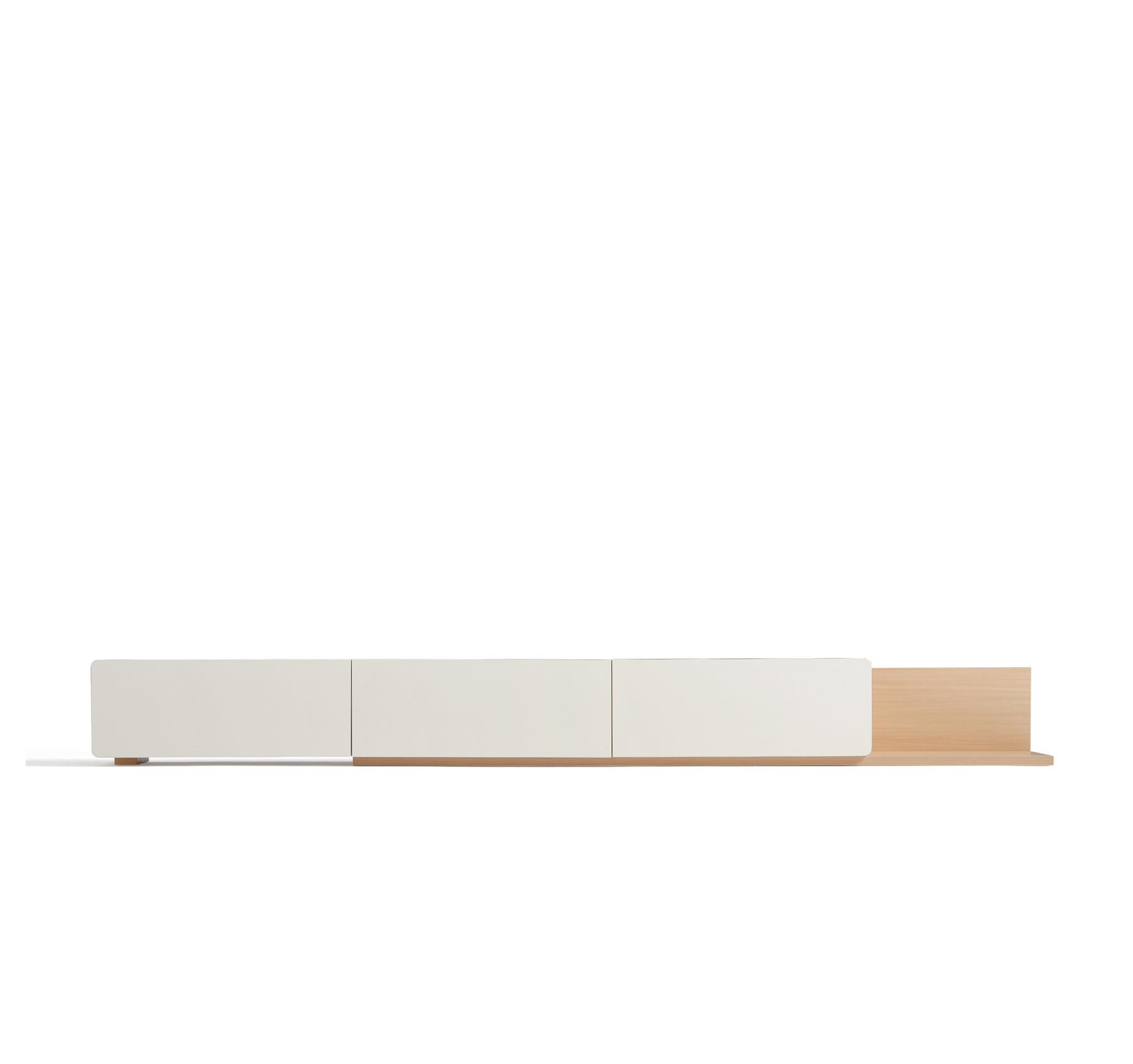 Extendable TV console with a smooth, scratch-resistant melamine finish and minimalist silhouette, designed to adapt effortlessly to different room layouts, from compact apartments to sprawling living rooms, complementing modern and Scandinavian decors.