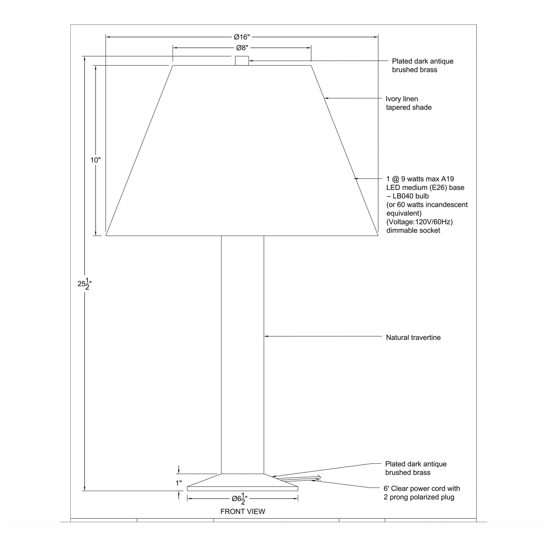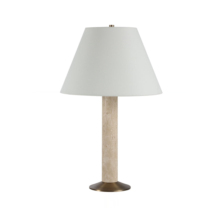 Natural travertine column anchoring a rich, dark antique brushed brass footing establishes a commanding, timeless silhouette for this fixture. The cylindrical stone body is topped by a crisp linen drum shade casting warm illumination.