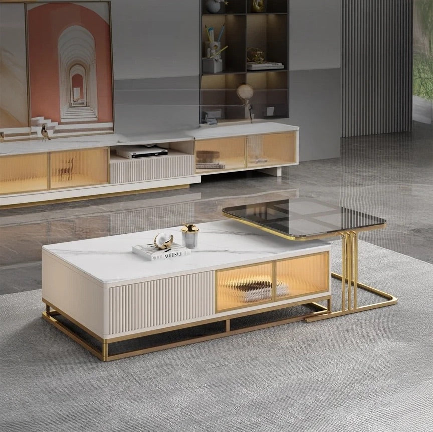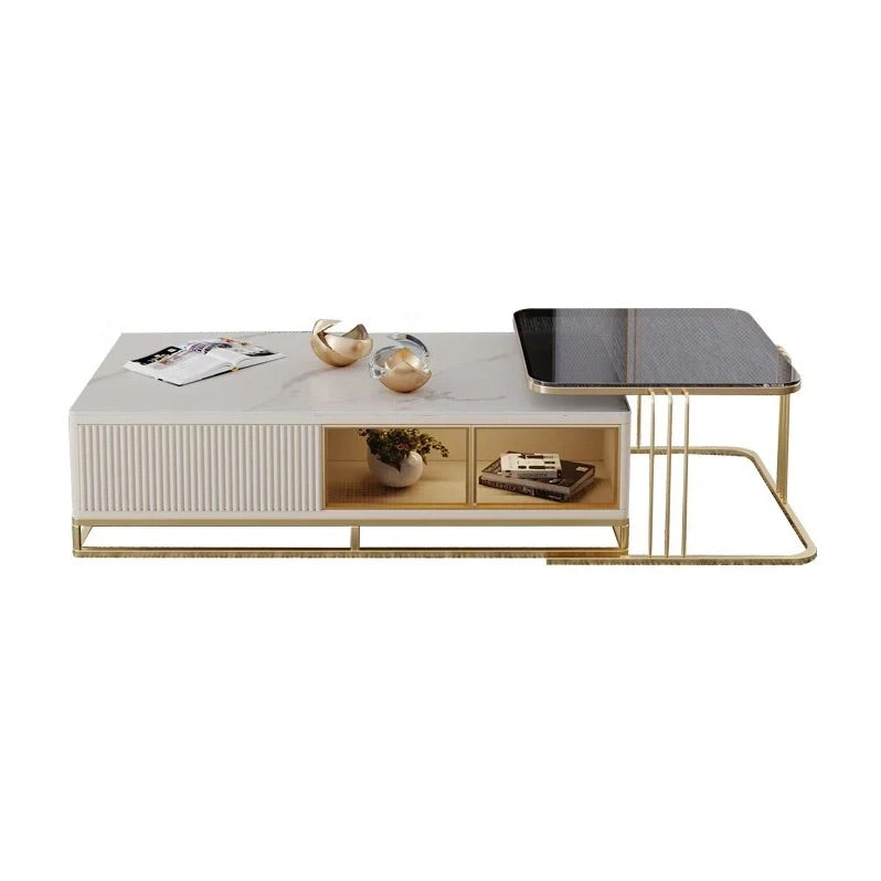 Add sophistication to your living space with this light luxury coffee table, featuring a white marble-like top complemented by champagne gold accents. A modern two-tier design combines practicality and style, with a tempered glass side panel adding a unique flair.