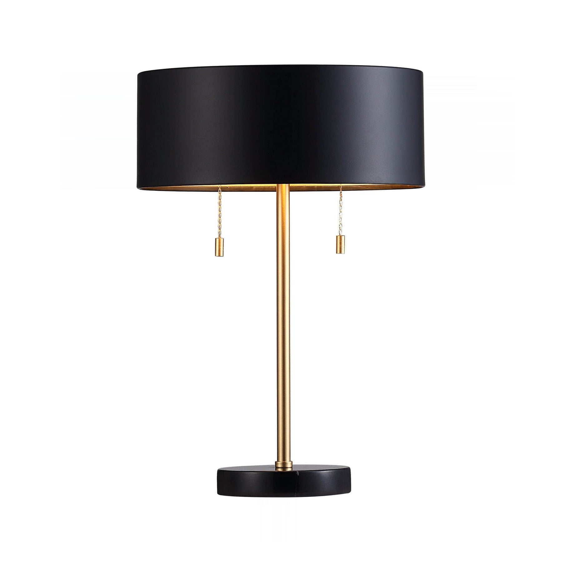 Sleek iron shaft with a warm gold finish anchors this striking composition, contrasting against the substantial, cool black marble base for architectural presence. The drum shade, lined in reflective gold, casts an inviting, ambient glow ideal for focused tasks or sophisticated layering.