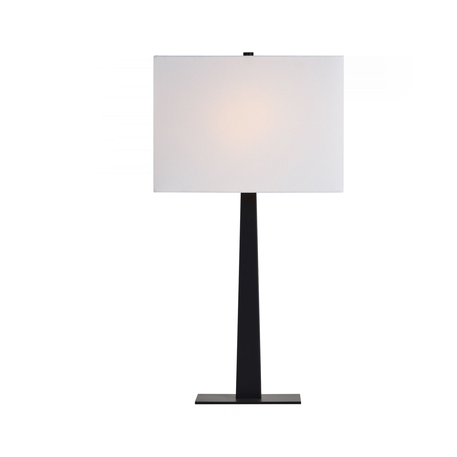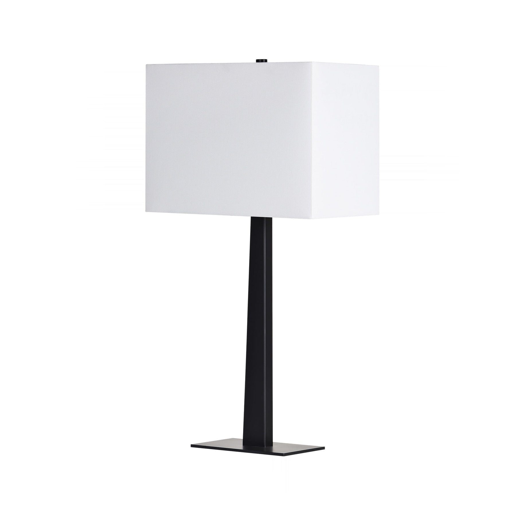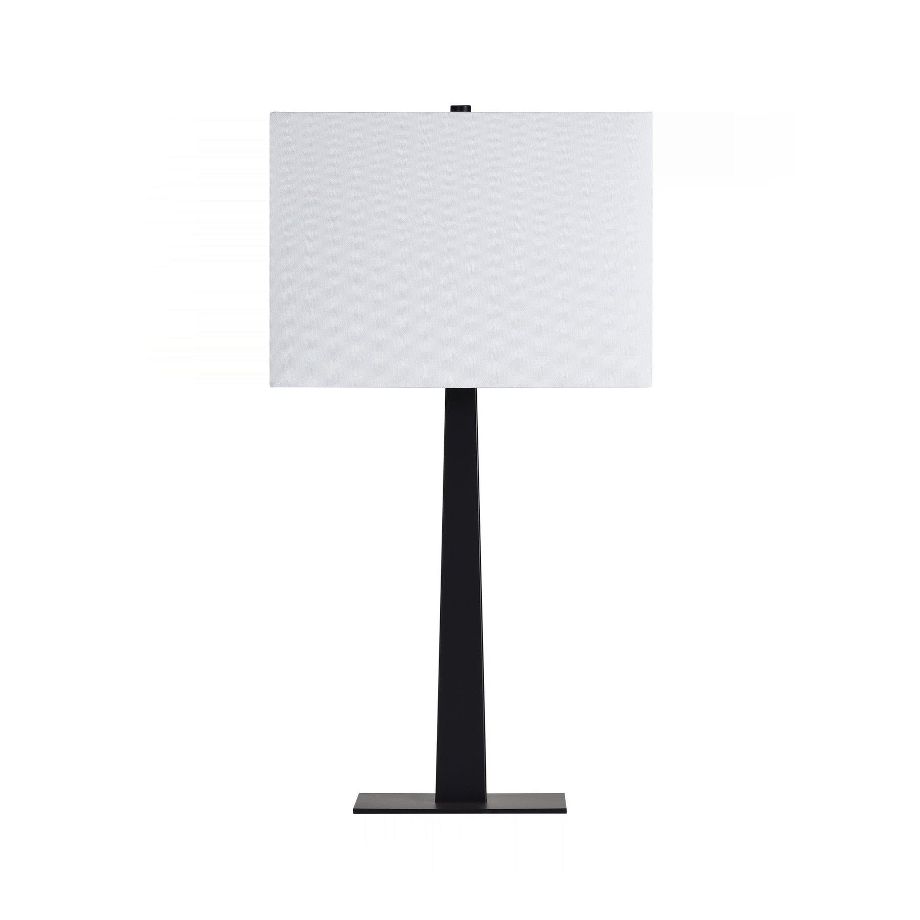 Striking vertical geometry defines this pair of table lamps, anchoring modern spaces with minimalist authority. The matte black pedestals rise to support crisp, rectilinear shades, offering dramatic visual contrast and strong architectural presence.