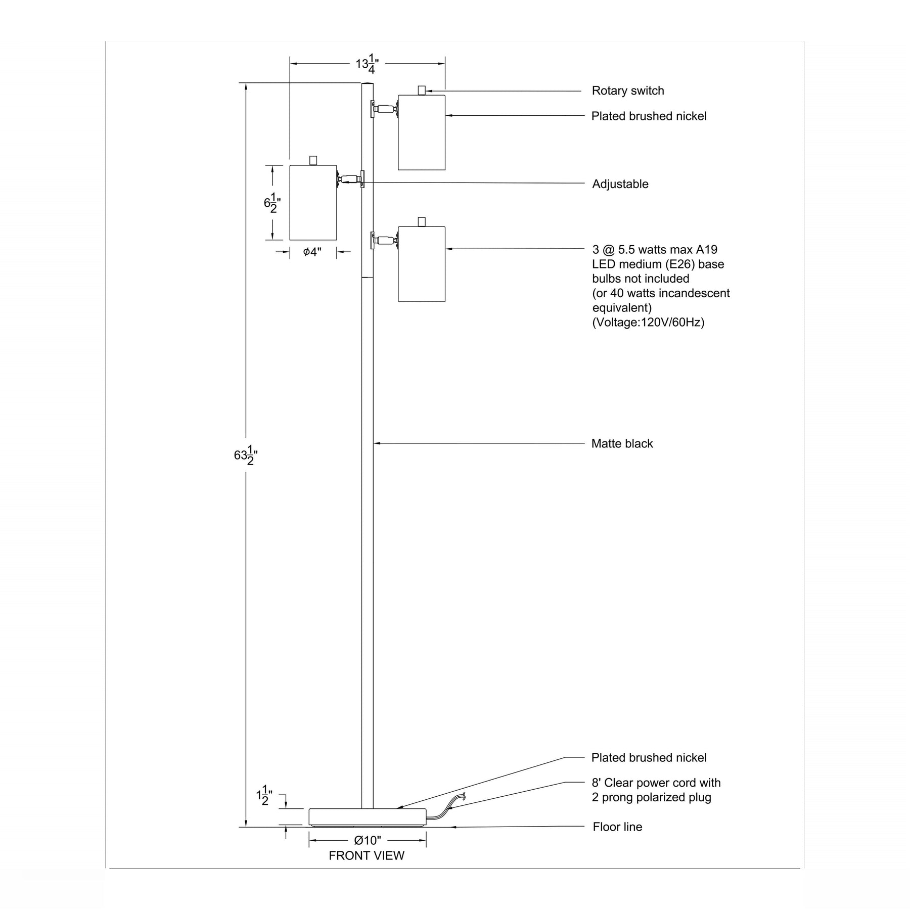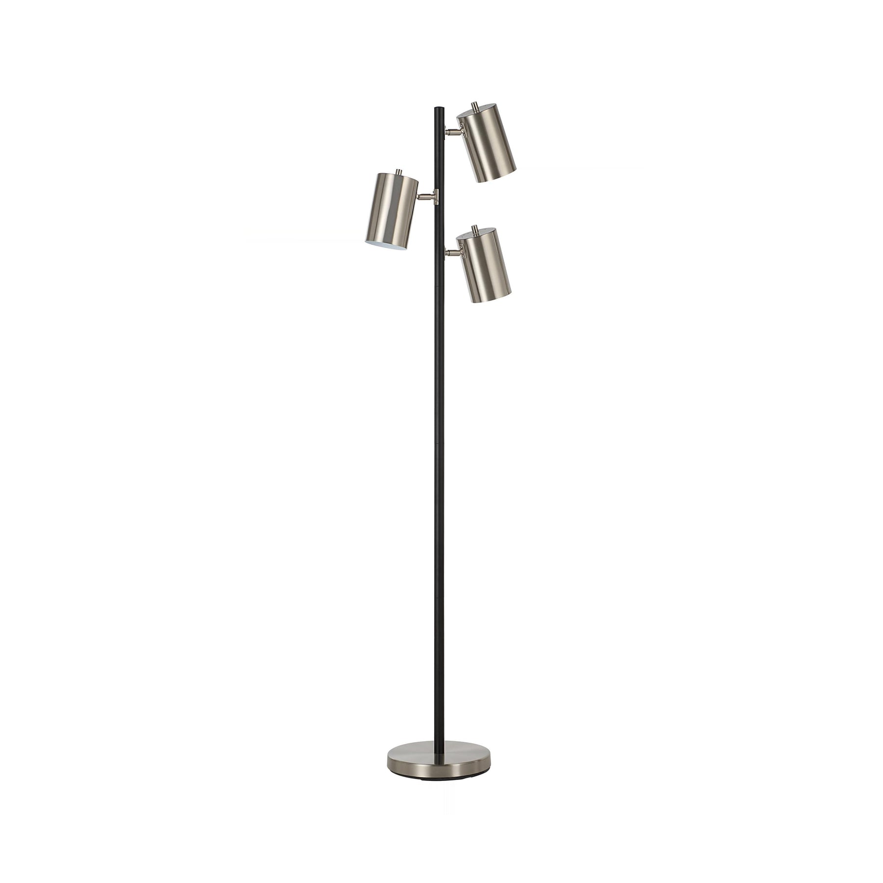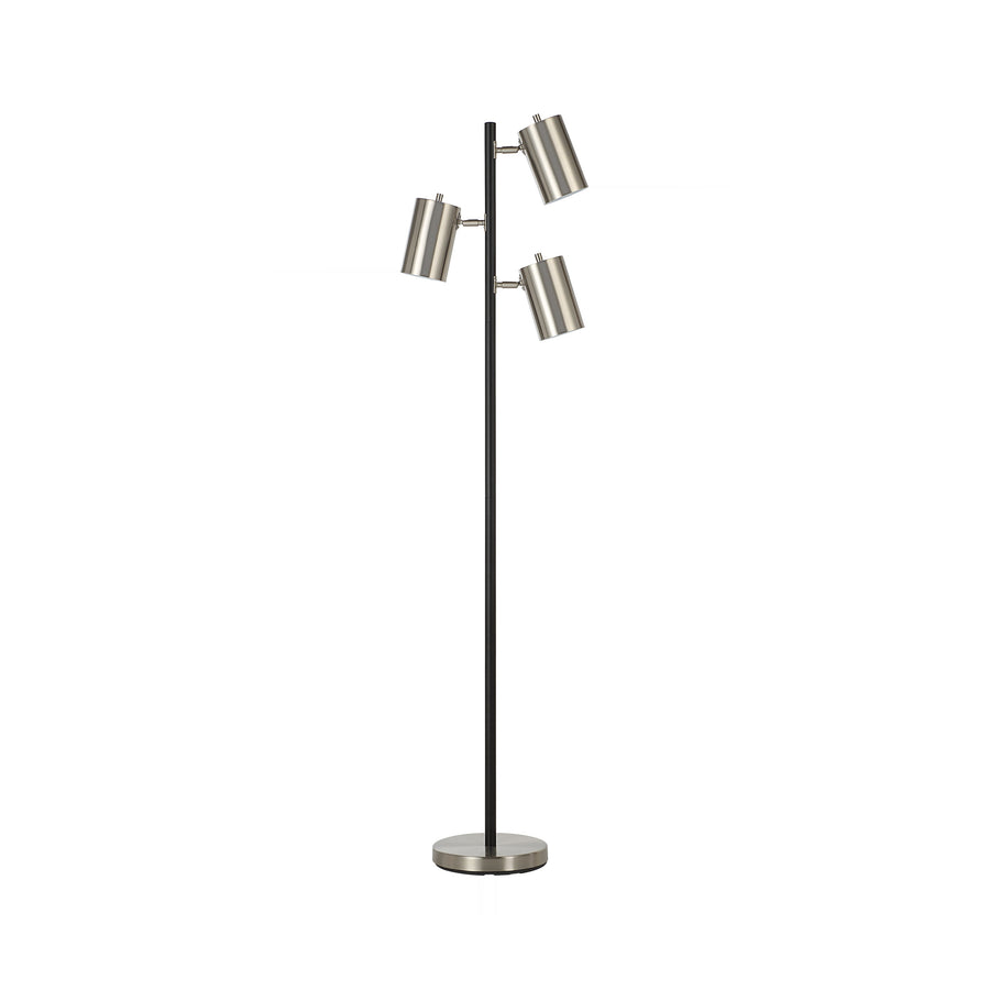 Industrial chic meets mid-century geometry in this striking three-light standard lamp. A sleek, dark iron column supports articulated cylindrical shades finished in polished nickel, achieving a sophisticated modern appeal.