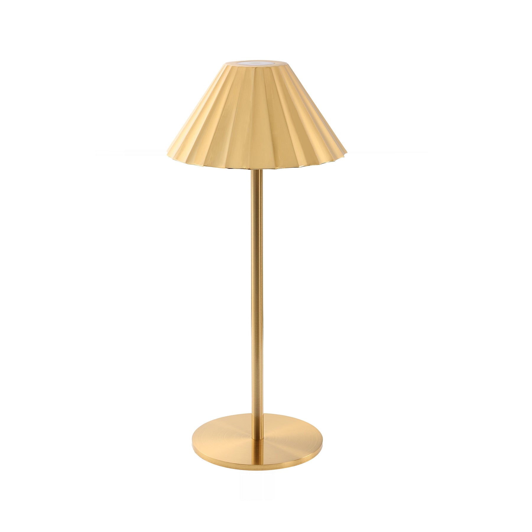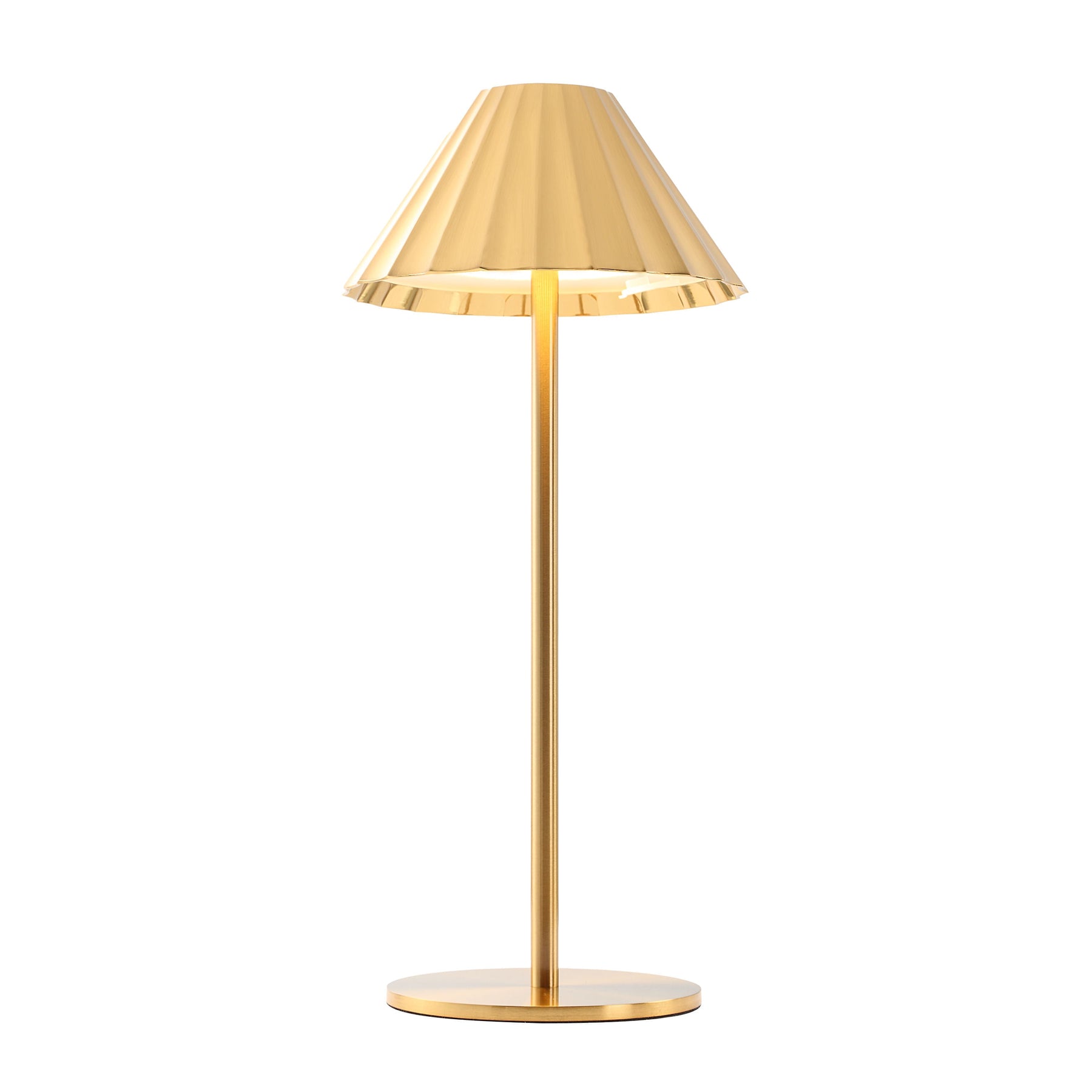 Gleaming gold nickel plating defines this slender fixture, crowned by a finely pleated acrylic diffuser that refracts light beautifully. Its streamlined silhouette brings contemporary refinement to side tables or shelving where cords are unwelcome.