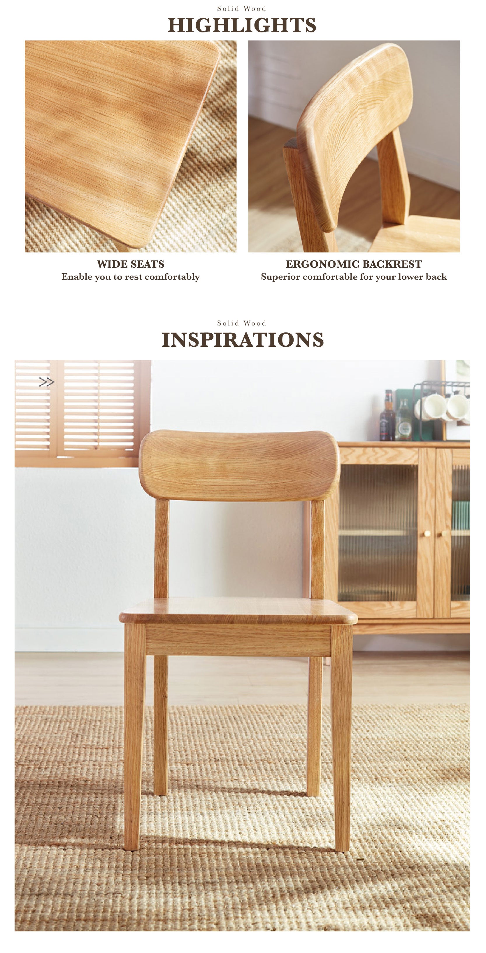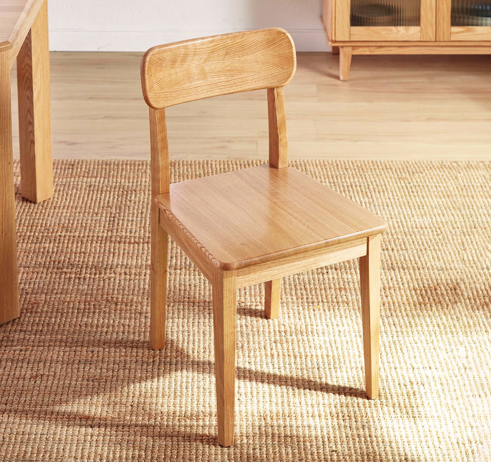 This dining chair is a superb fusion of Nordic aesthetics and functionality. Constructed entirely from premium oak wood, it boasts a natural, appealing grain that enhances its visual charm. The ergonomic design features a curved backrest that contours to the body, ensuring comfort during long meals or conversations. Its minimalist design and natural finish make it a versatile addition to any modern dining space, effortlessly blending with various decor styles.