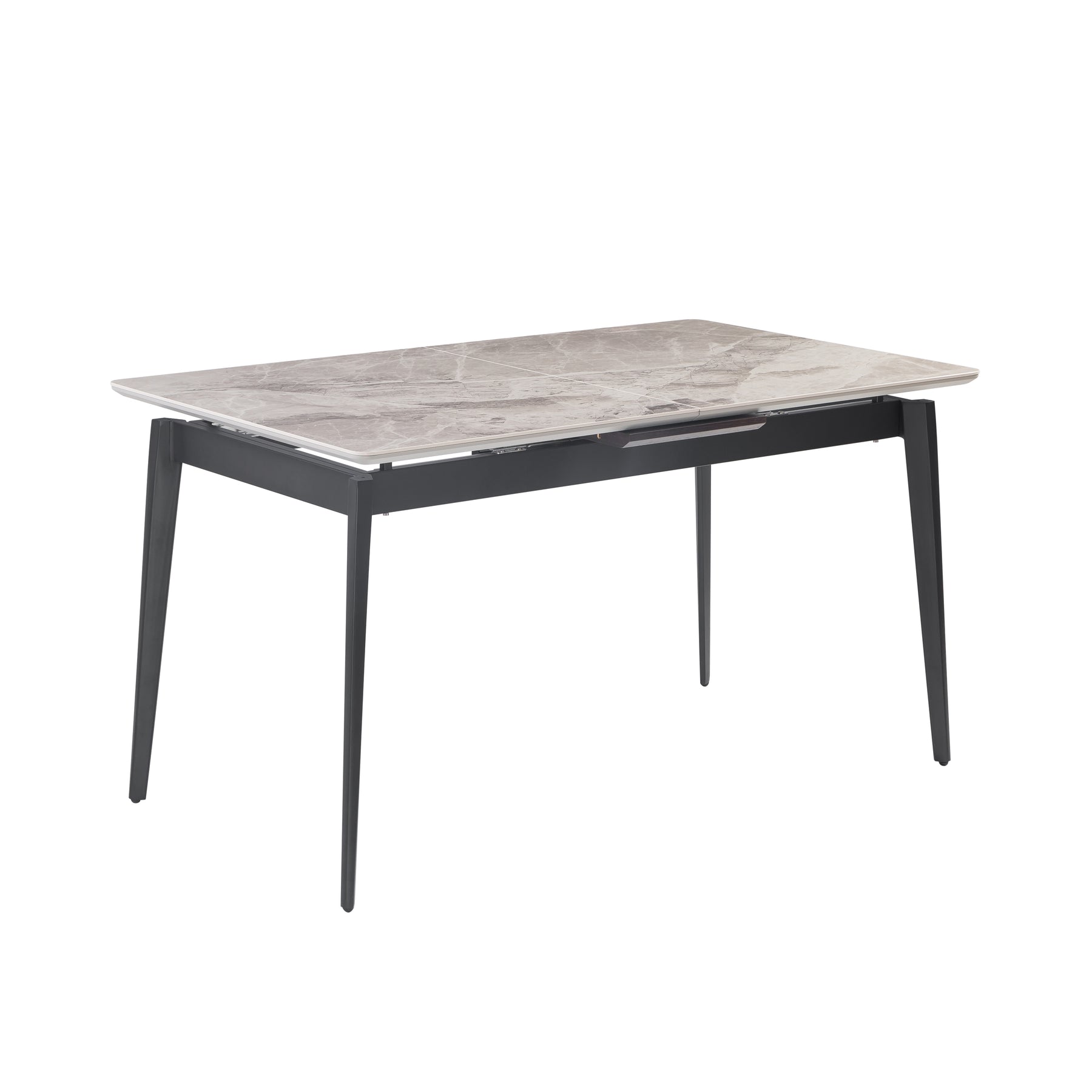 A hidden wood panel effortlessly extends the table, offering flexible seating for guests without compromising its streamlined design. Supported by tapered metal legs, this extendable dining table is built for stability and enduring elegance.