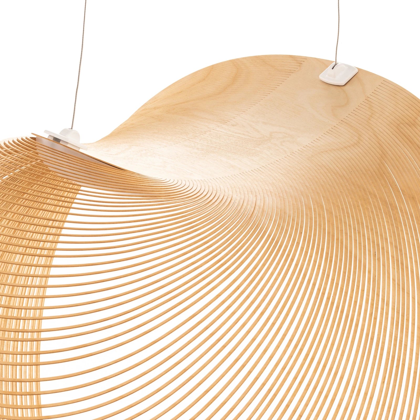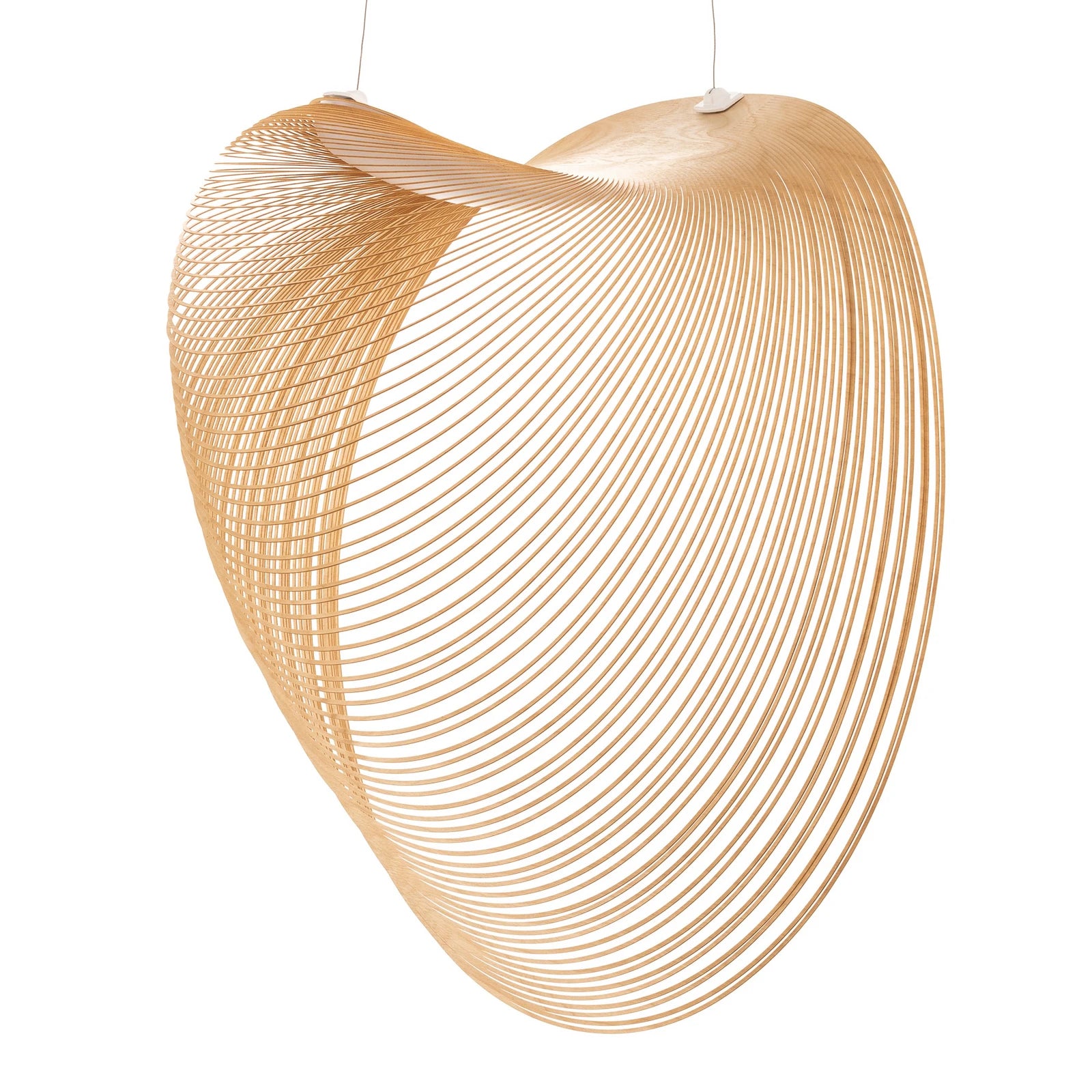 Sculptural wooden pendant lamp features an exquisite spiral design crafted from flexible wood veneer. This modern lighting fixture's organic, wavy form creates dynamic visual interest, establishing a striking focal point for contemporary interiors.