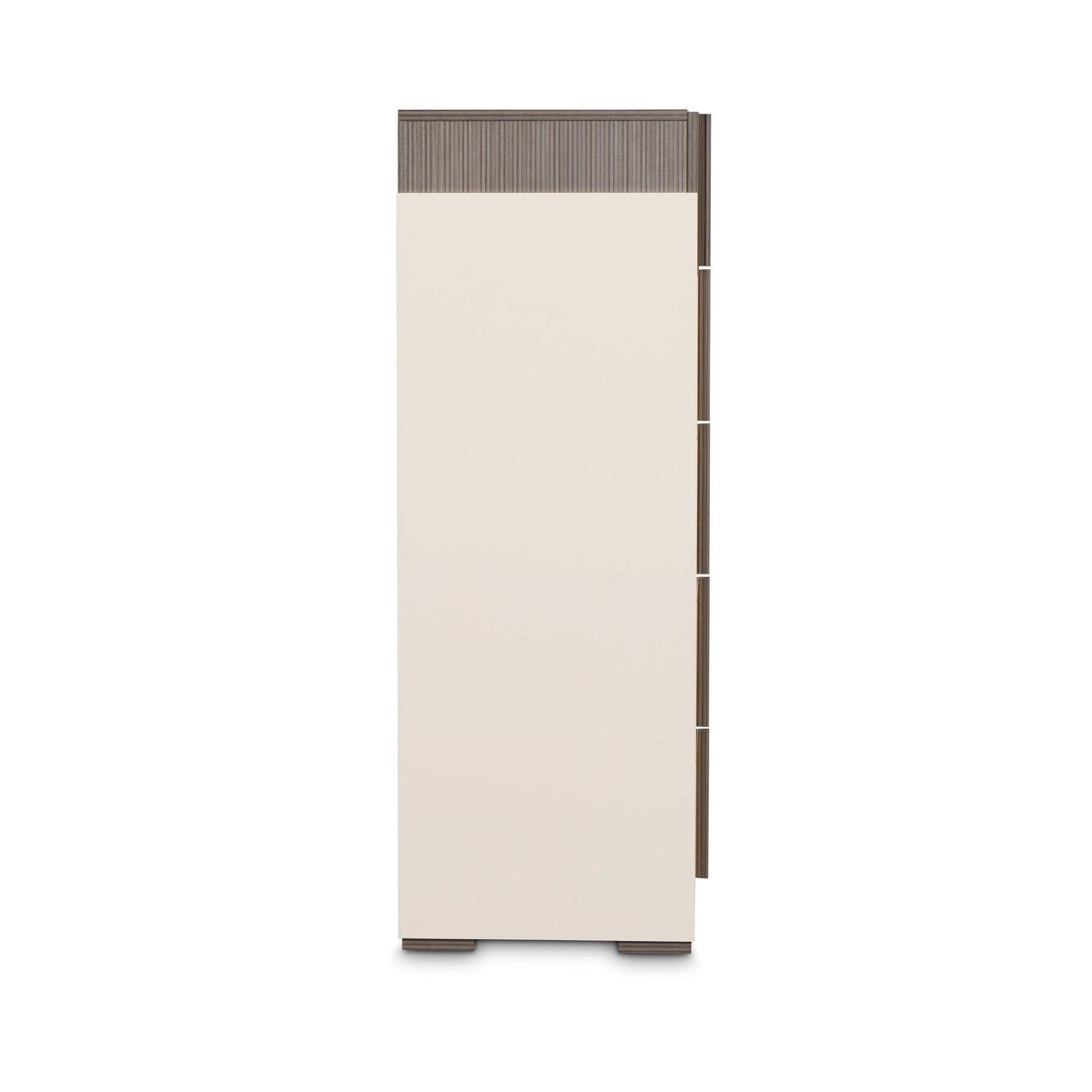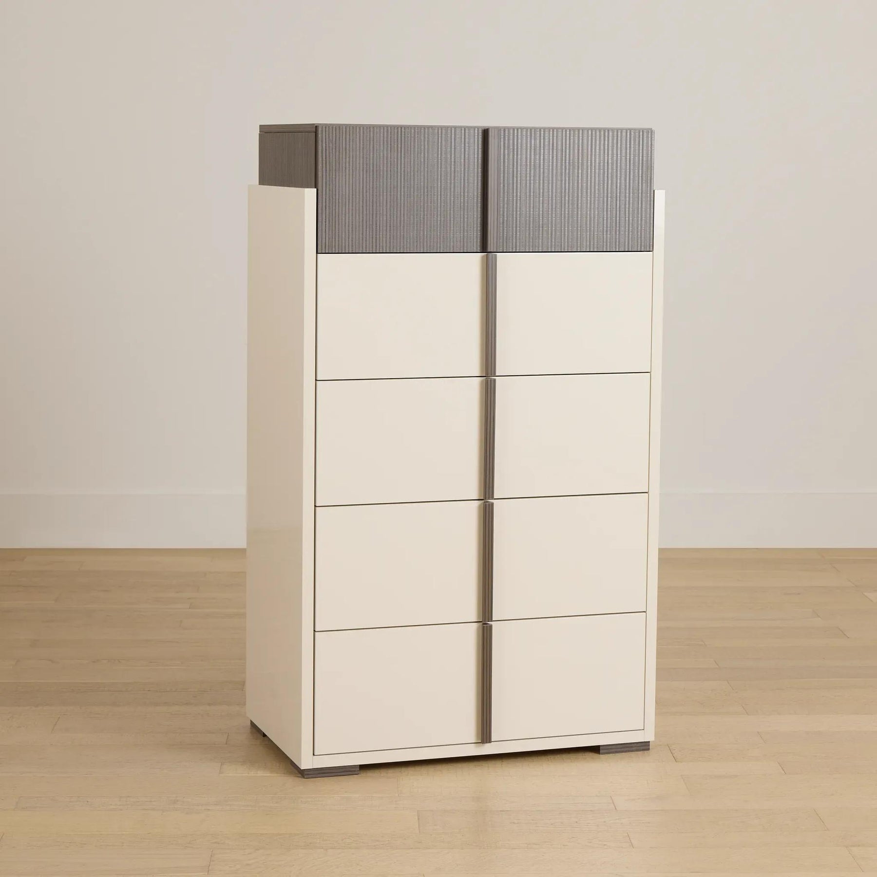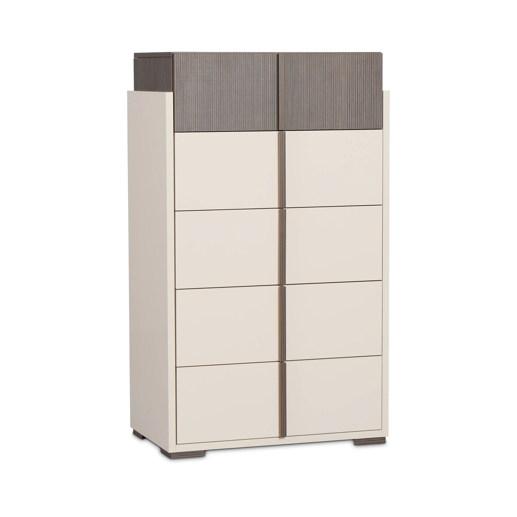 The Livia Chest offers an elegant blend of style and utility, featuring a sleek Hazel Taupe finish and glossy drawer fronts. Its vertical design maximizes storage without compromising floor space, making it ideal for contemporary bedrooms.
