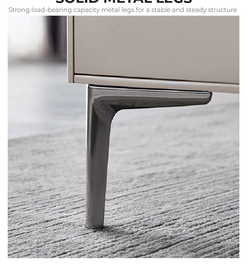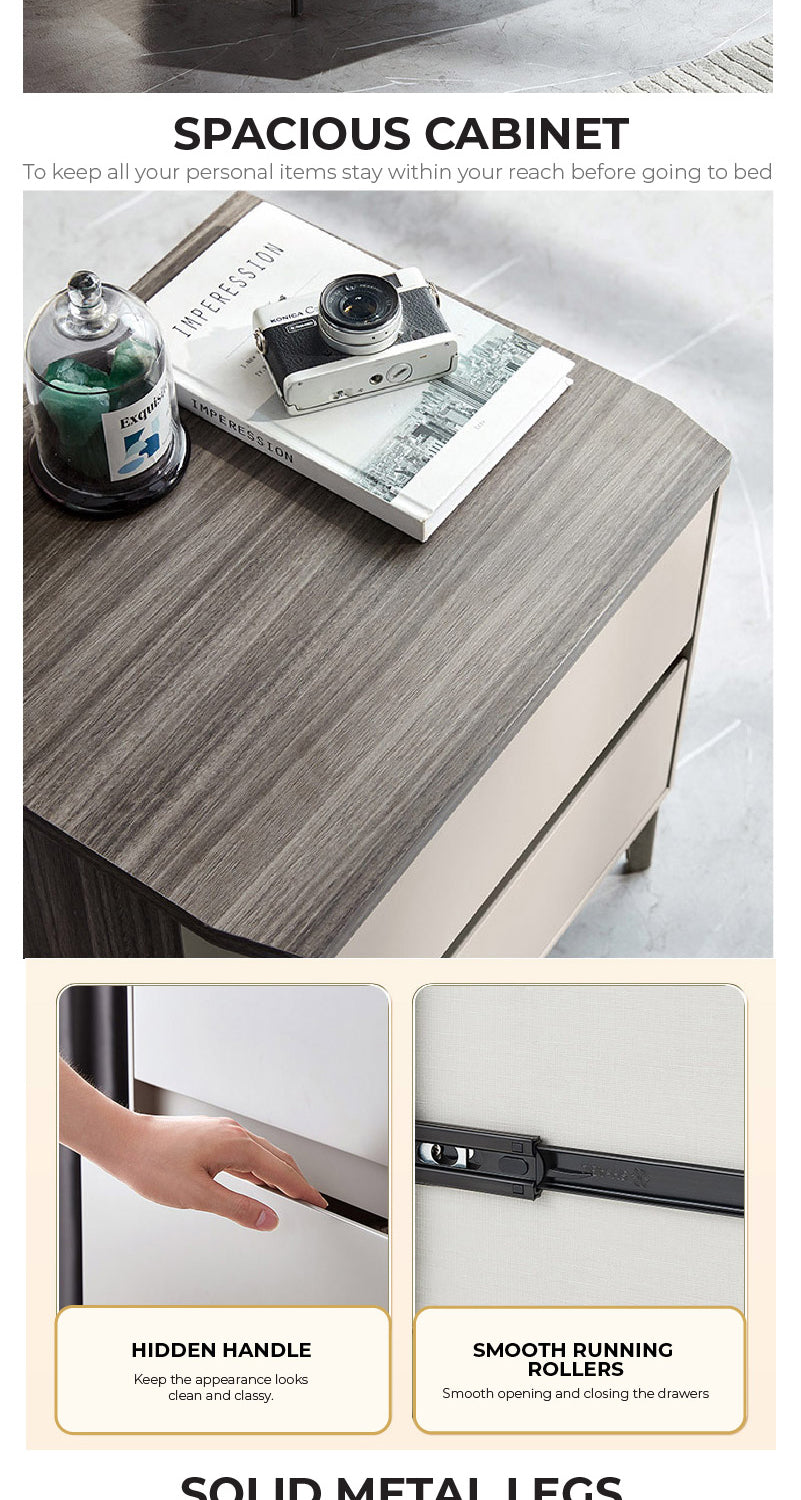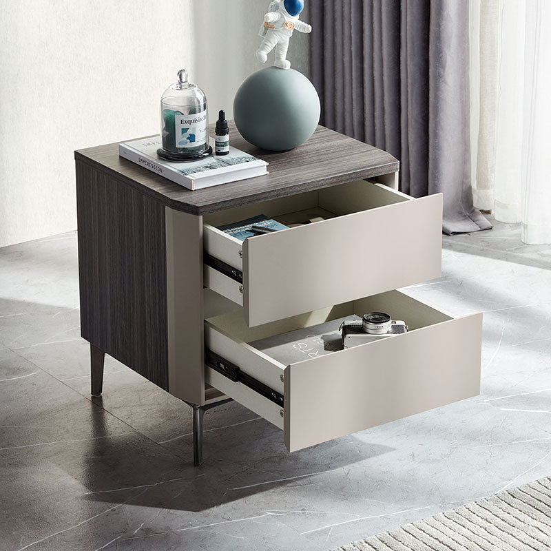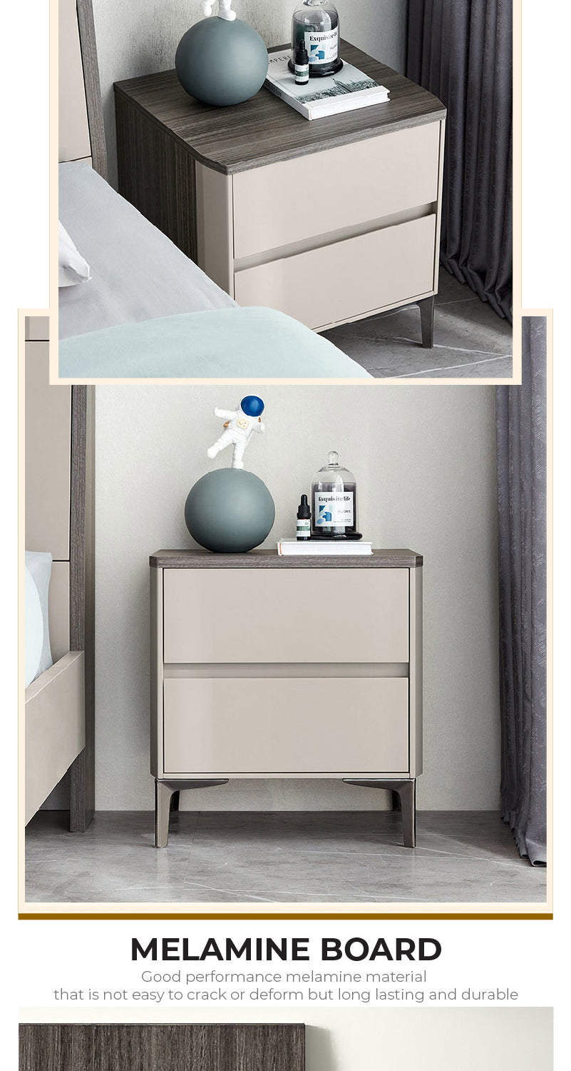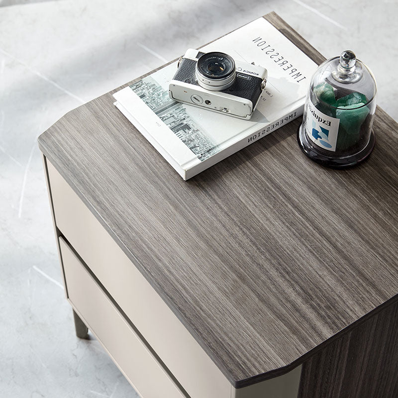 This light khaki nightstand captures the essence of minimalist elegance with its clean lines and subtle color palette. The textured wood grain finish paired with the smooth, matte drawer fronts offers a contemporary twist on classic design, making it a versatile addition to any bedroom.