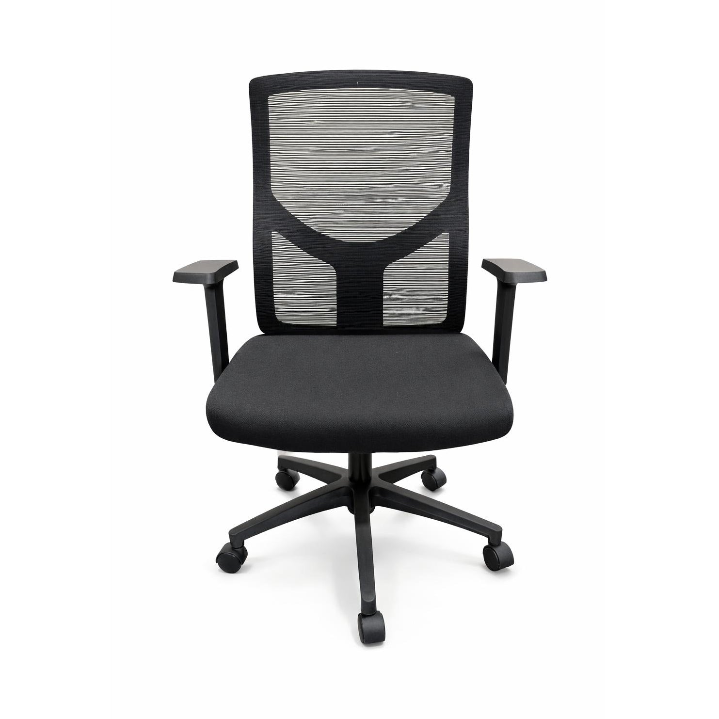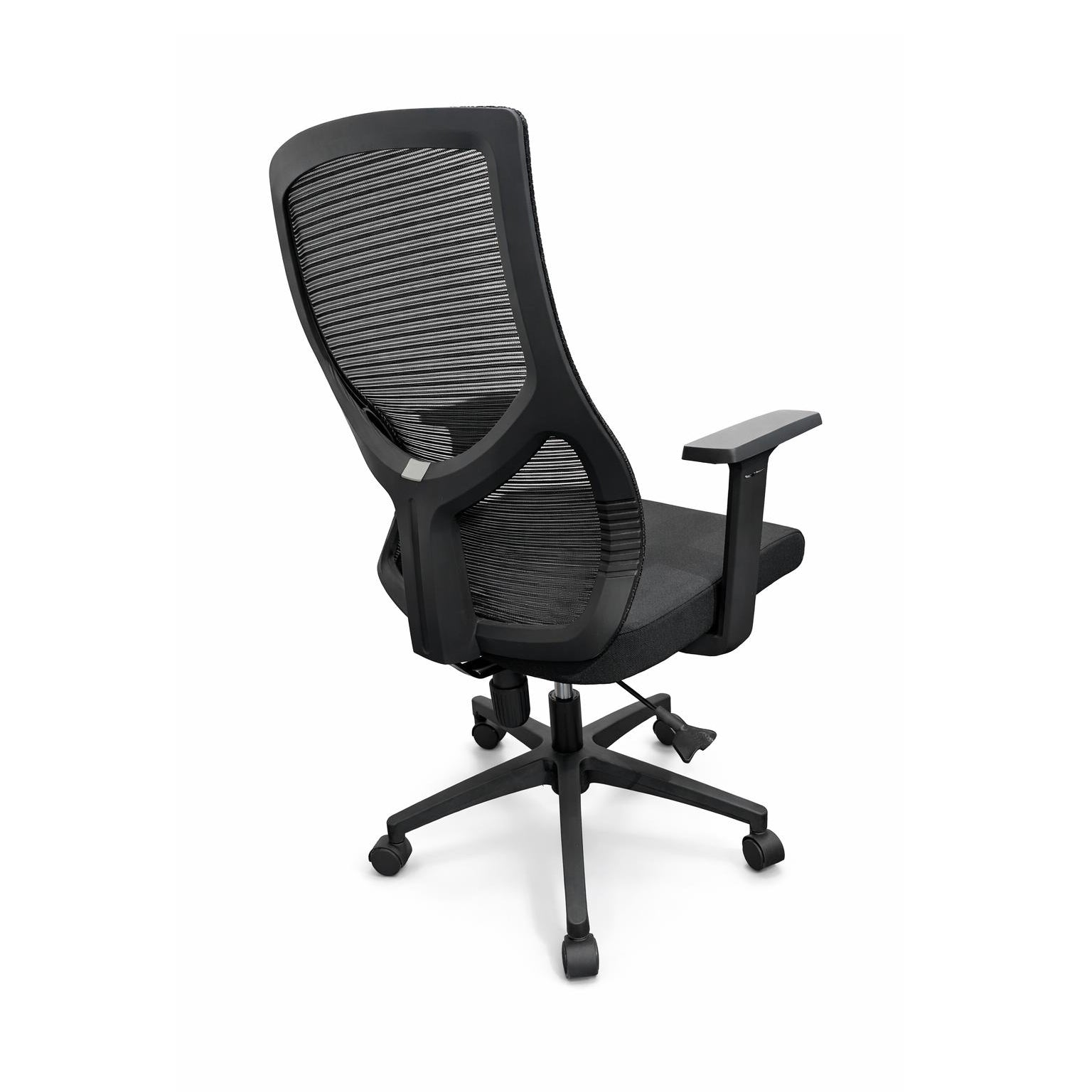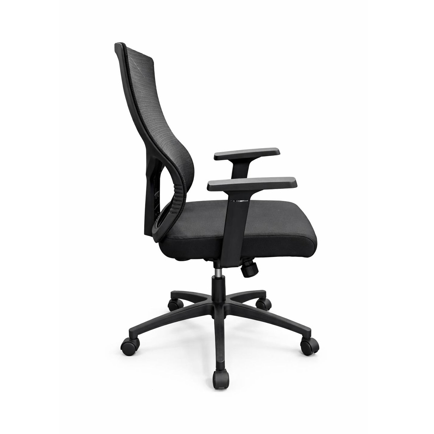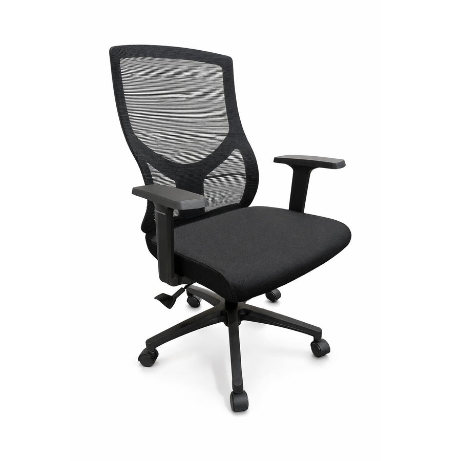 Hydraulic lift-up black office chair with breathable mesh back and padded fabric seat for long-session comfort. Contoured lumbar support and adjustable armrests combine ergonomic function with a sleek modern silhouette in matte black.