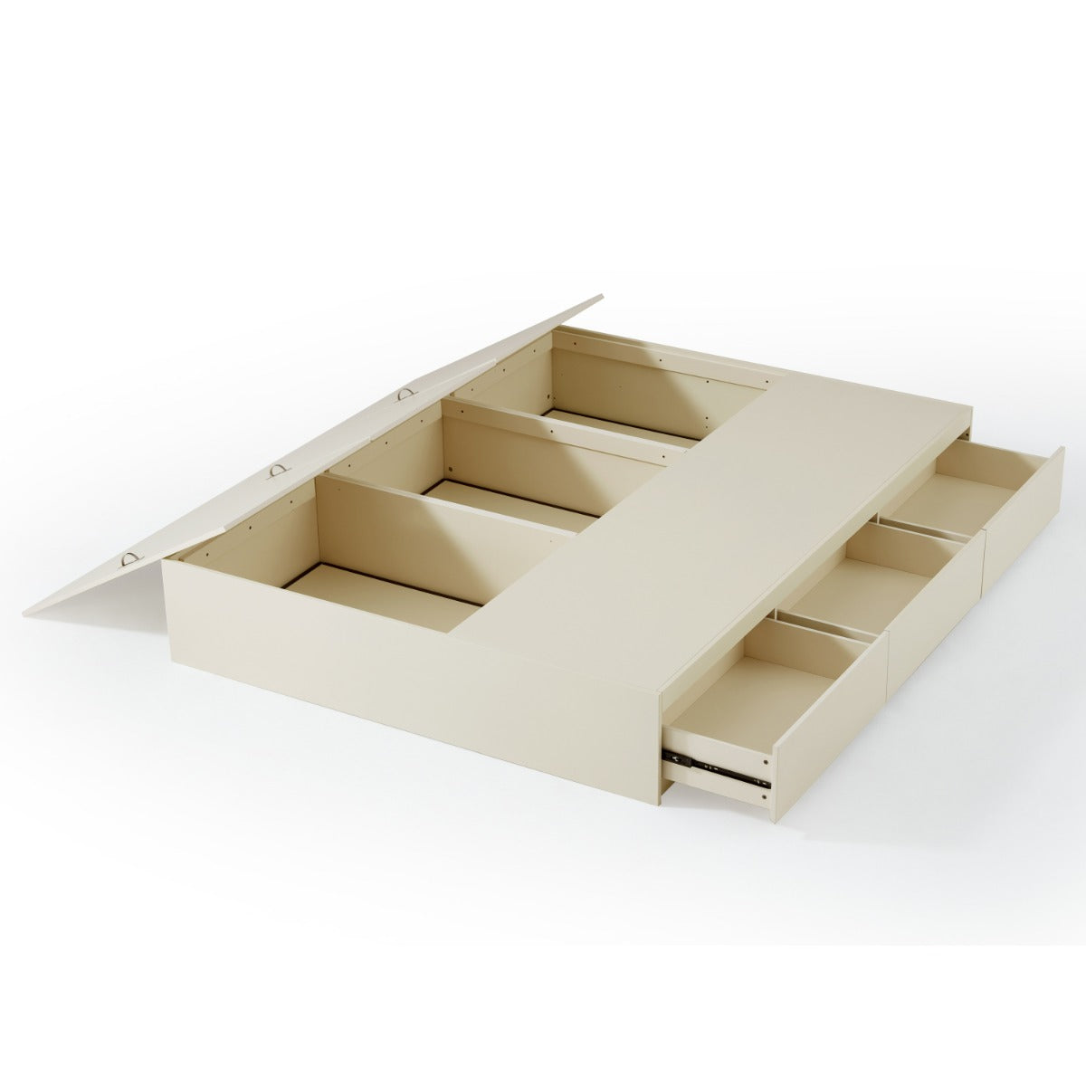 Platform bed with three lift-top compartments and three smooth-closing drawers combines a low-profile wooden frame and flat wooden base for a sleek, modern look. The warm wood finish and clean lines suit contemporary interiors.