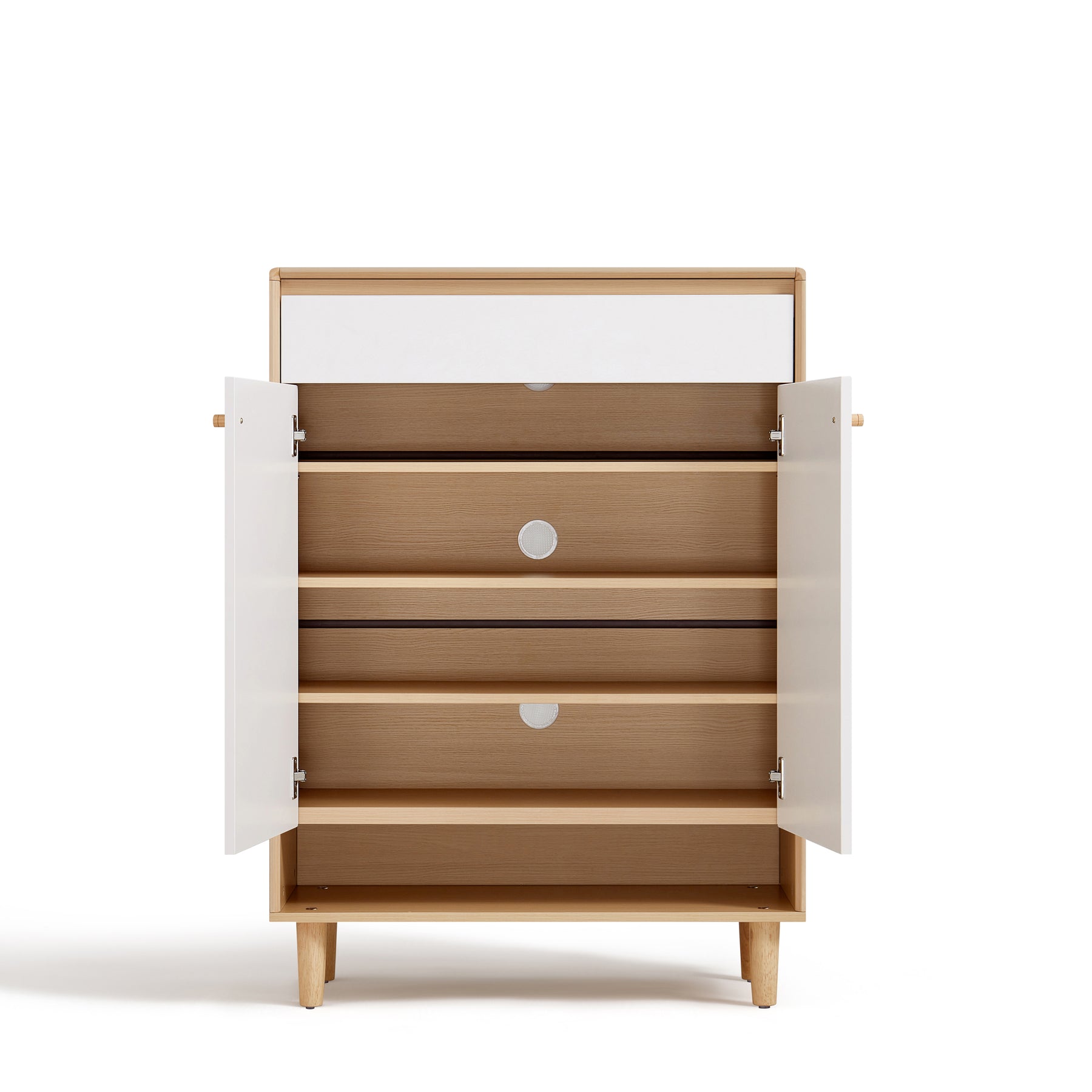 Features two-door storage and a dust-protecting drawer under a durable melamine top with a smooth matte finish. Ventilated mesh panels prevent odour and moisture while internal shelving offers organized shoe storage.