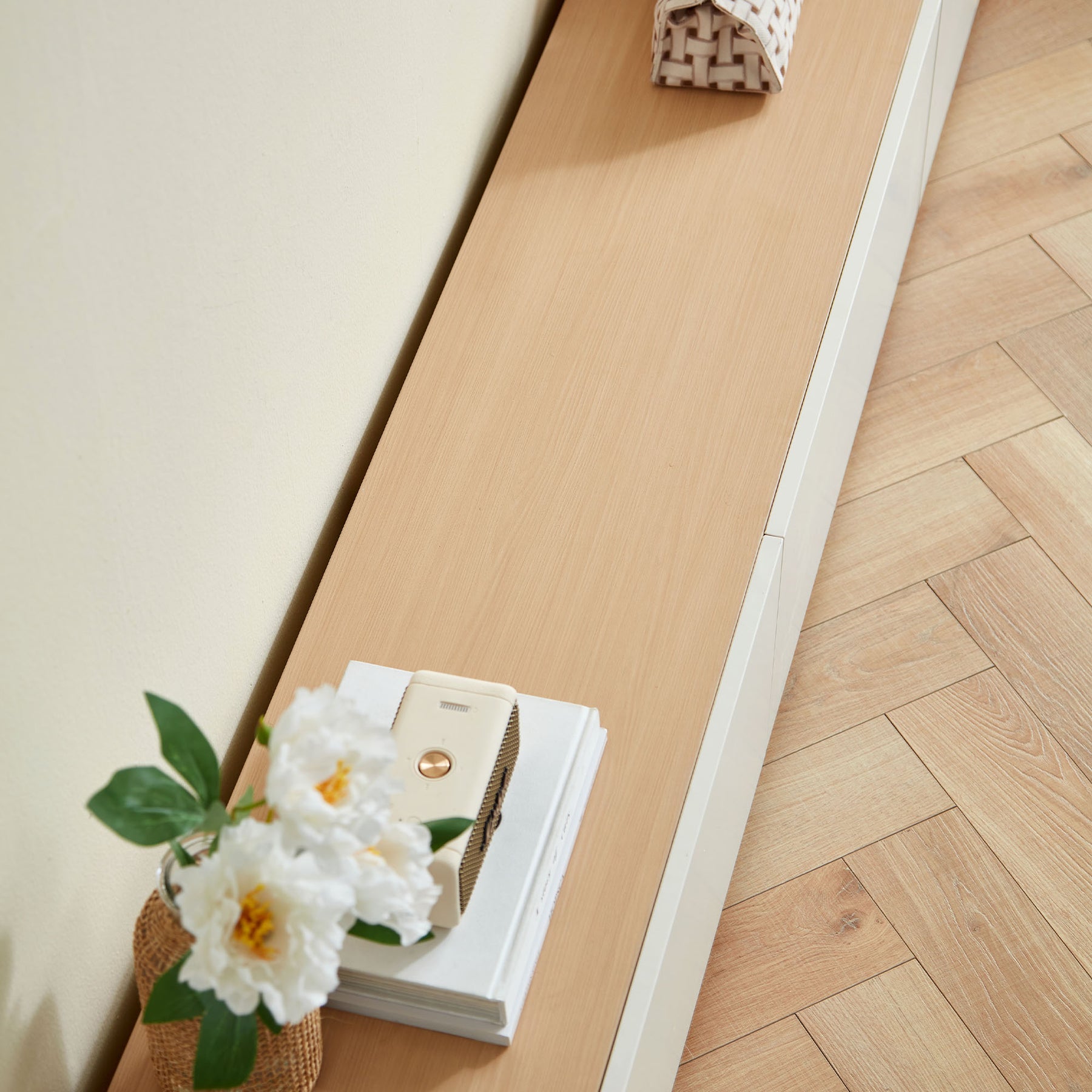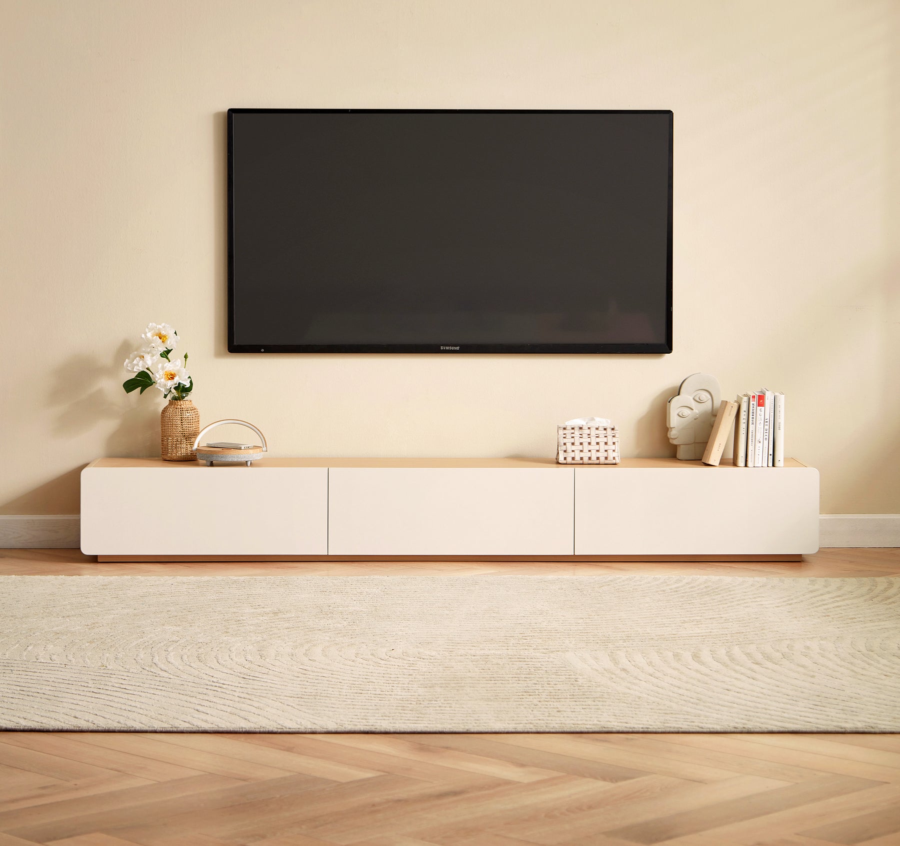 Floor-standing, low-profile silhouette provides stable support and sleek living-room styling; ideal as a modern TV cabinet, media console or hallway console with practical, dust-resistant storage. Durable melamine finish resists scratches and stains, suiting minimalist, Scandinavian and contemporary interiors while requiring minimal upkeep.