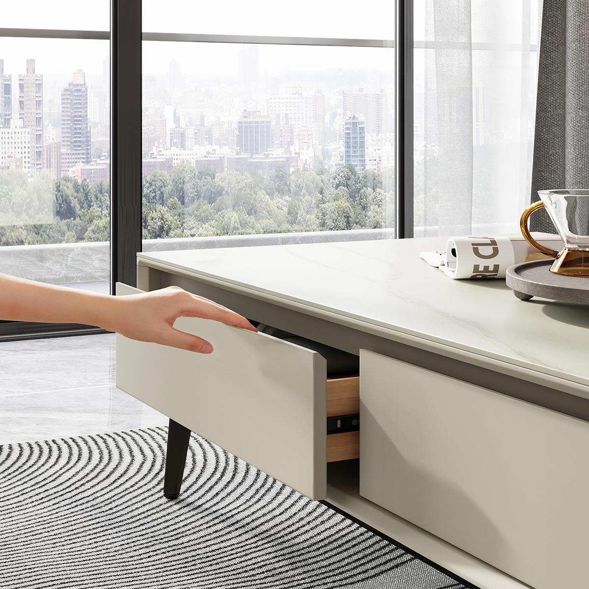 Angled Matte Black Base:Provides strong structural support and a striking visual lift, enhancing the table's contemporary mid-century influence. Concealed Push-to-Open Drawers:Seamless facade maintains the minimalist design while offering ample, discreet storage capacity for media or décor. Smooth Lacquer Finish:Durable, low-maintenance surface in a soft, creamy white hue that resists scuffs and brightens the room.
